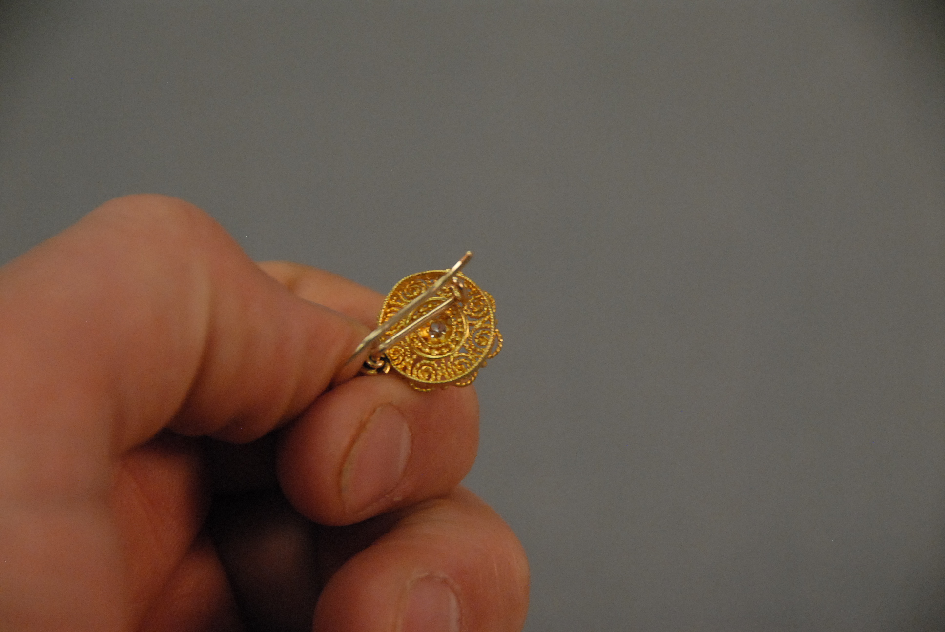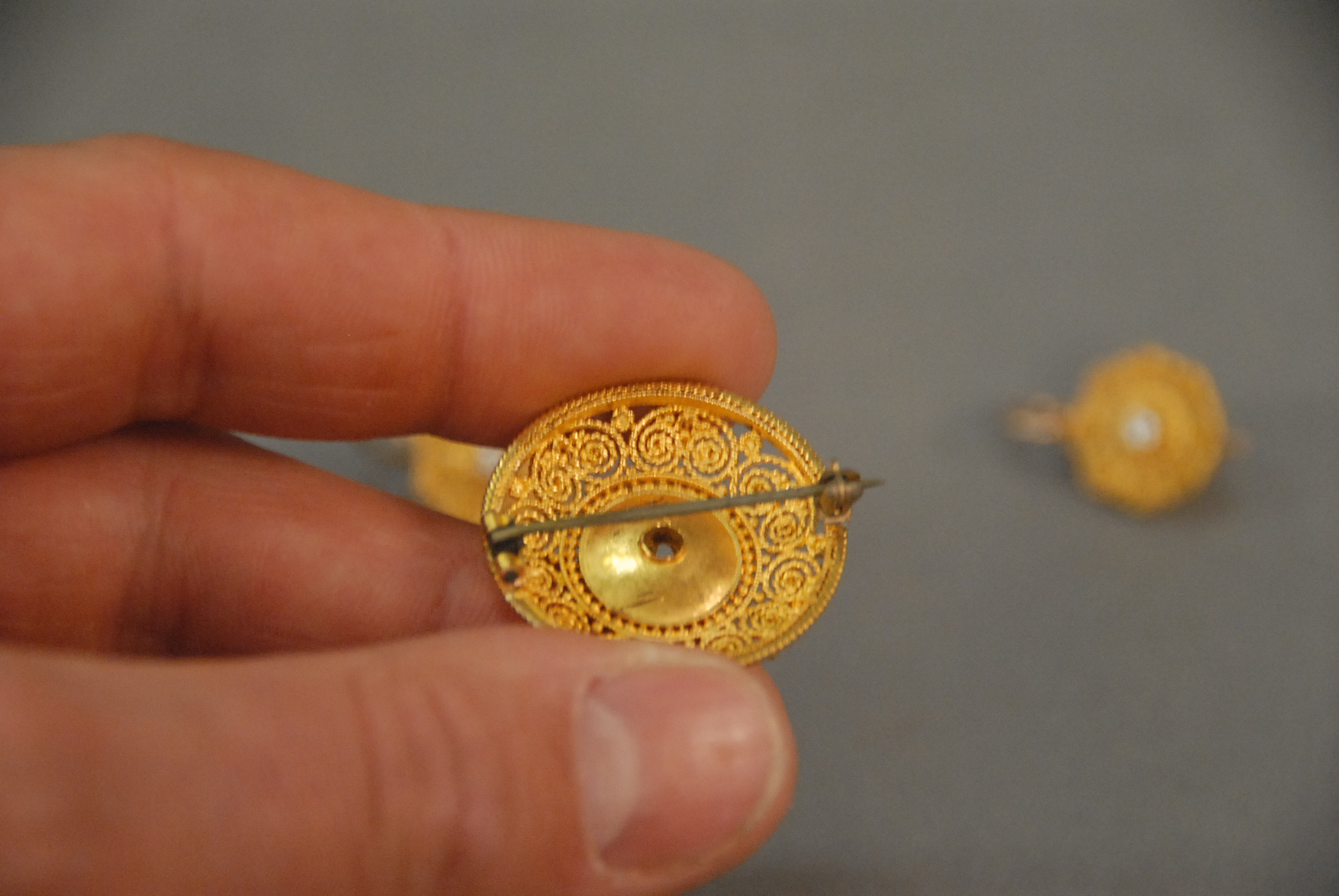 14K gold three piece earring and pin, each set with single diamond. 11.2 grams