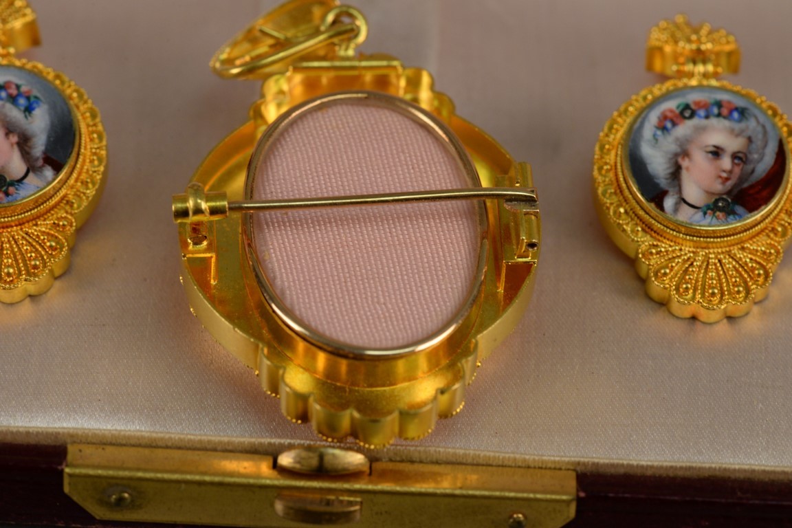 18K-20K and French enamel suite comprising of a brooch and a pair of earrings, each having enameled portrait of maiden mounted with jewels, set on a carved backing, sold by Starr & Marcus N.Y. in original leather box three small jewels missing.