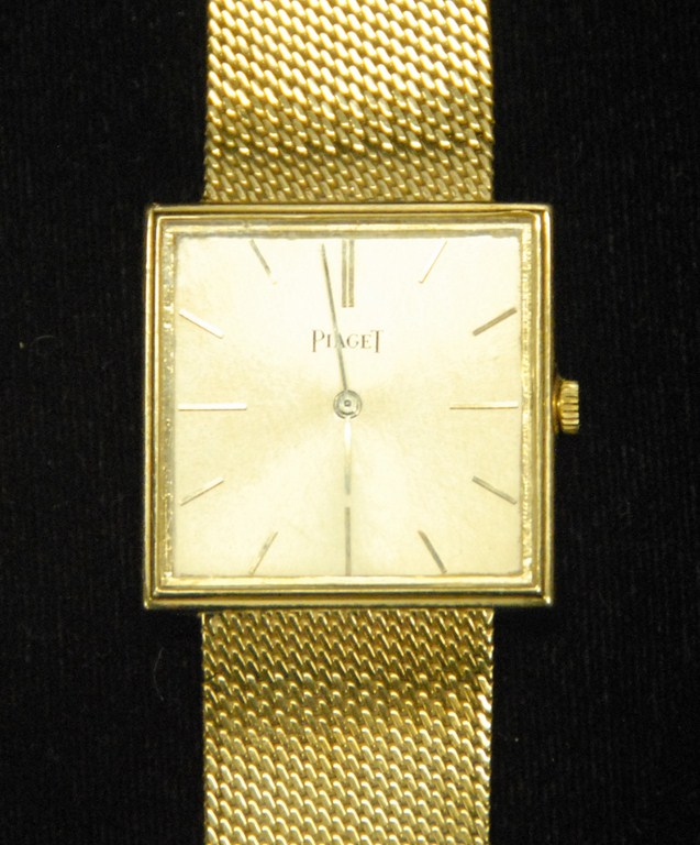 Lot 26: 18K gold Piaget man’s wristwatch with square face and mesh 18K gold band stamped 750 Piaget Modele Depose and inscribed on back. Pro…