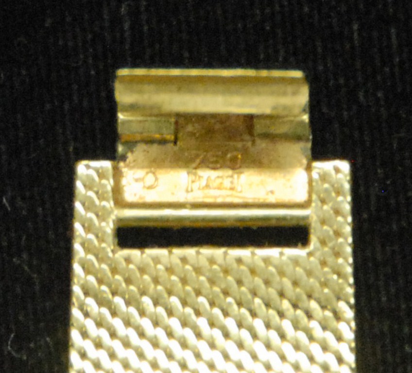 18K gold Piaget man’s wristwatch with square face and mesh 18K gold band stamped 750 Piaget Modele Depose and inscribed on back. Provenance: Estate of Judy McDonough Gengras of Stoner Drive, West Hartford, Connecticut. 55.3 grams total weight
