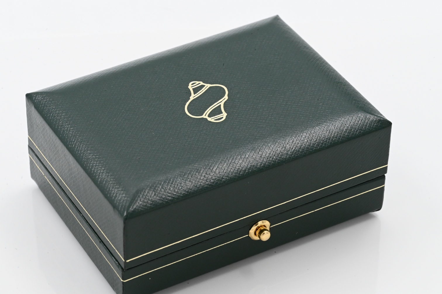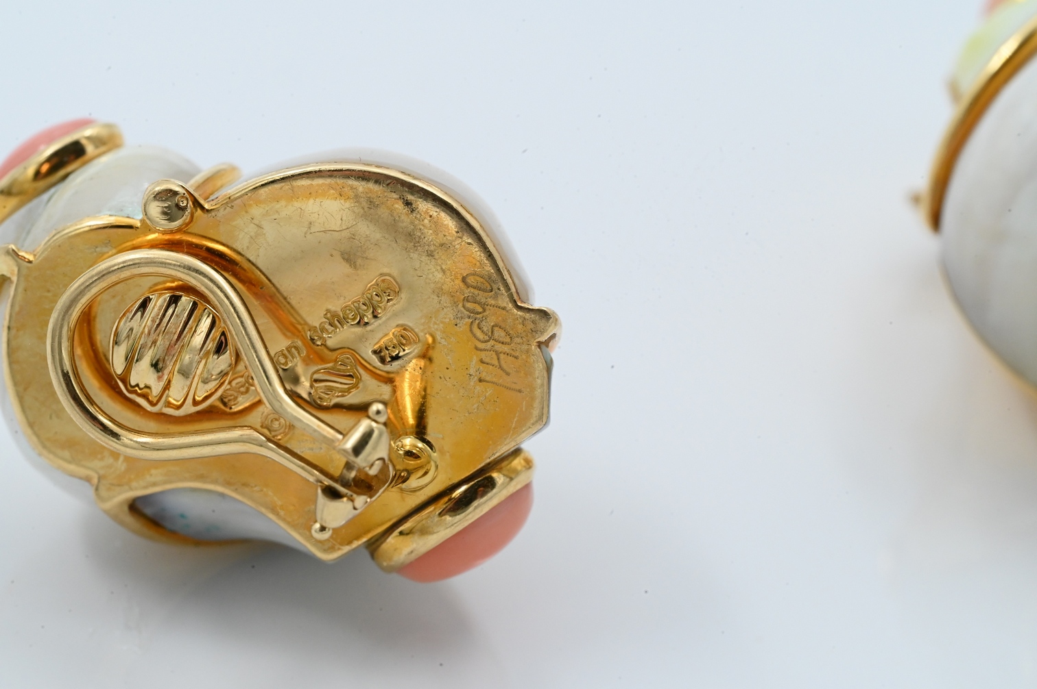 made of shell decorated with cabochon coral, marked Seaman Schepps 750, with original box