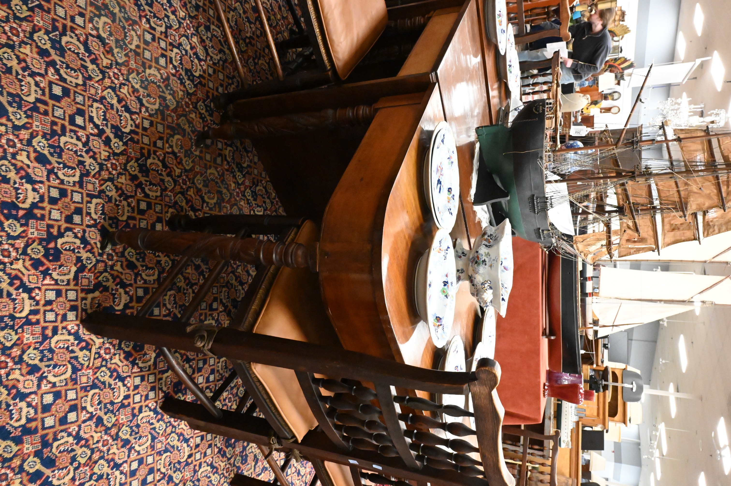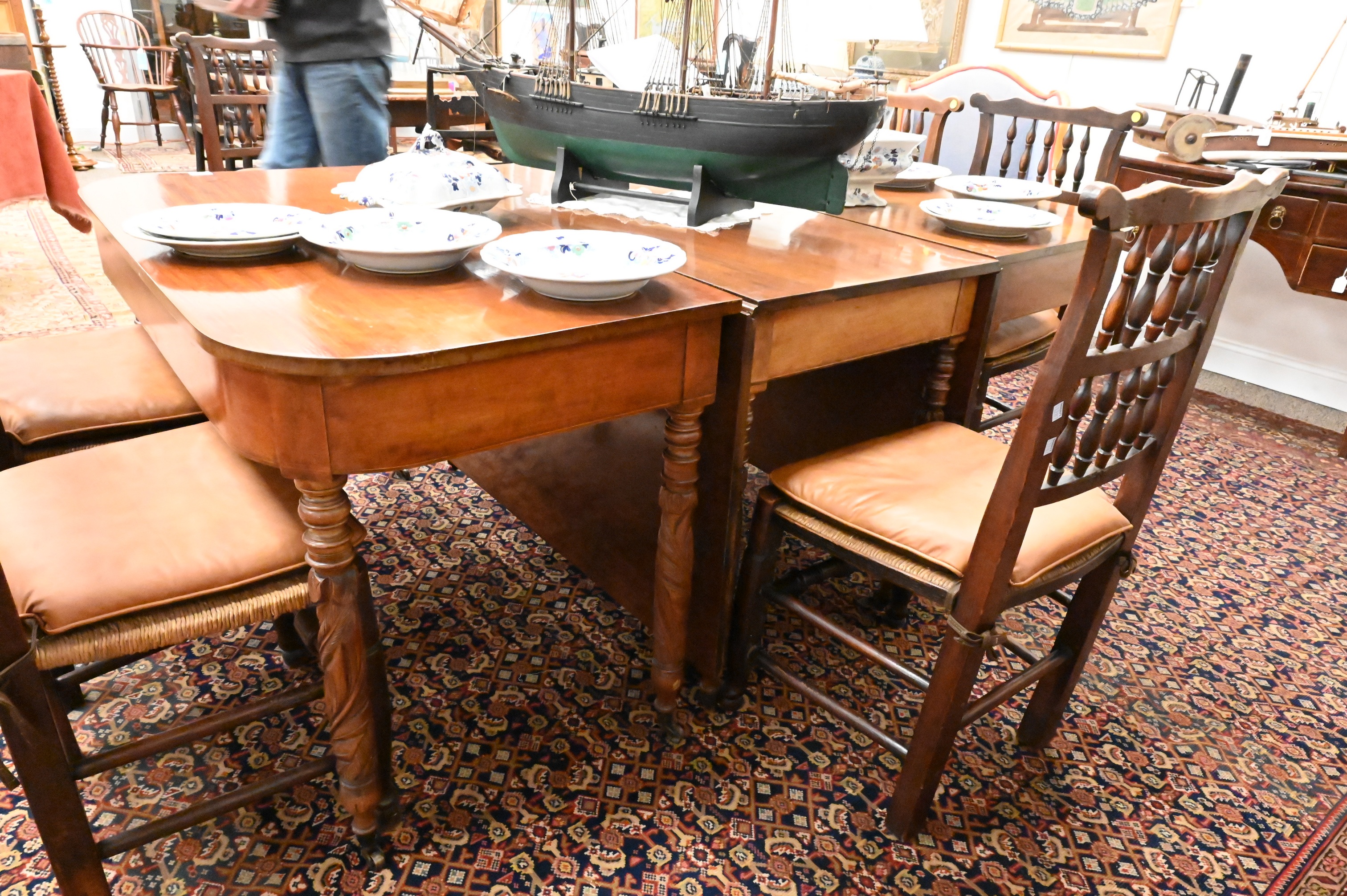three-section dining table with D-shaped ends, raised on turned and acanthus-carved legs ending in brass caps with brass casters, warm brown finish with expected surface wear.