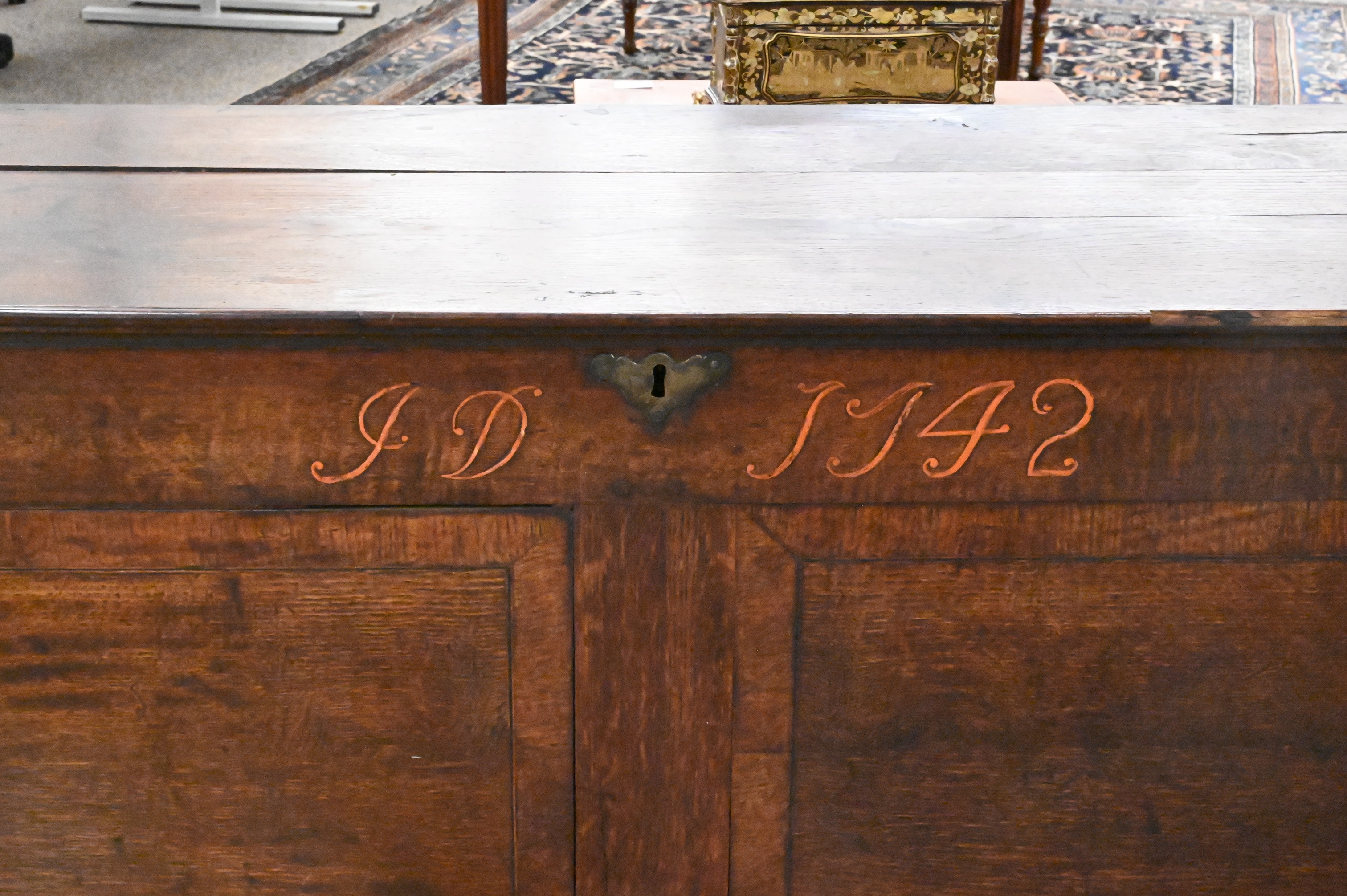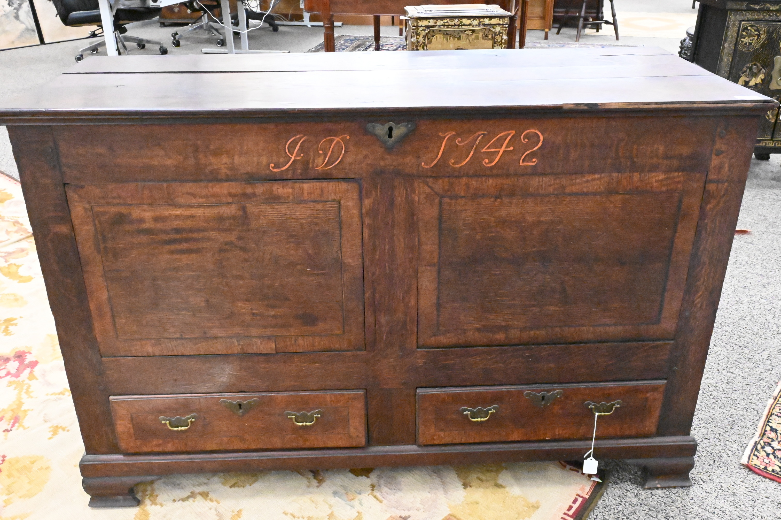 the rectangular hinged top opening to a well above a case fitted with two molded panel doors and three drawers below, raised on shaped bracket feet; the front carved with initials I.D. and date 1742. Retains old surface with warm patina. 18th Century