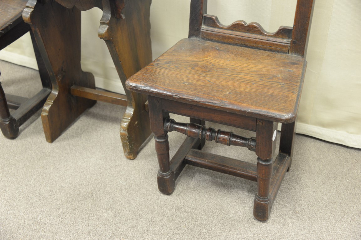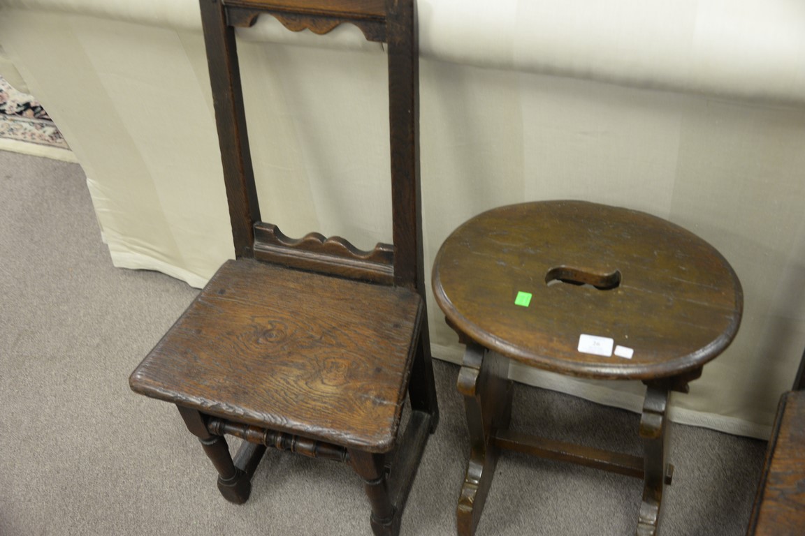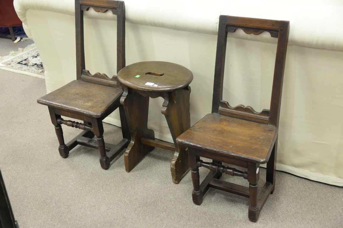 Lot 26: Continental three piece group to include a pair of small chestnut chairs and a tressel stool one brass trim missing. chair: ht. 32…