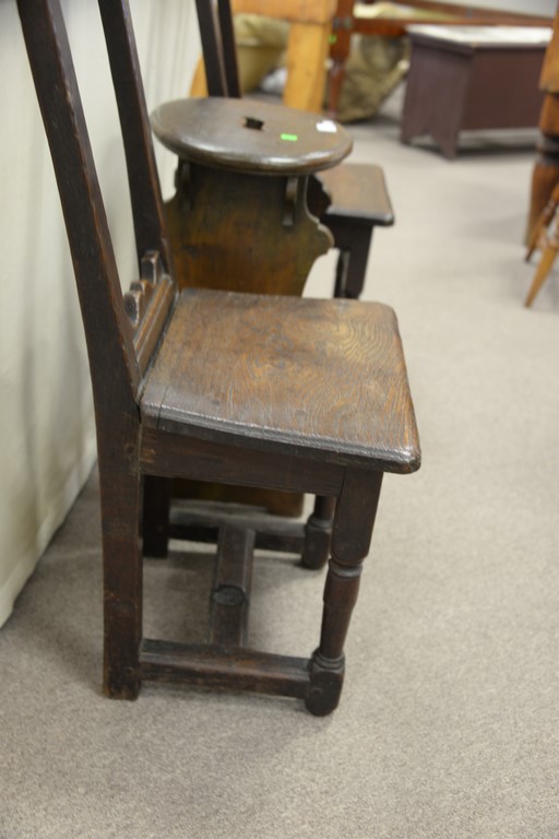 Continental three piece group to include a pair of small chestnut chairs and a tressel stool one brass trim missing. chair: ht. 32 1/2in. stool: ht. 22in., top: 11 x 16