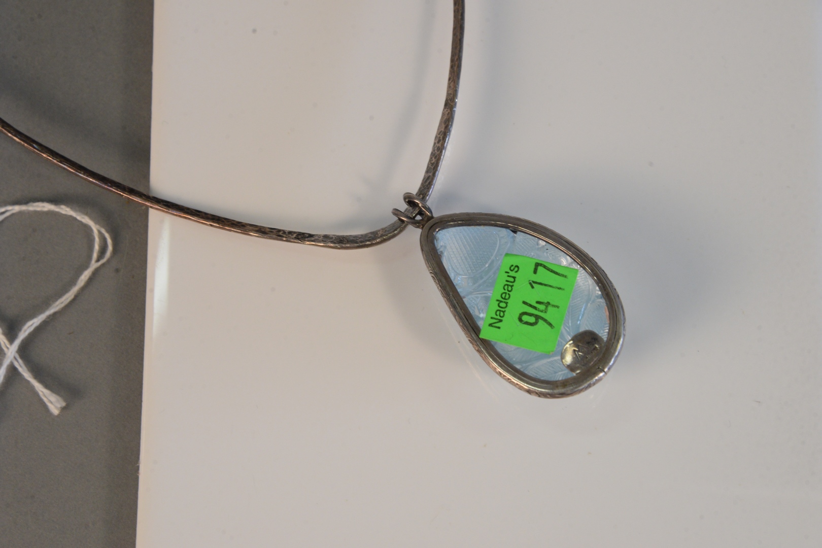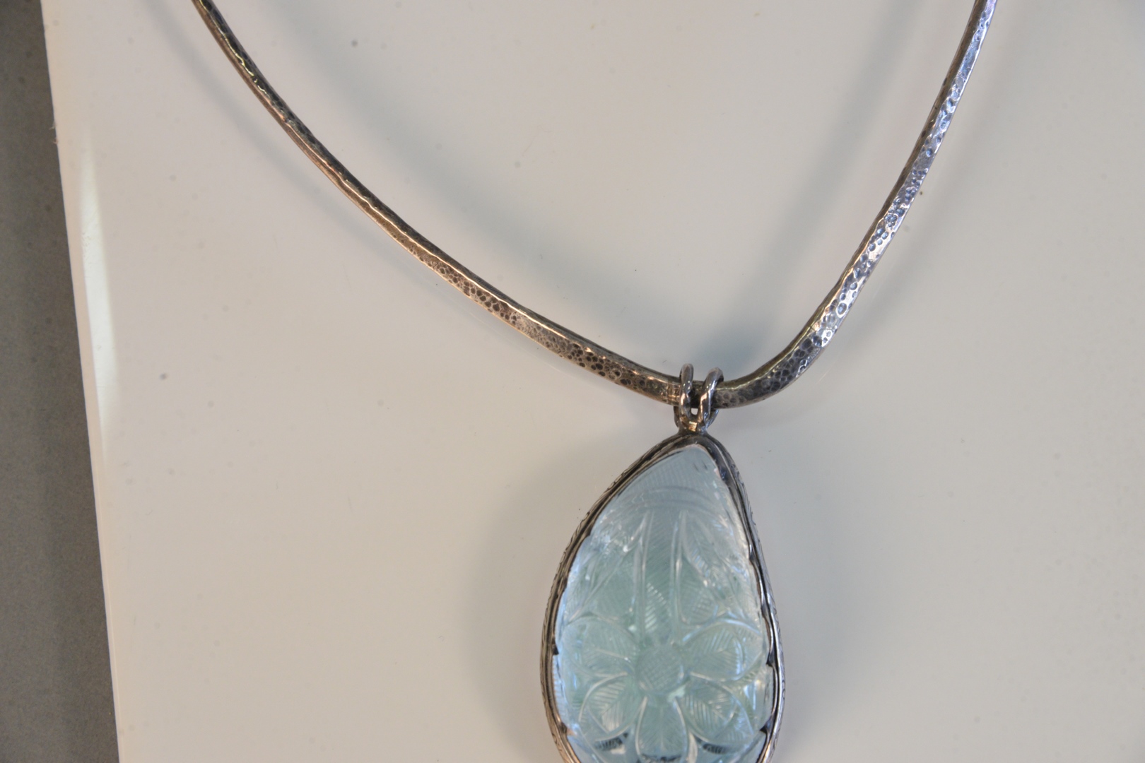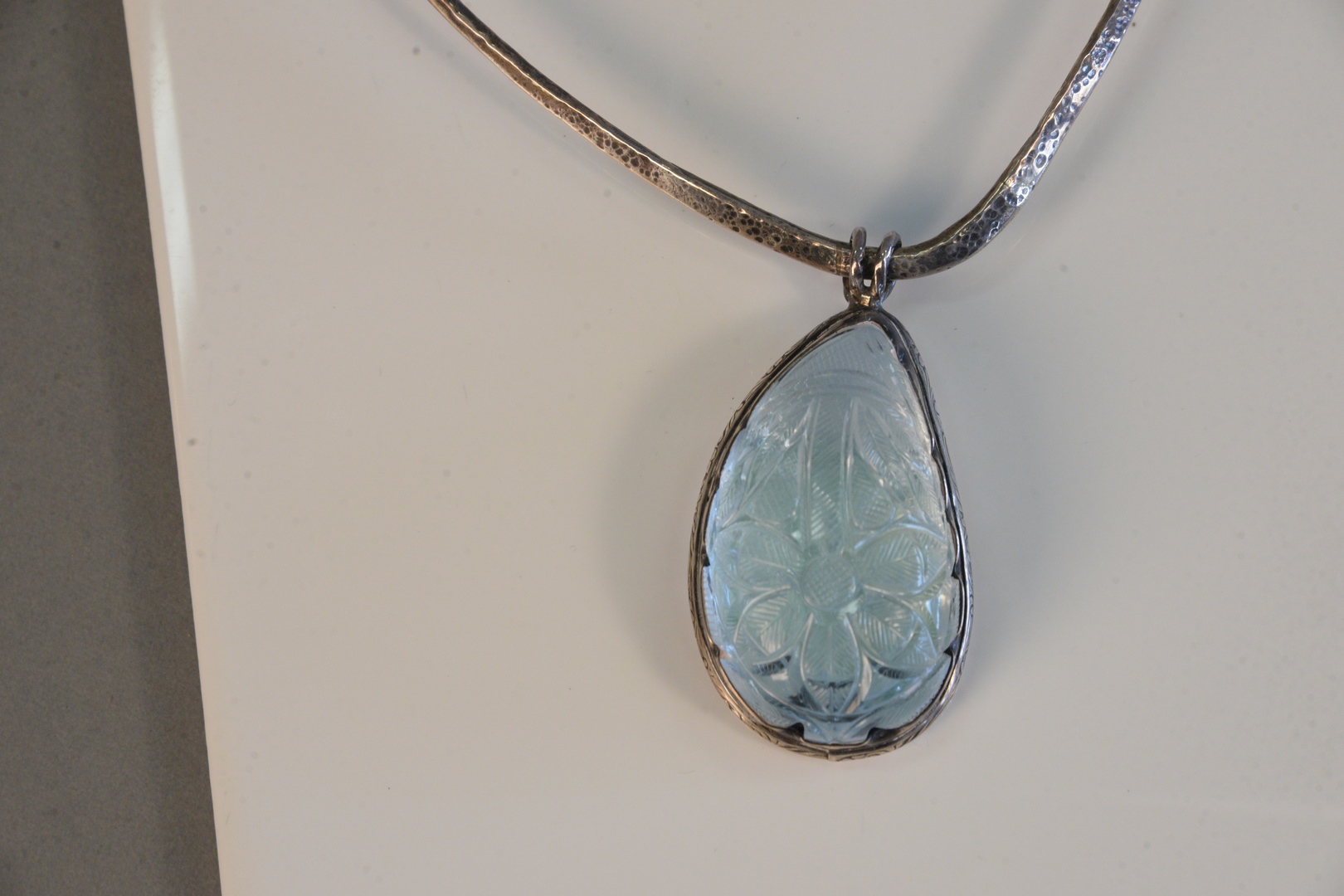 Lot 26: Designer Sterling Silver Necklace with large teardrop shaped carved light blue stone signed AB. 29.5 millimeters x 47 millimeters