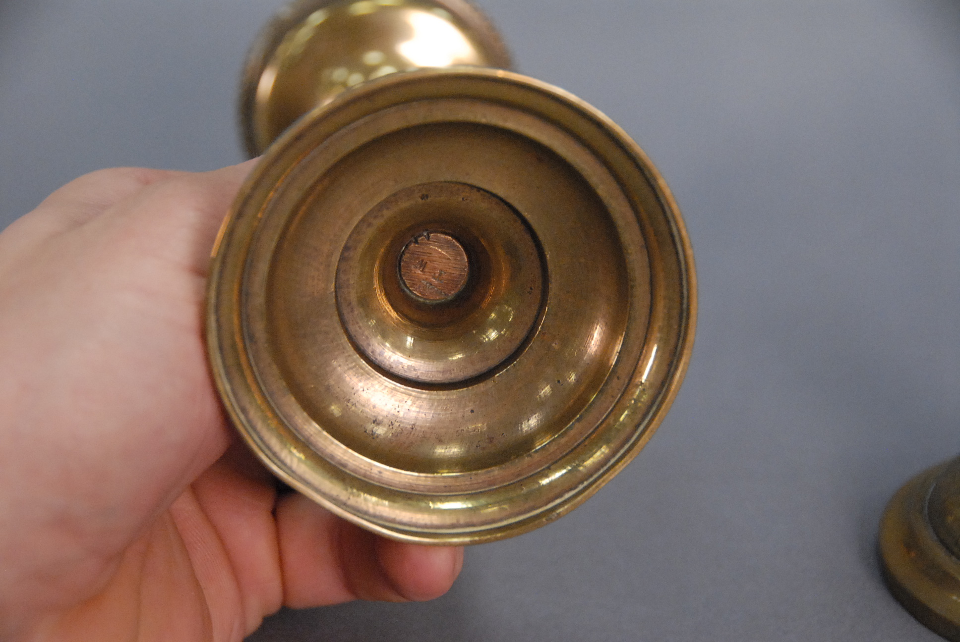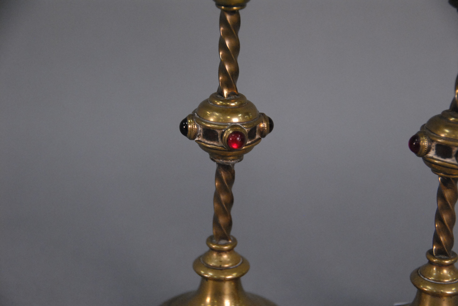 Lot 26: In the manor of Edward Pugin, pair of brass candlesticks, each having drip tray over twisted stem and knob set with four ruby glass…