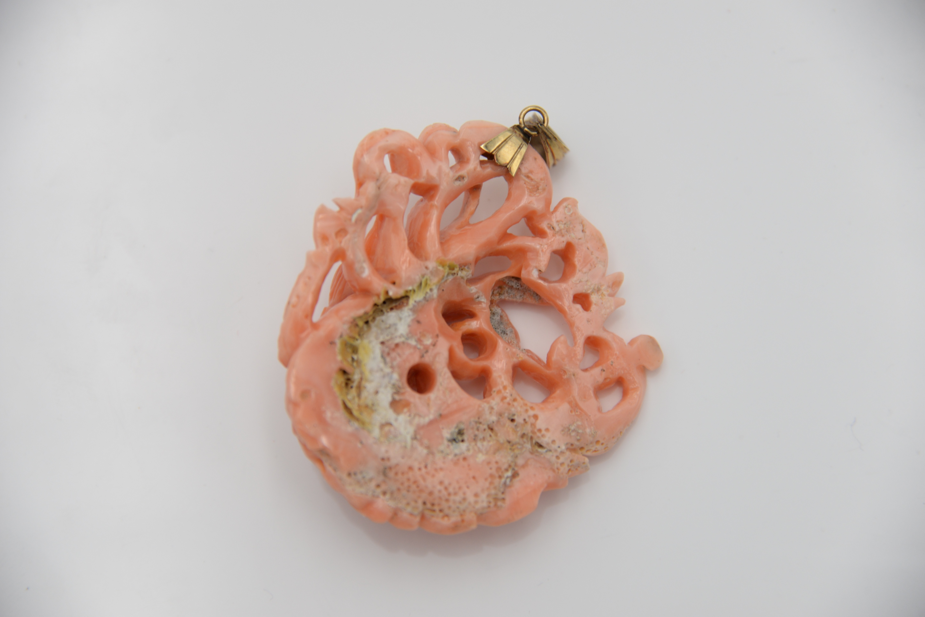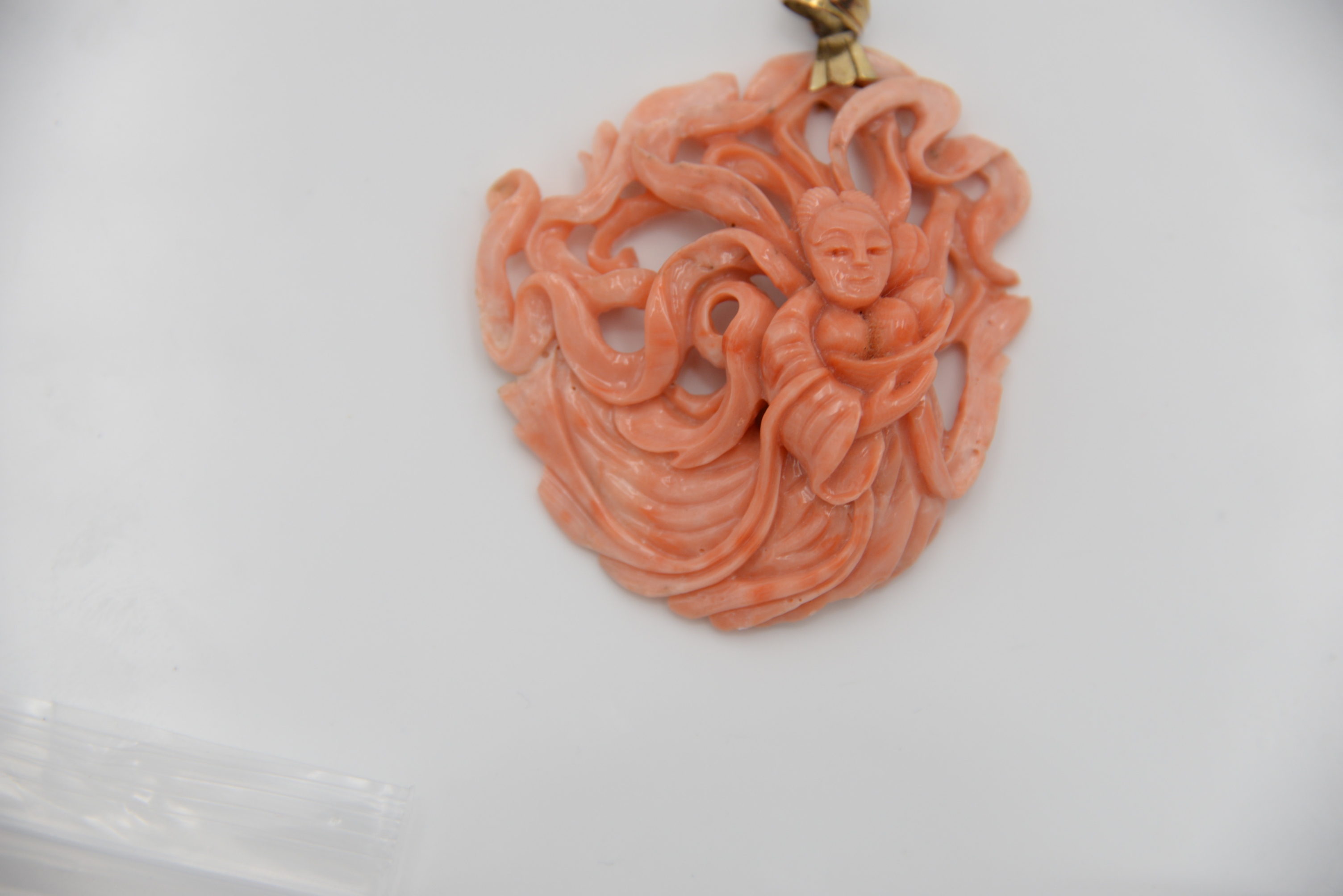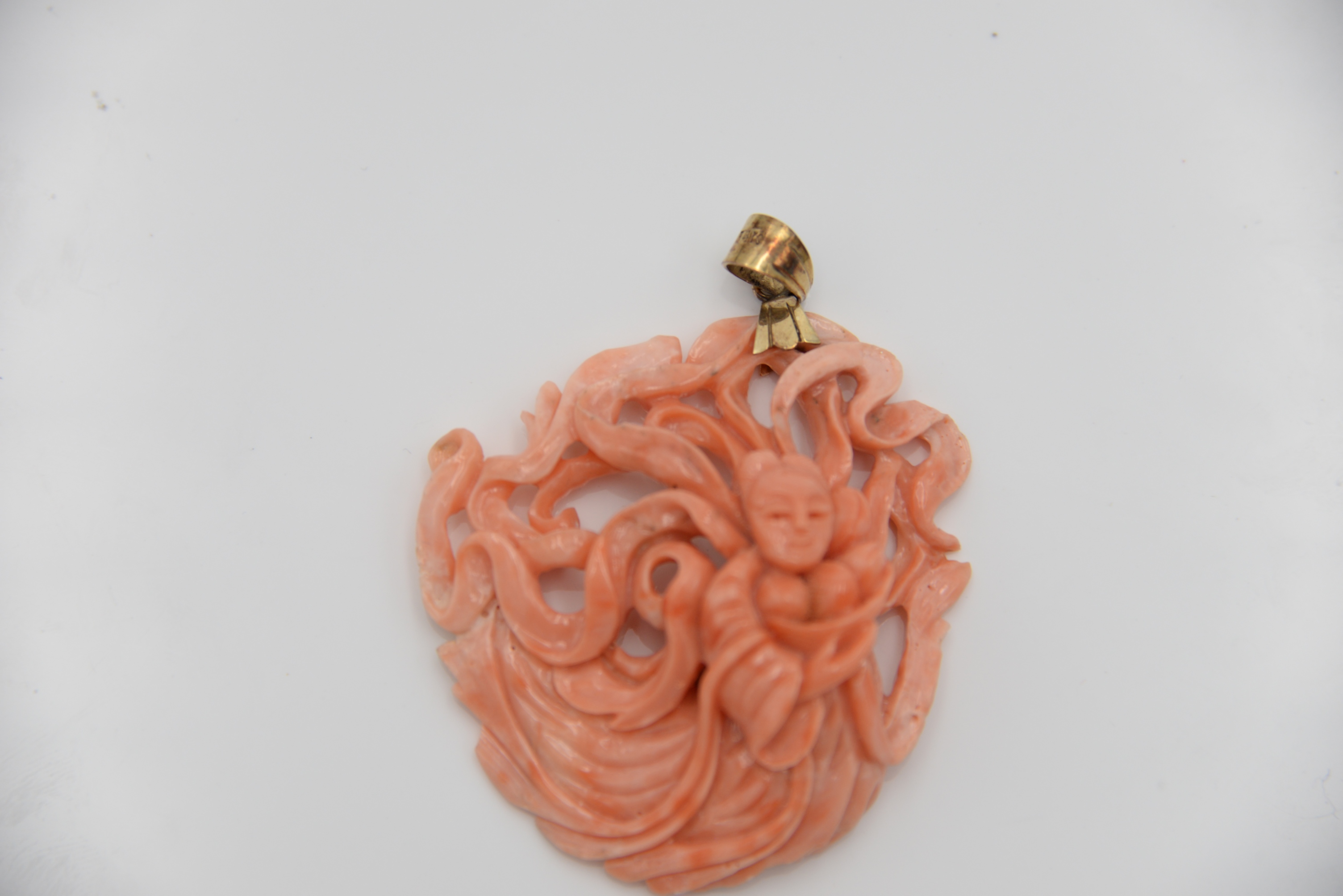 Large Antique Coral Pendant carved geisha figure 2 3/8″ x 21/4″.