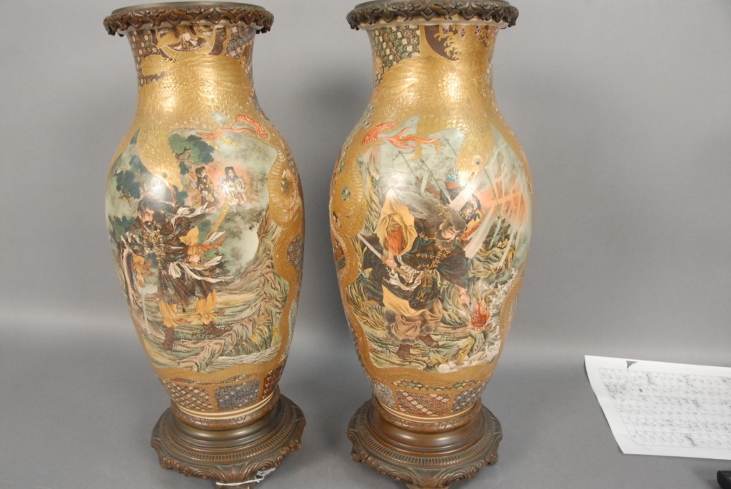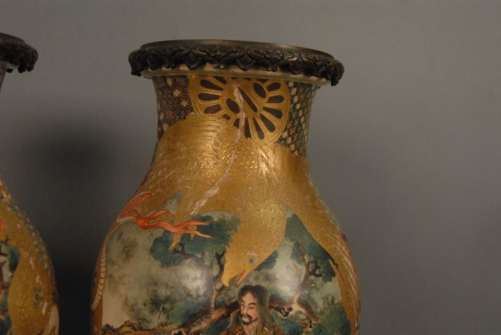 Pair of Satsuma vases having scenes of warriors and hunters surrounded by heavy gold gilt snakes and birds, bottom mounted with a heavy bronze footed base, the top also mounted with bronze rim one vase has large crack, total, ht. 18.