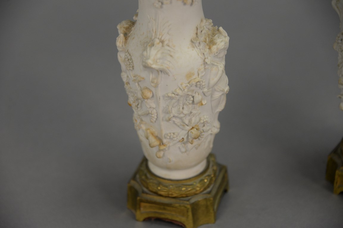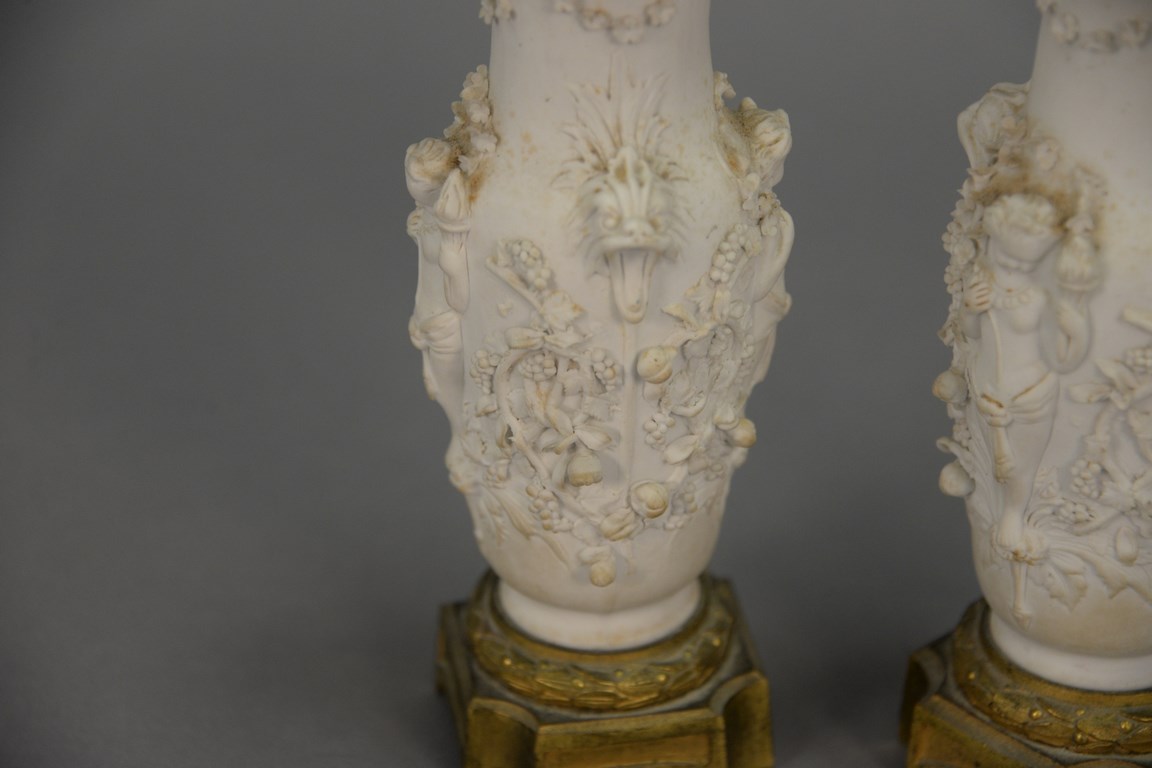 Lot 26: Pair of small porcelain bisque vases with molded figures and bronze mounts minor chips. total ht. 7 3/4 in.