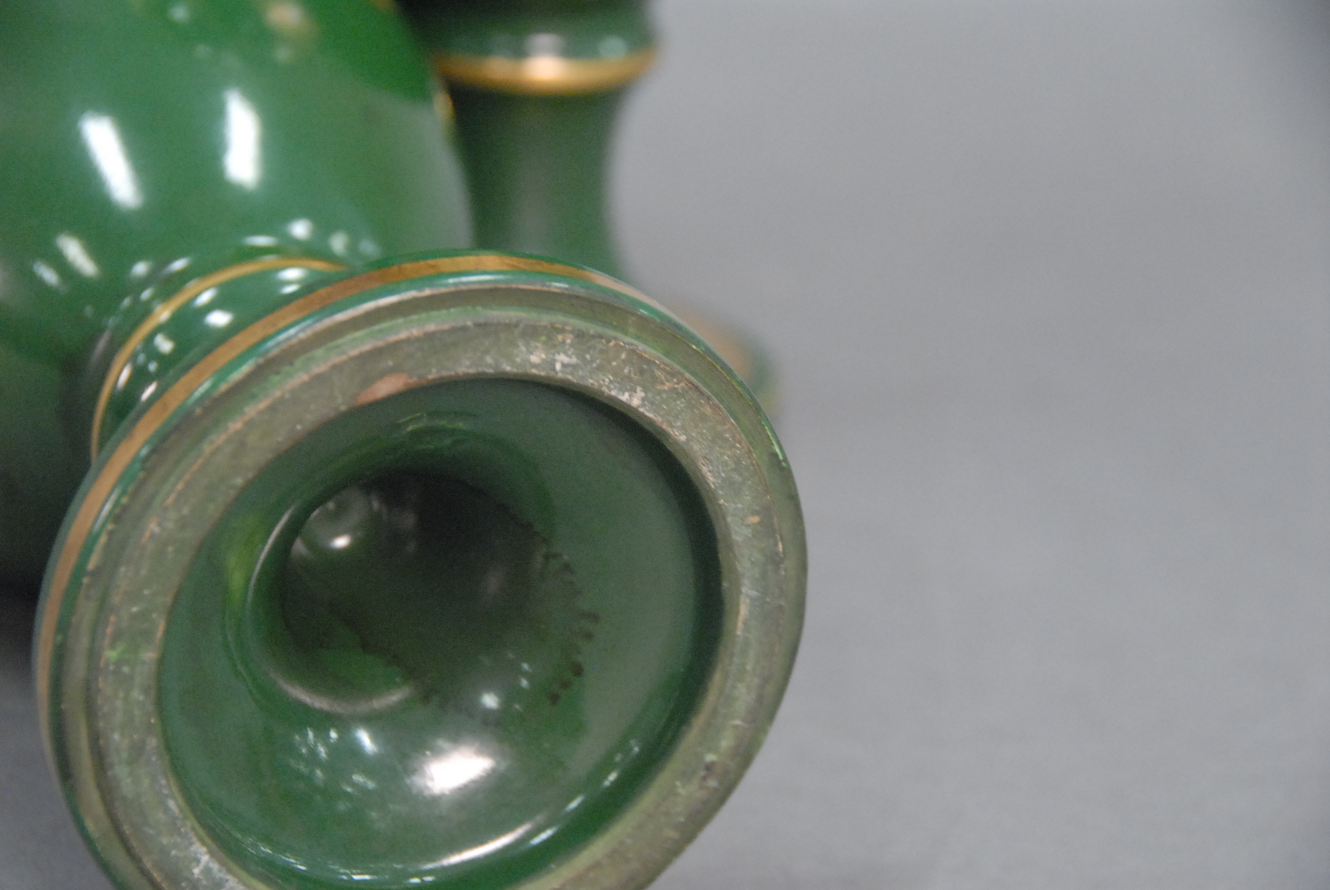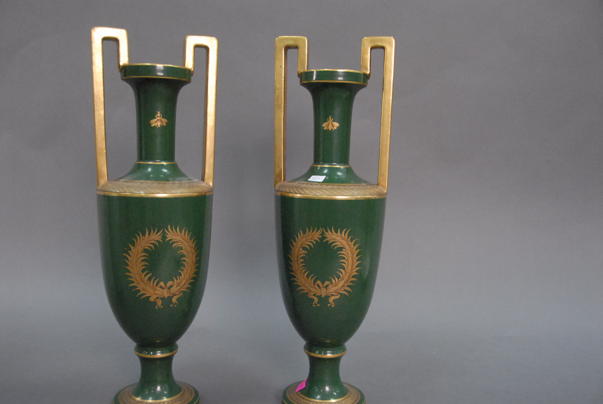 Pair of tall French vases with gilt handles and eagle, ht. 18in.