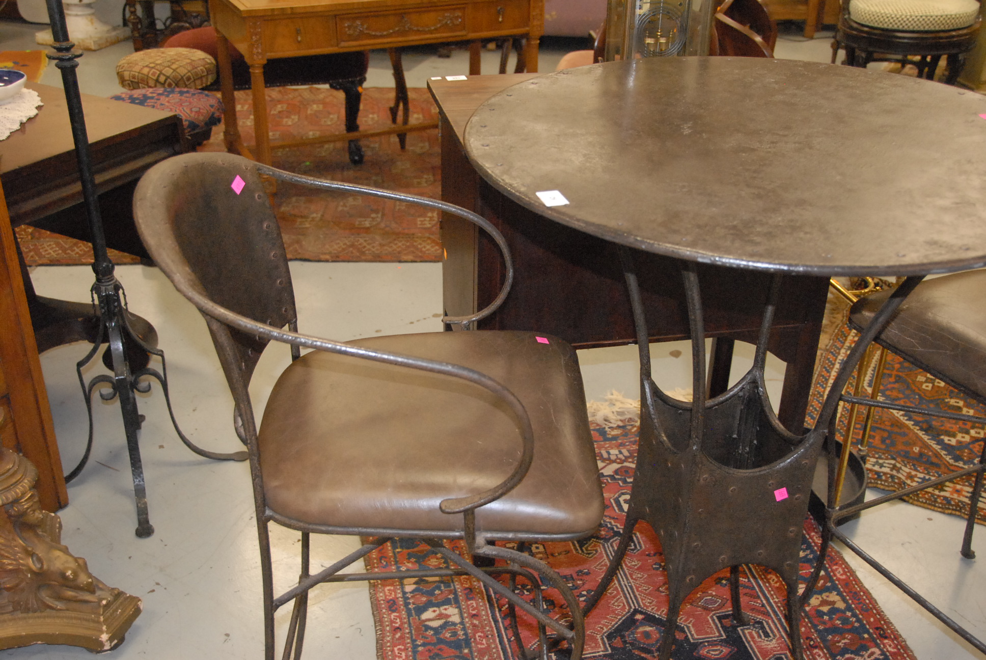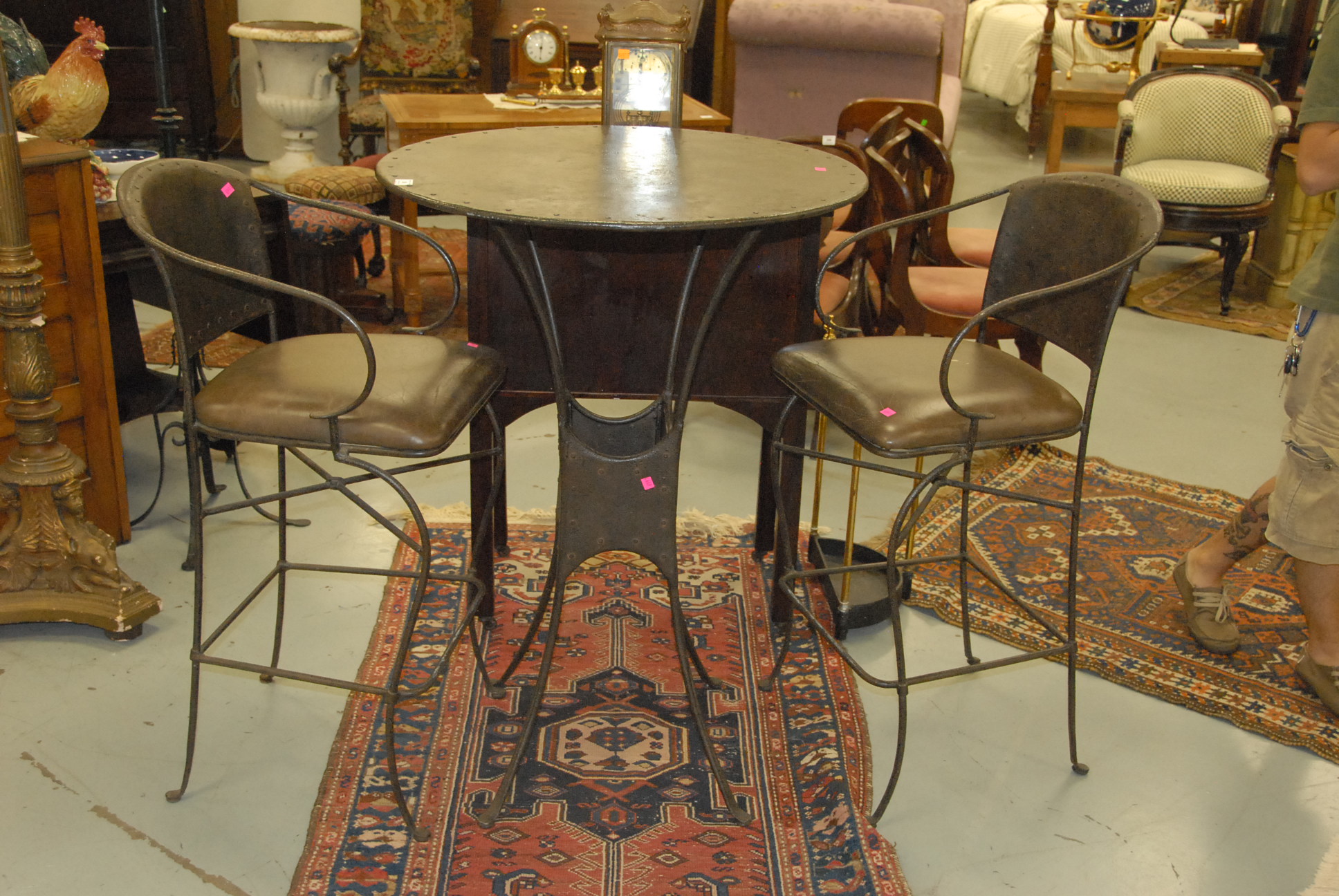 Pier 1 iron tall bar table with two armchairs with leather seats.