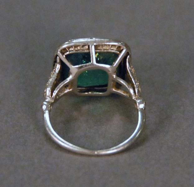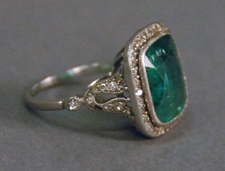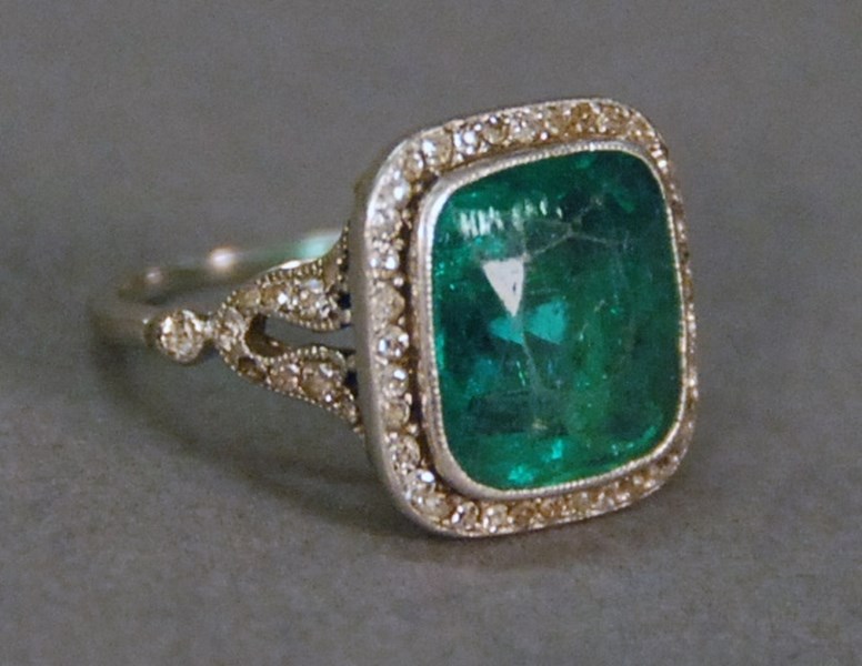 Lot 26: Platinum emerald and diamond ring, center emerald measures 12 x 11mm approximately 5.75cts., emerald is surrounded by 52 round single cut diamonds, emerald has scratches and abrasion with nice medium green color and moderate inclusions, early 20th ce
