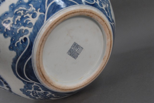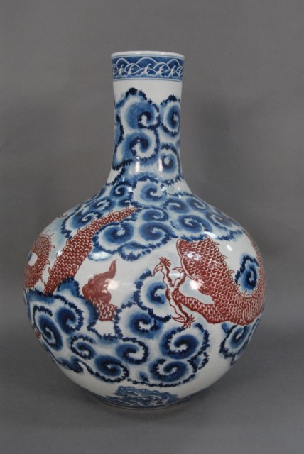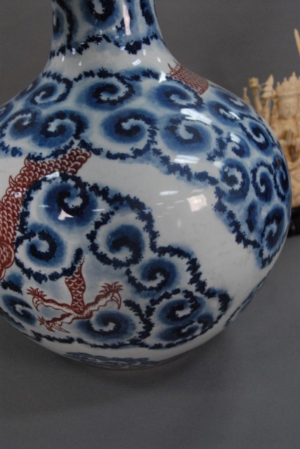 Republic period blue and white under-glaze vase with red dragon and cloud design.