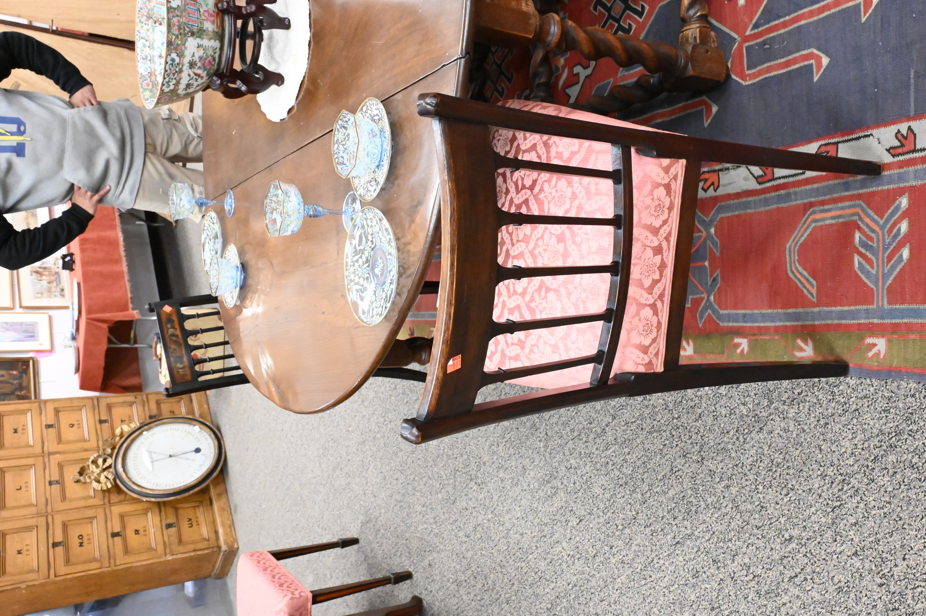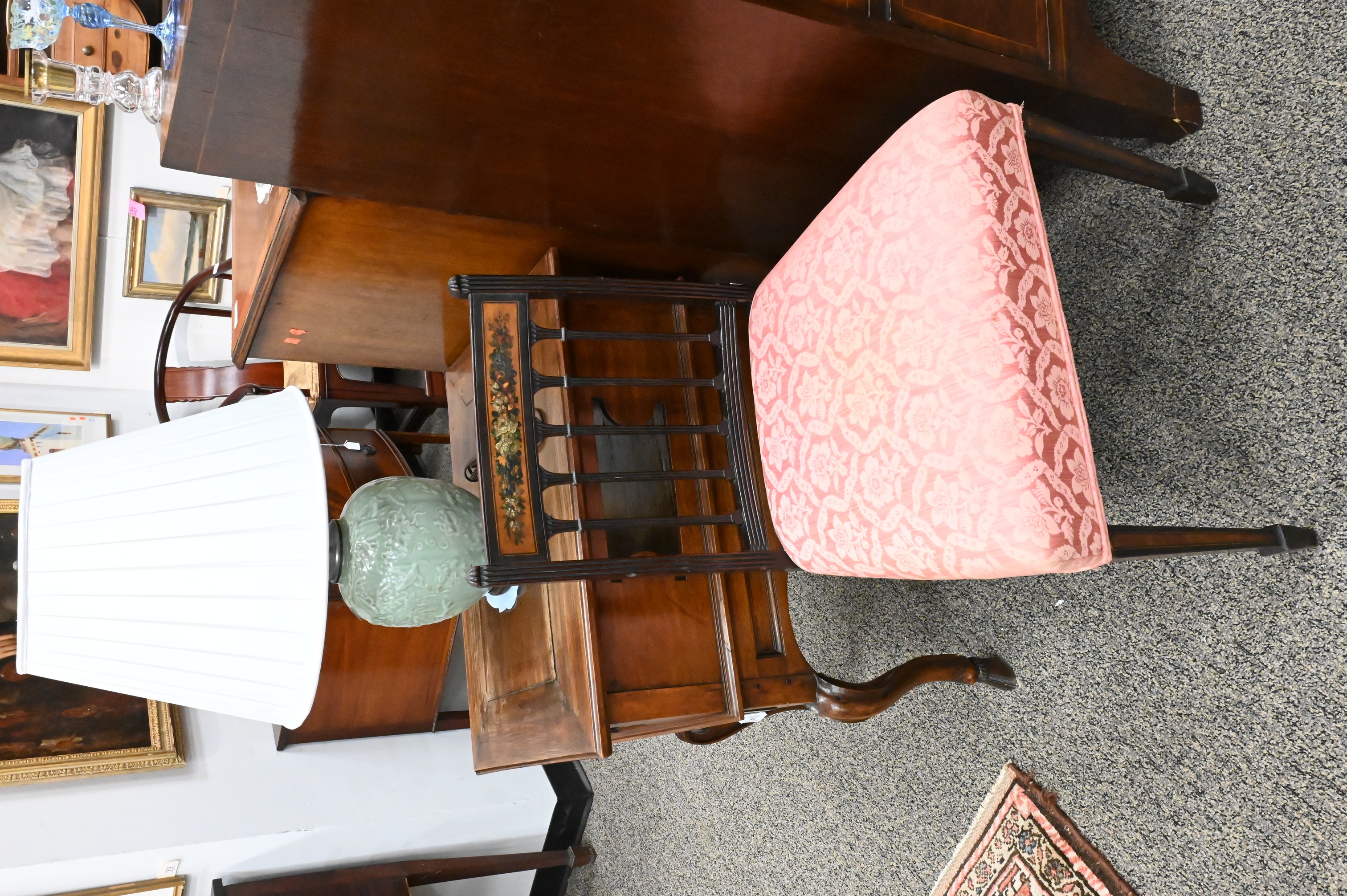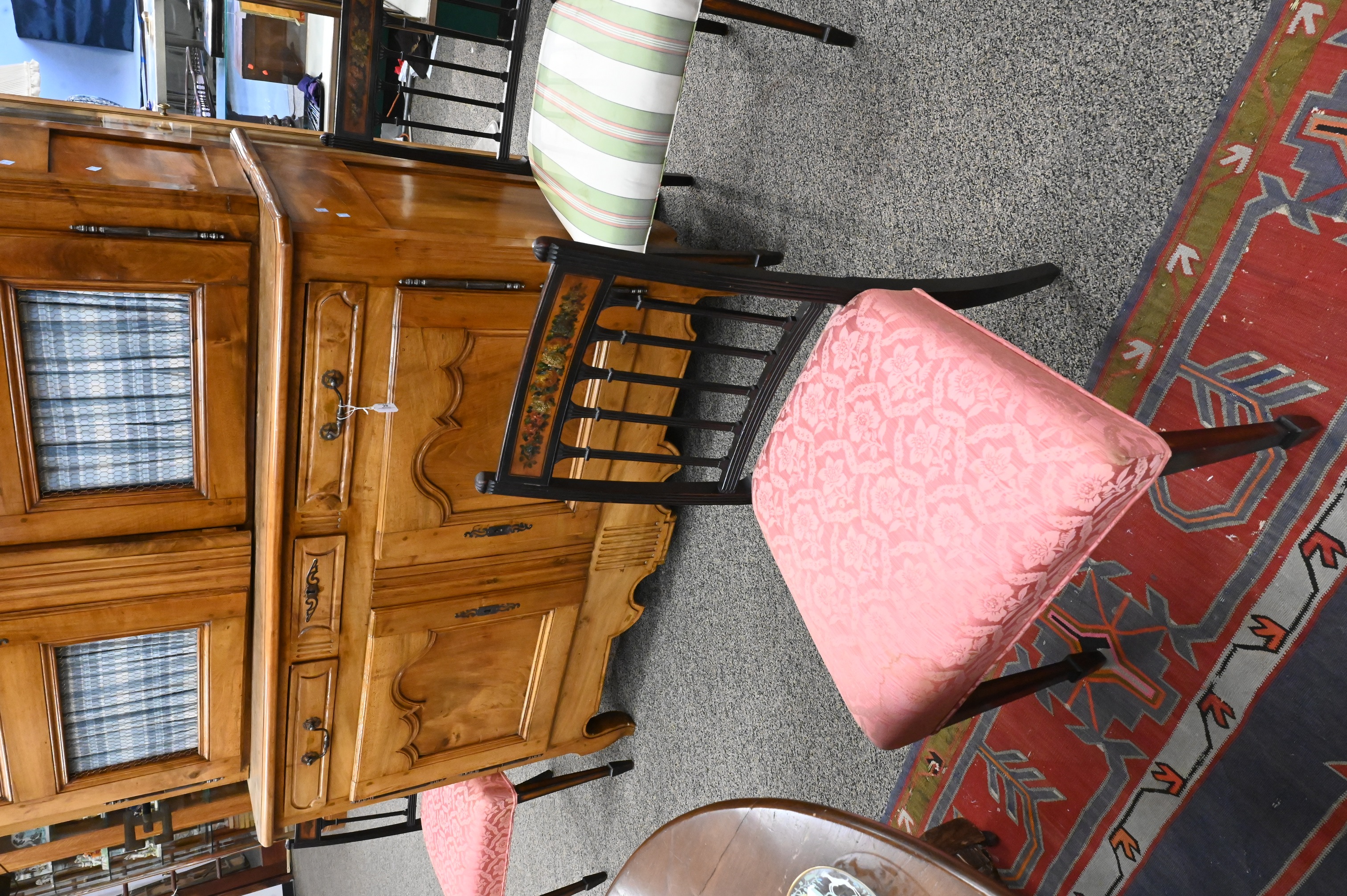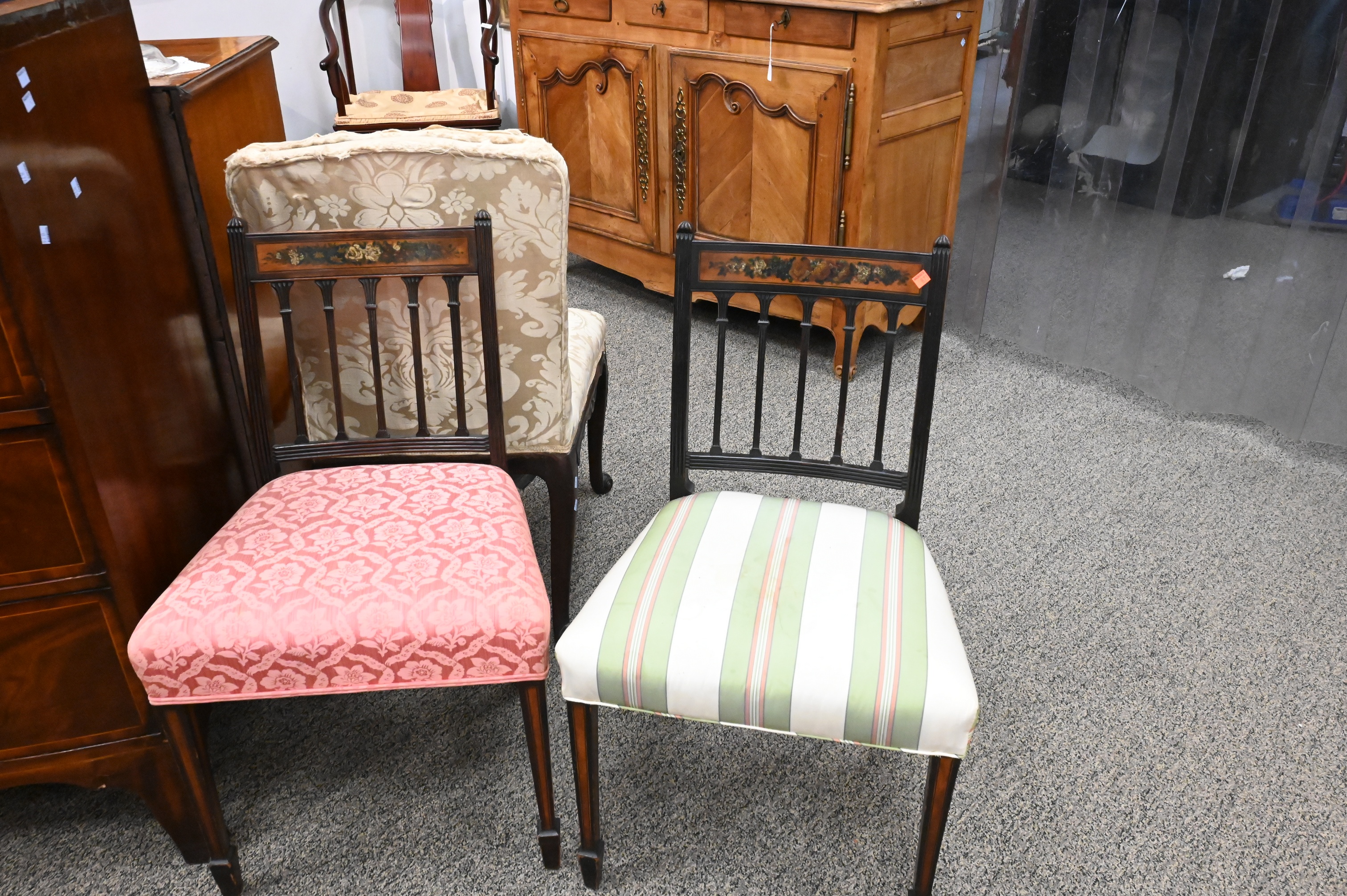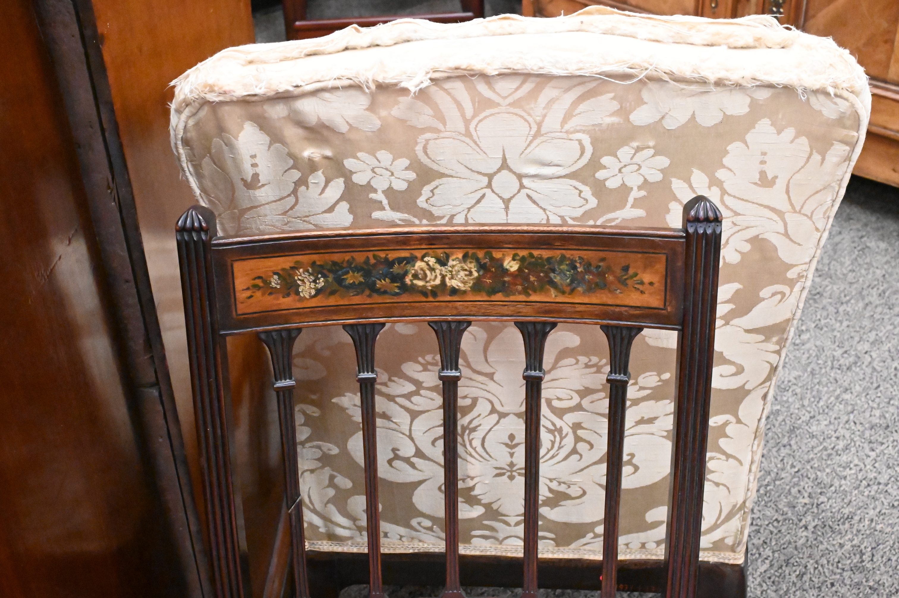 each having paint decorated top rail, over fluted columns with fully upholstered seats, set on square tapered legs with inlaid panels, one spindle broken, 19th century