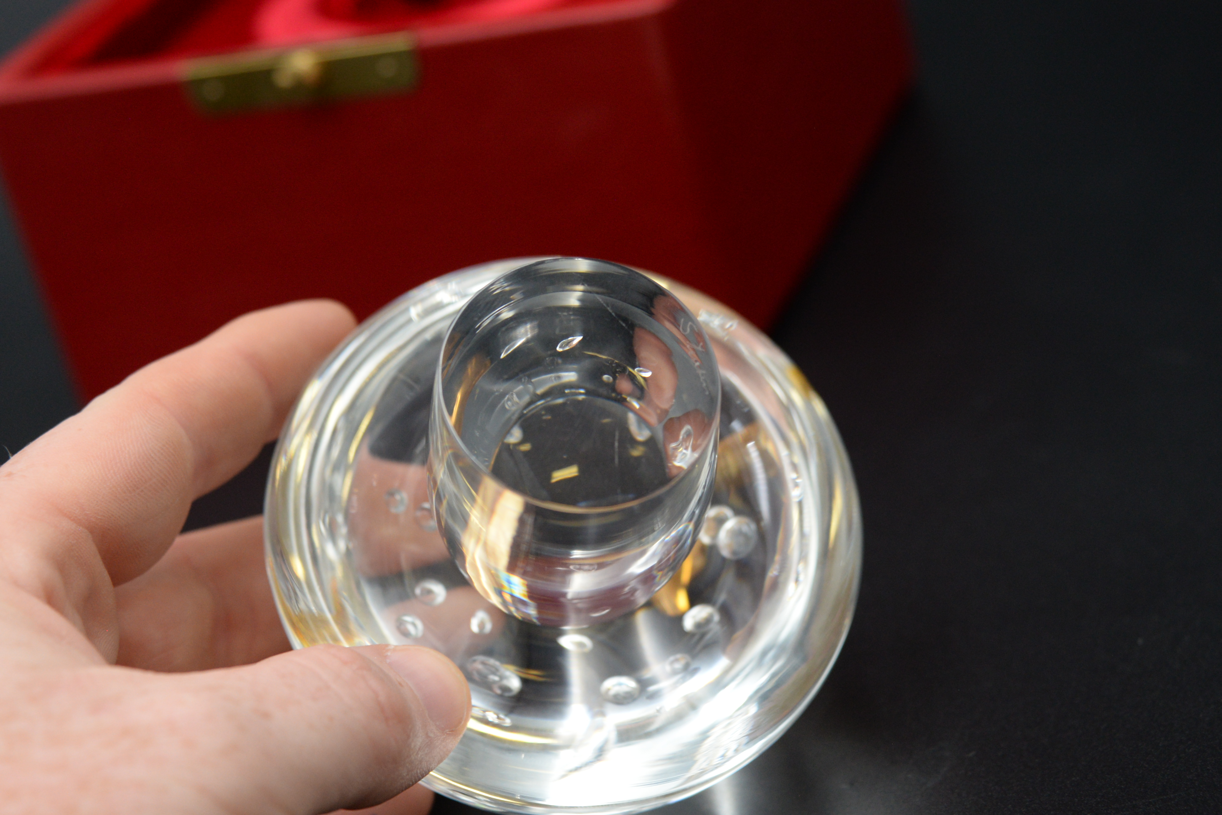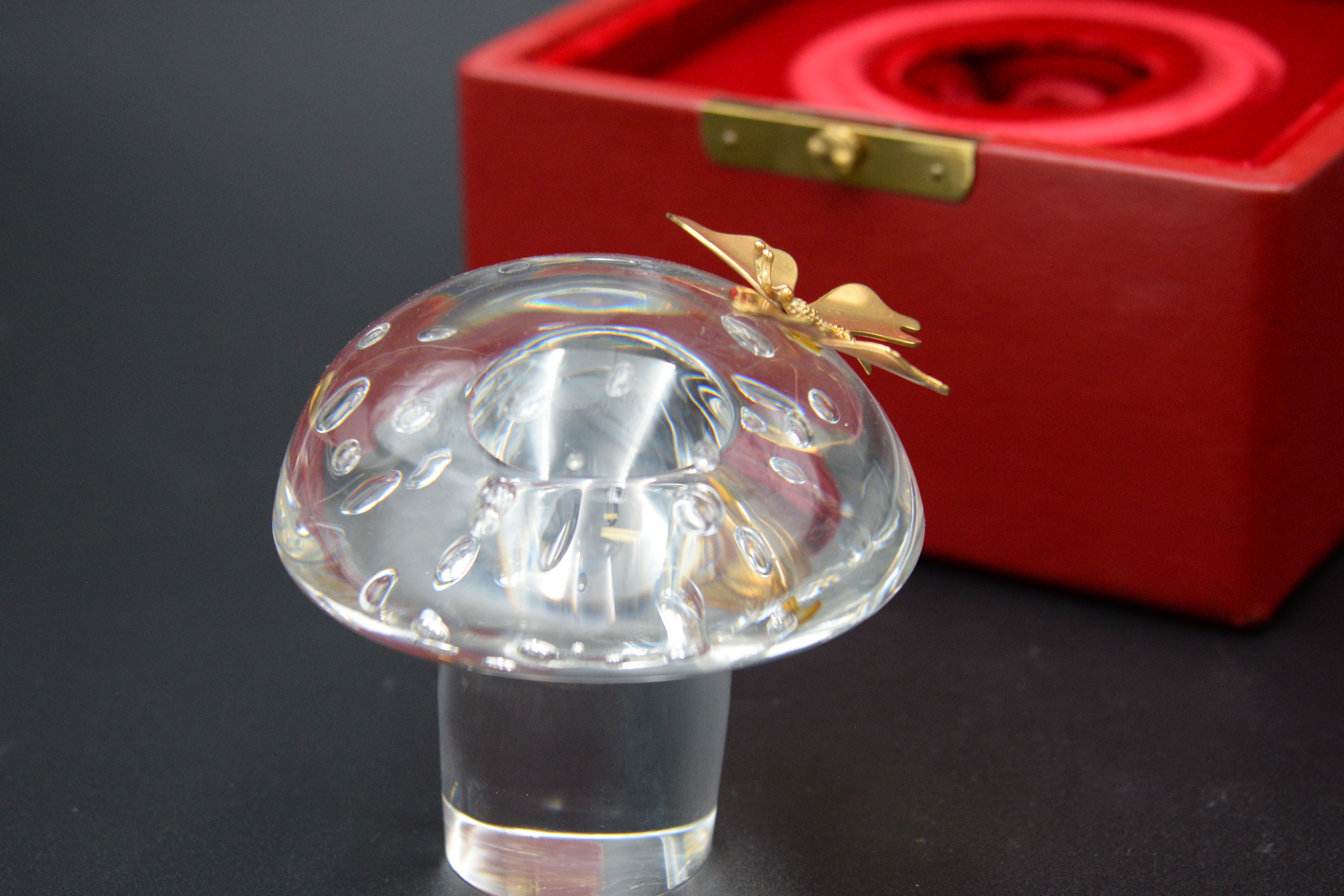 Steuben Crystal Mushroom with 18K Gold Butterfly, signed “Steuben” on bottom, in original red leather velvet box, designed by James Houston 1964, height 3 1/2 inches