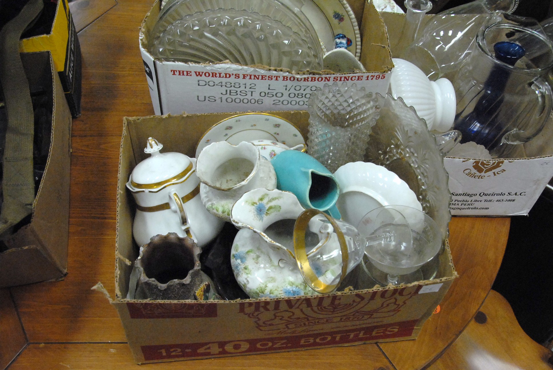 Table lot of china, glassware, platters, tools, and a tripod.