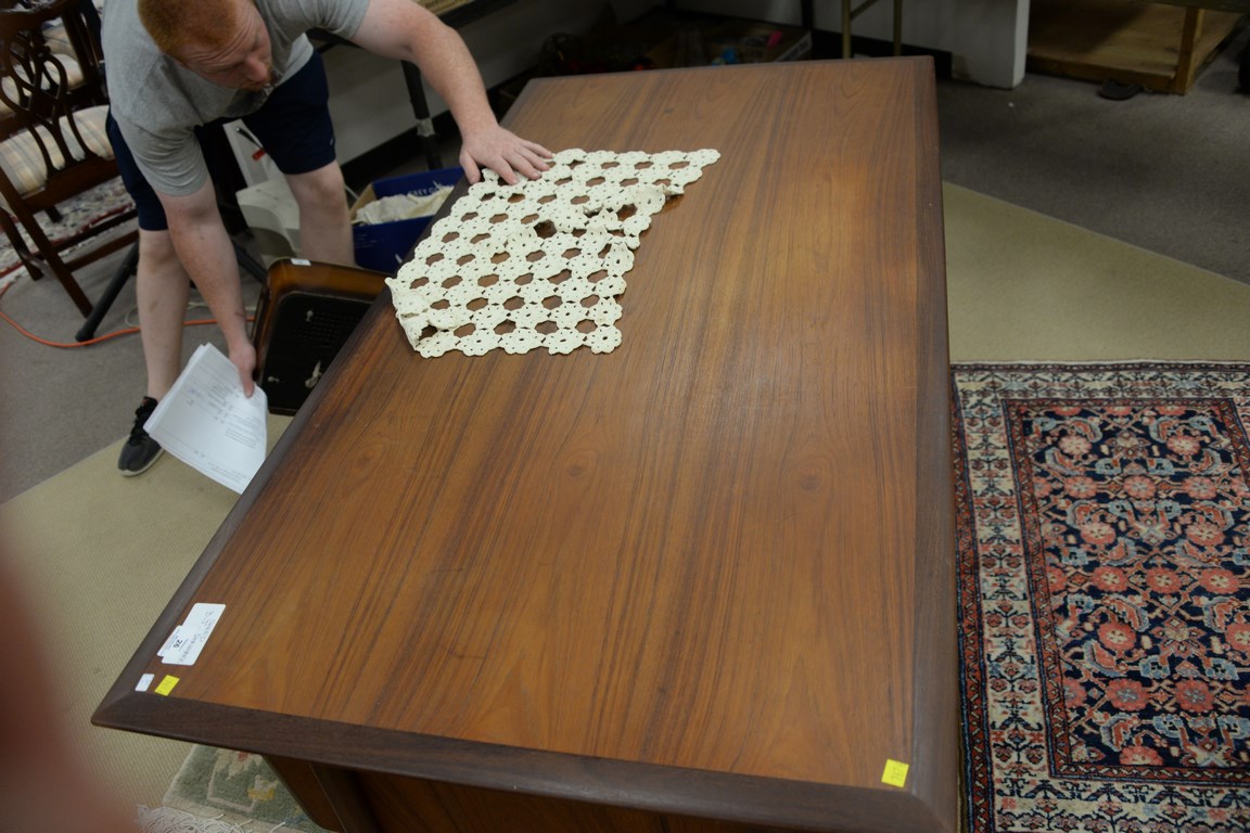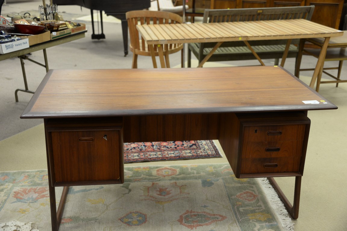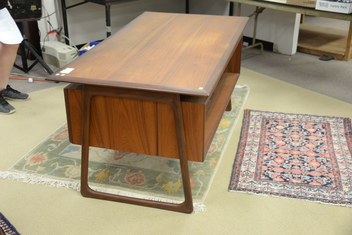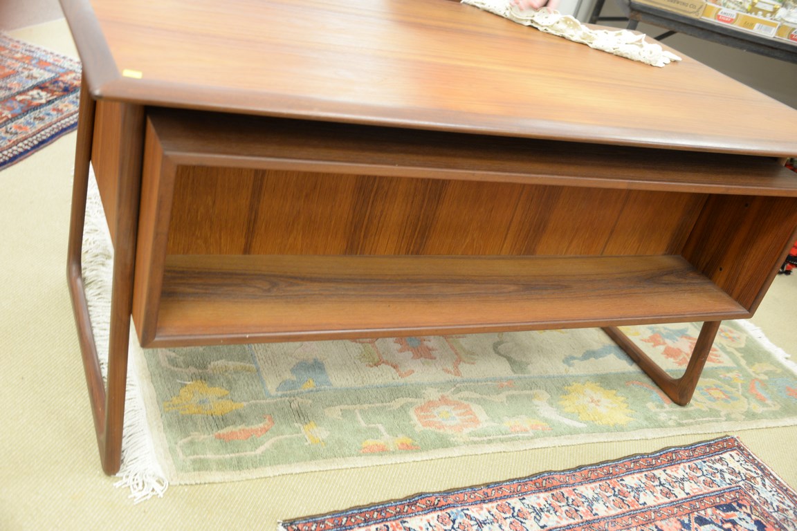 Teak desk cantilevered designed, stamped BJ Denmark, ht. 28 in. wd. 59 in. dp. 31 in.
