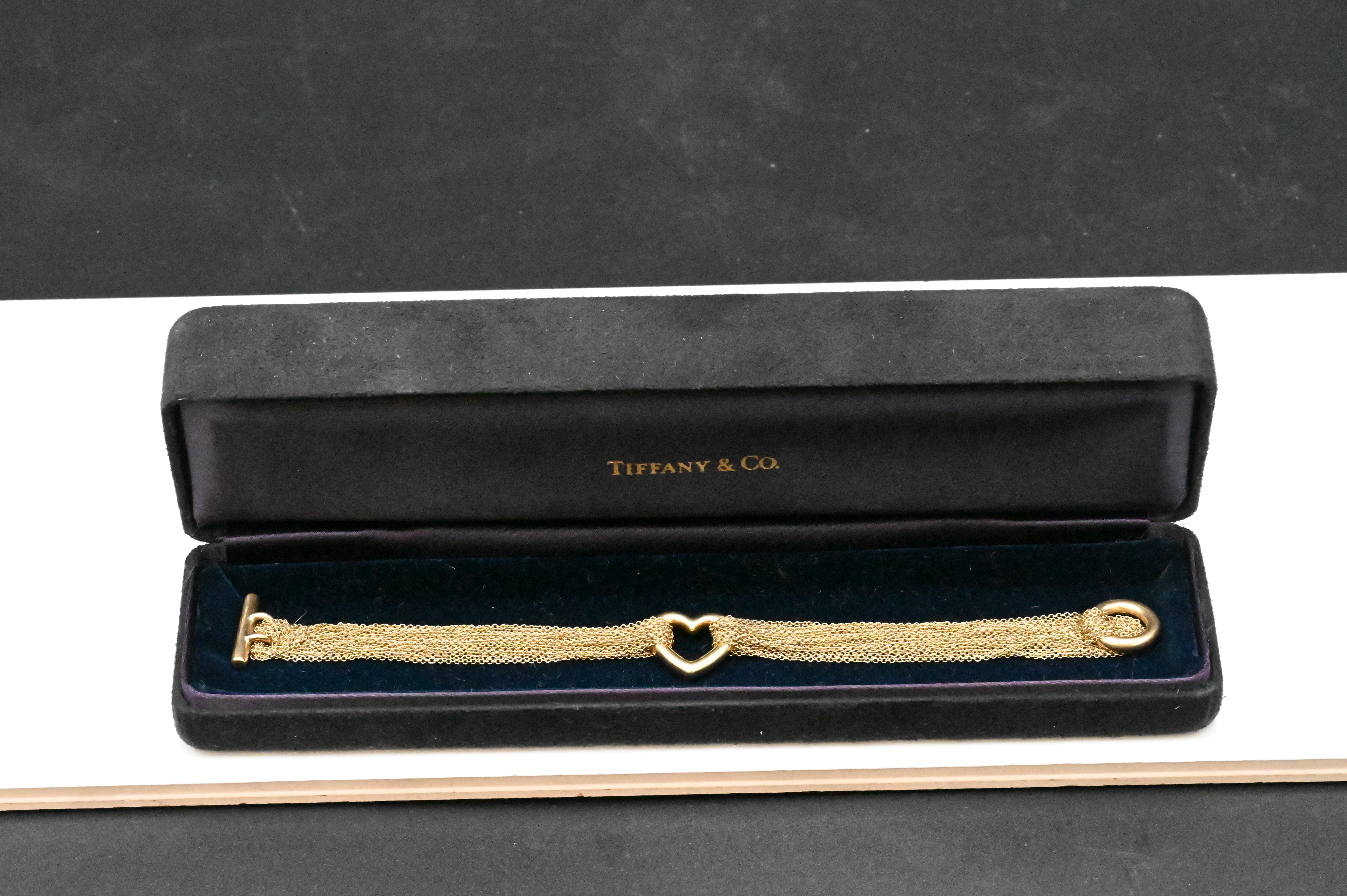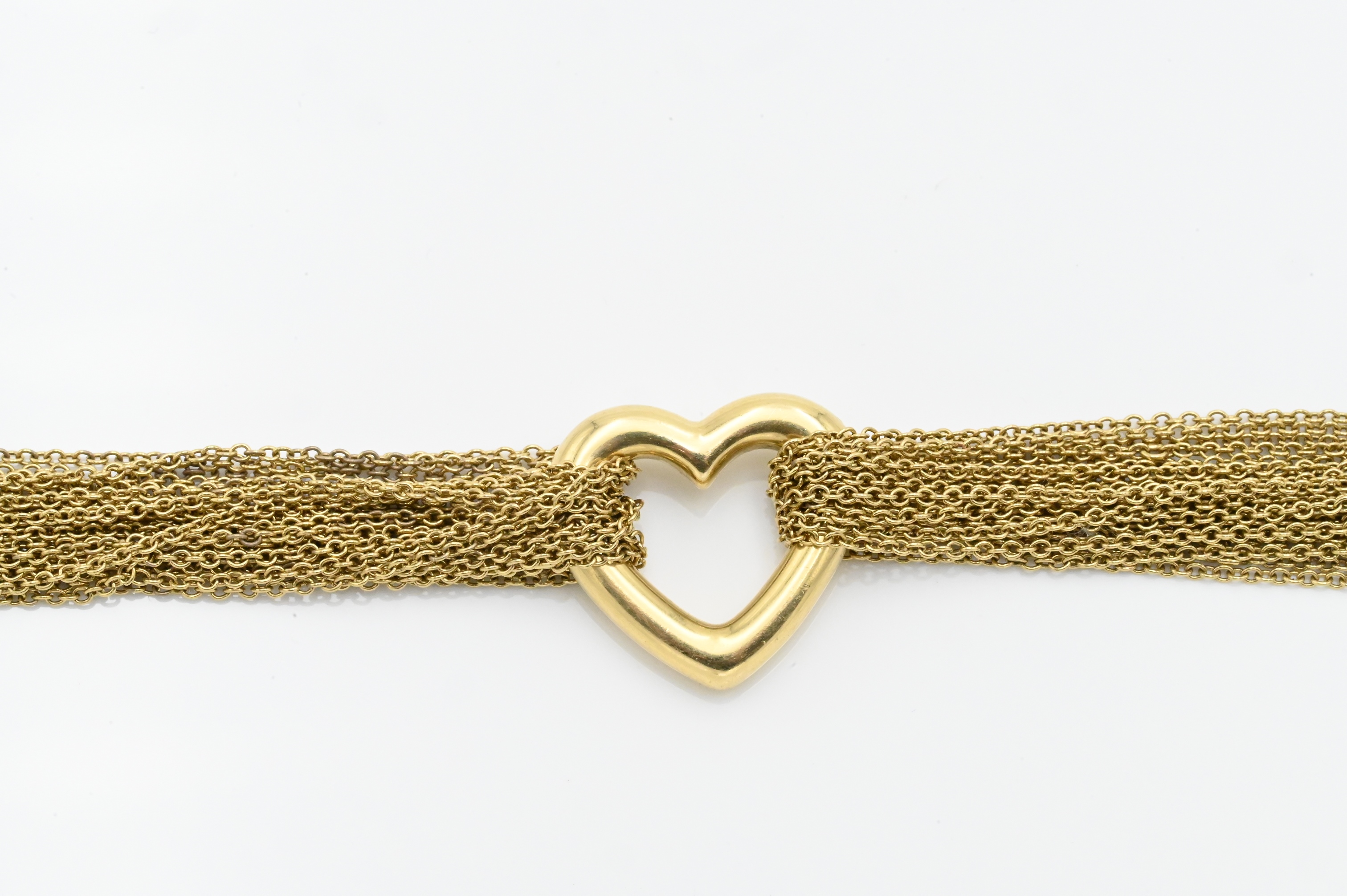 Lot 26: Tiffany and Company 18K Yellow Gold Multi Strand Mesh Heart Toggle Bracelet
