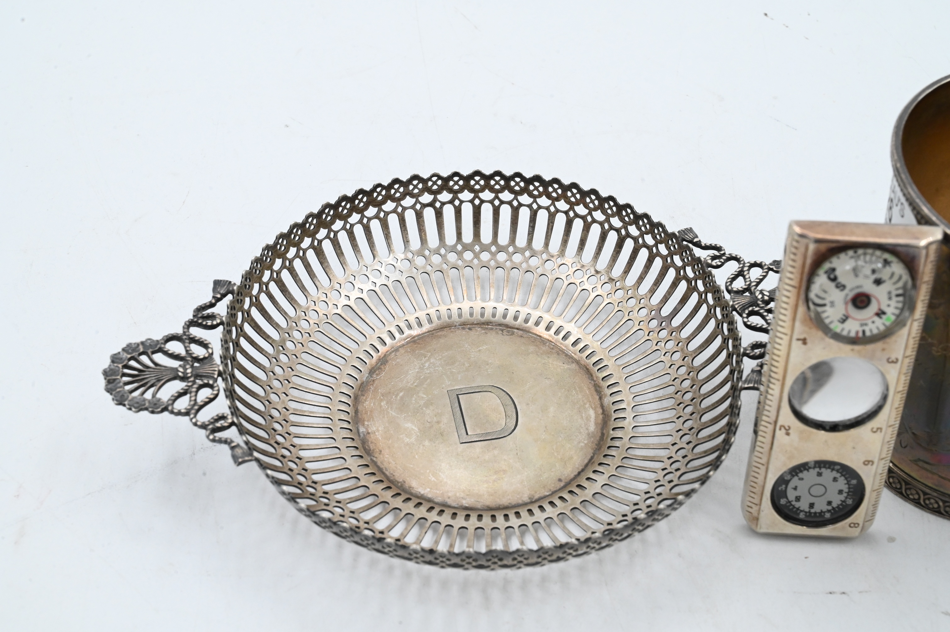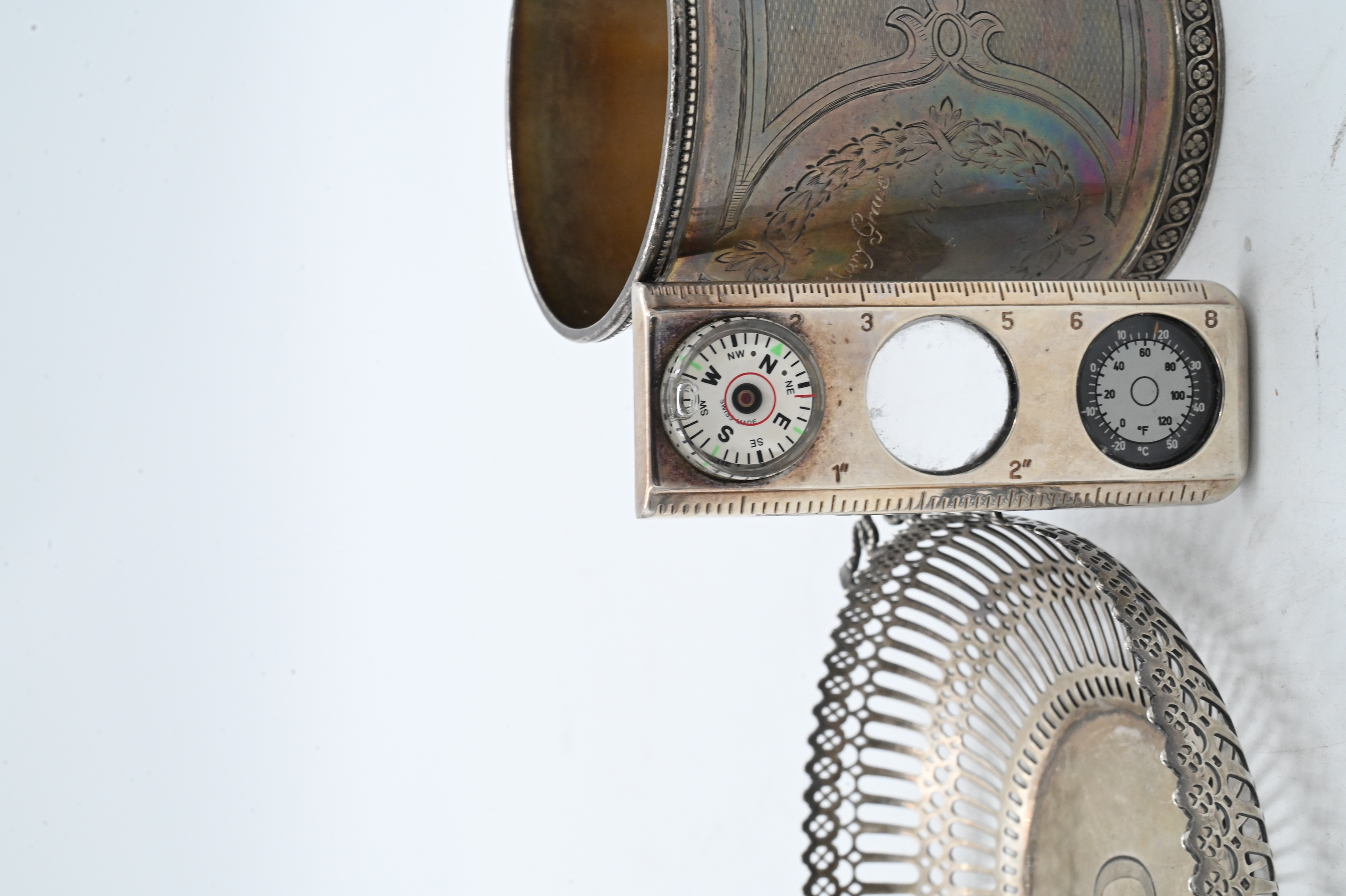 mug, reticulated bowl, ruler having compass, thermometer, and magnifying glass