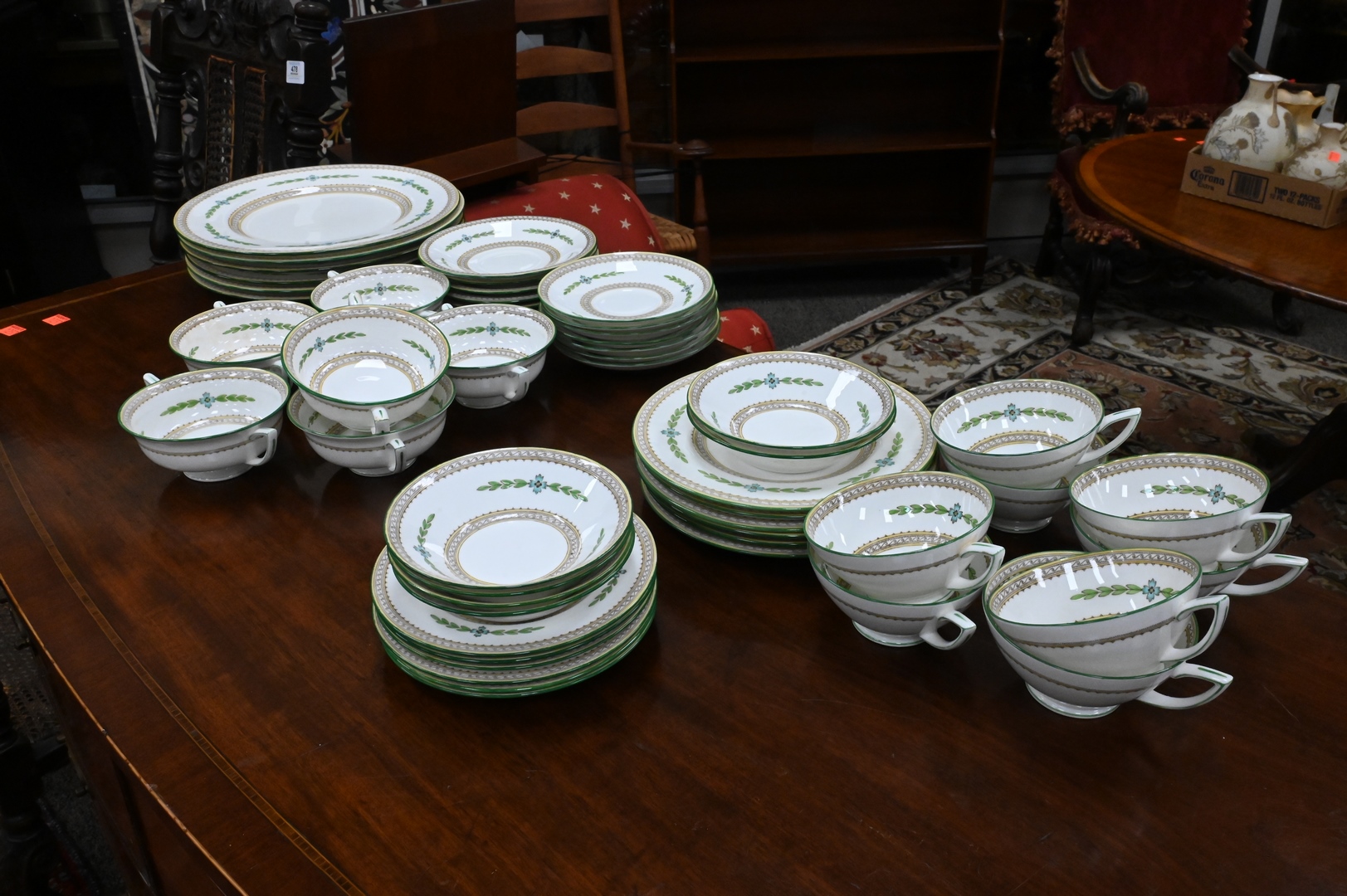 98 Piece Minton “Kent” Porcelain Dinnerware Set, to include 12 dinner plates, 12 salad plates, 12 bread plates, 10 small bowls, 14 tea cups, 13 tea saucers (plus one broken), 12 soup cream bowls, along with 12 soup under plates.