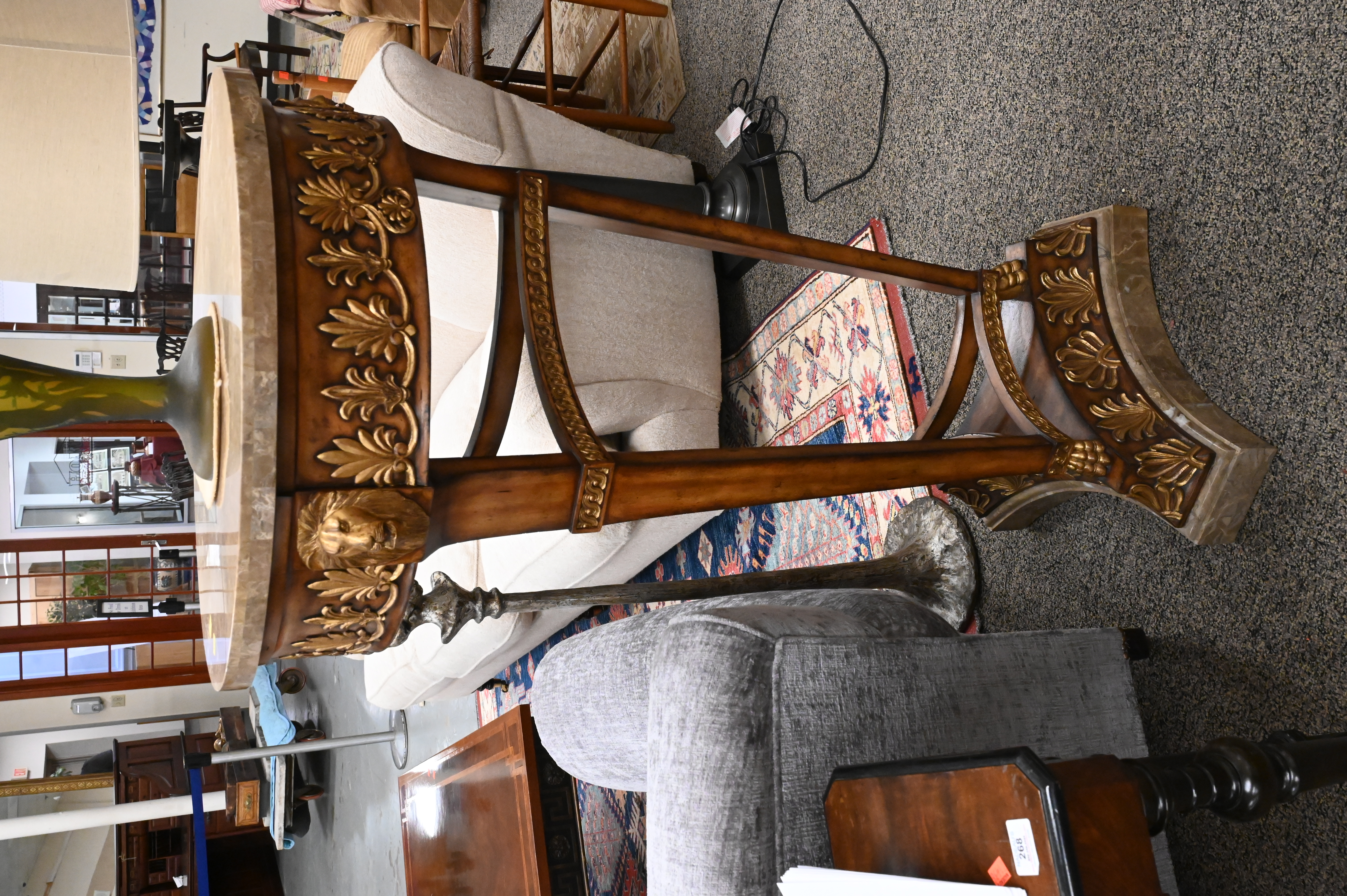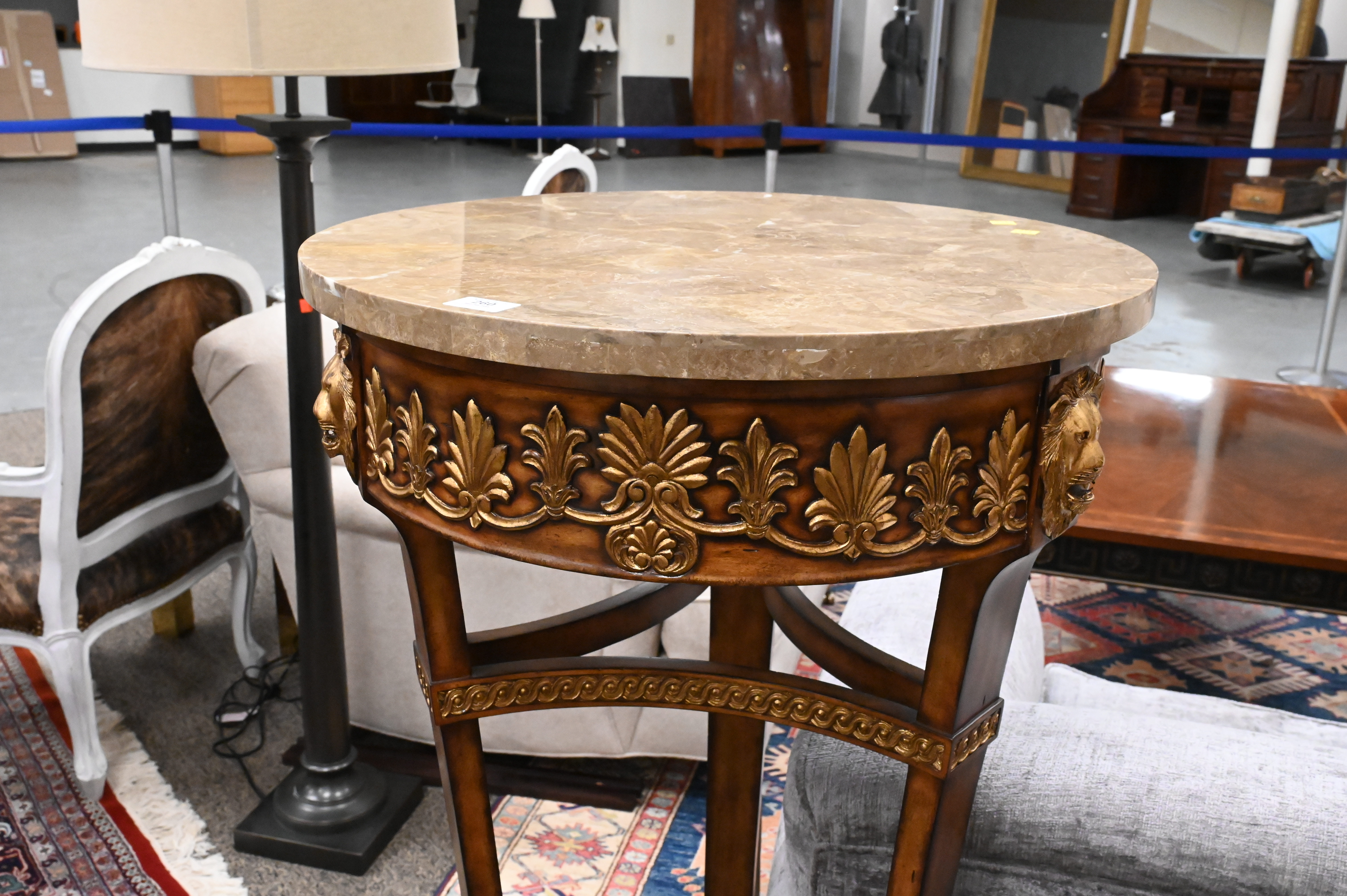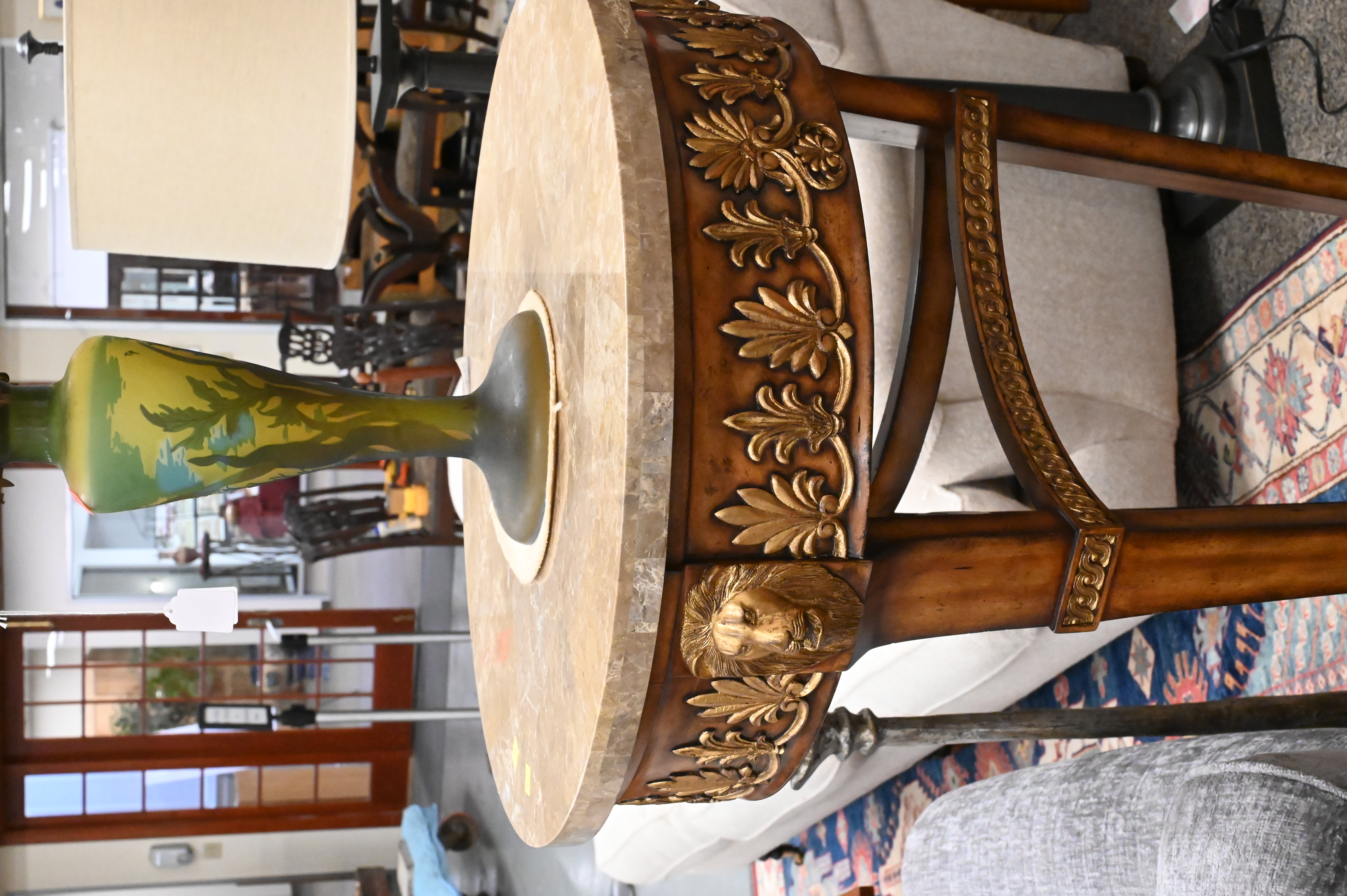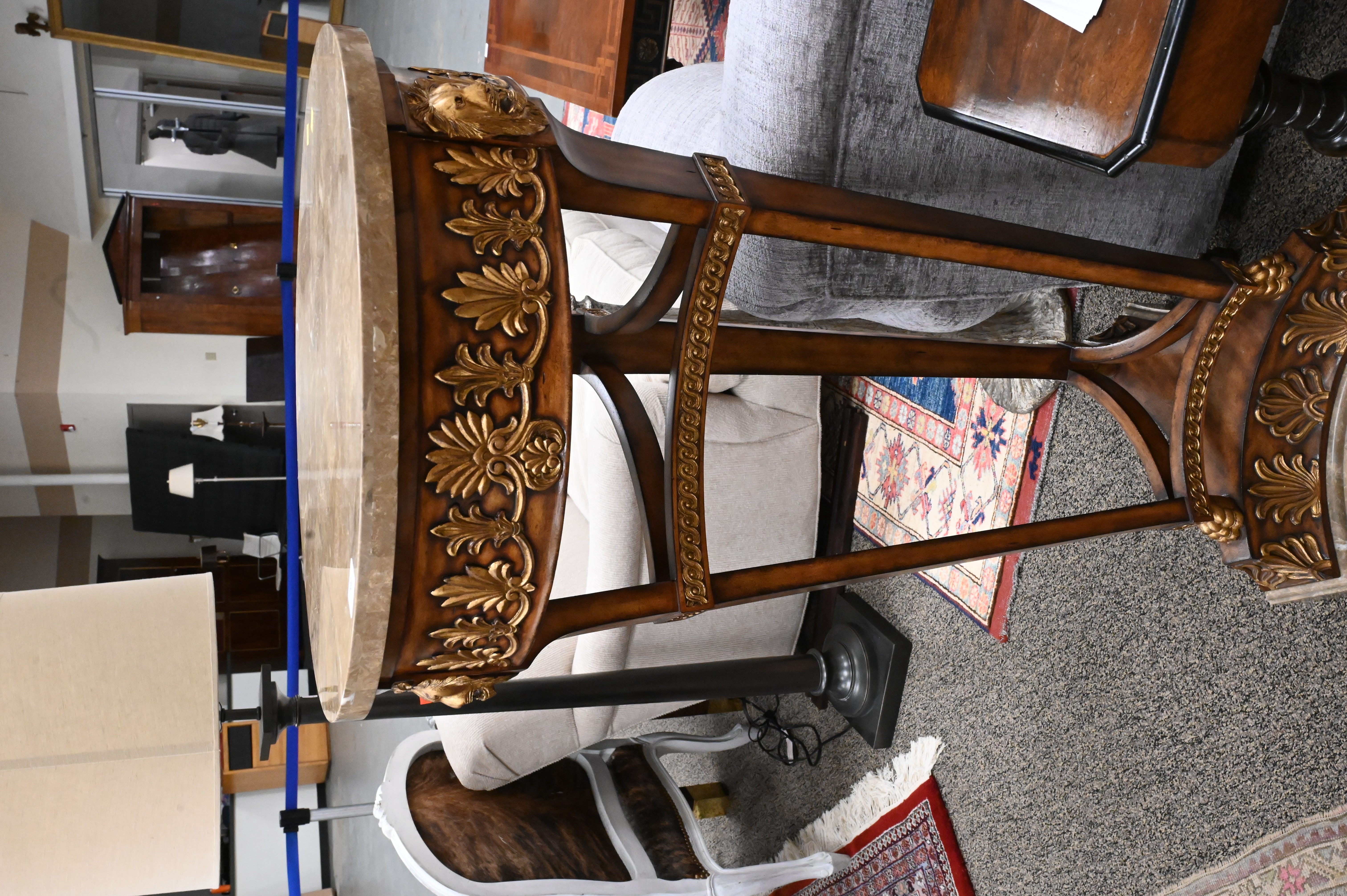 A Pair of Maitland Smith Marble Top Stands, having gilt trim along with lion faces, height 48 inches, diameter 24 inches.