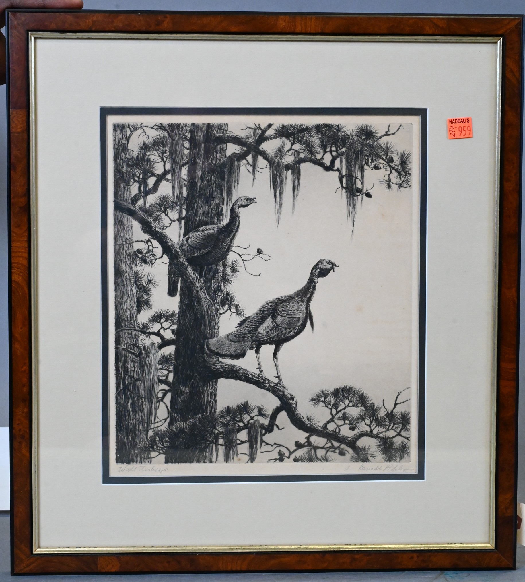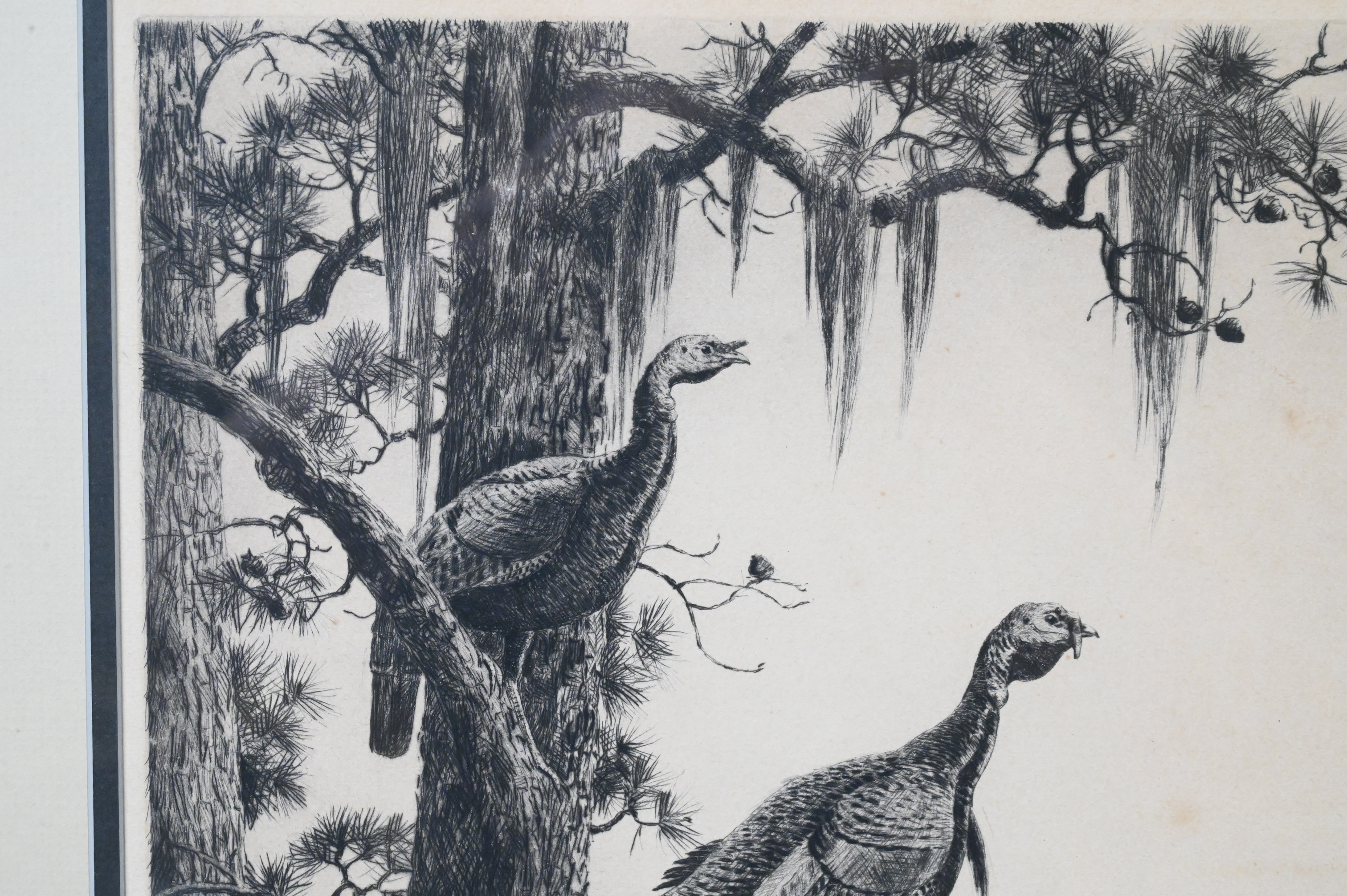 Depicting a pair of wild turkeys perched in a pine tree, with hanging moss and wooded background.