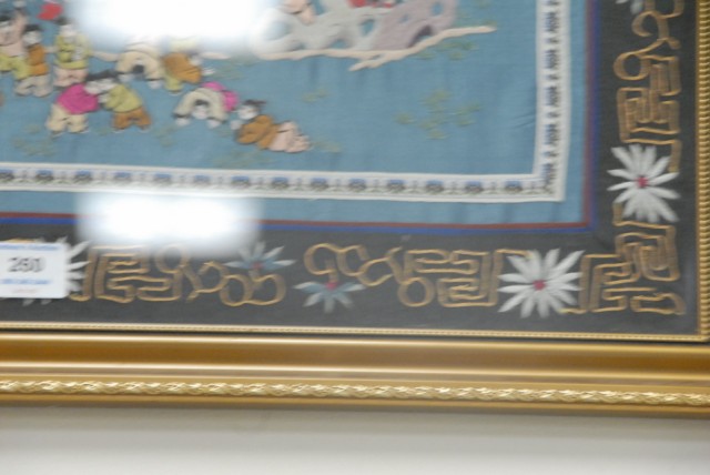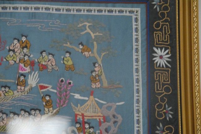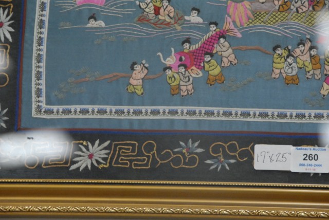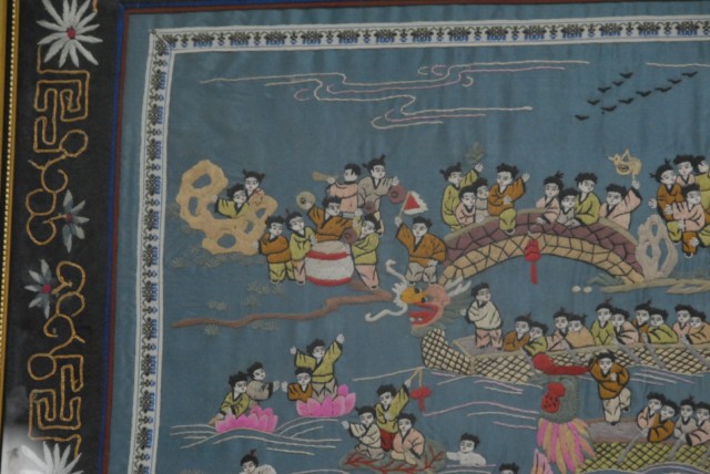 Chinese framed embroidery with 100 boys on dragon boat design
