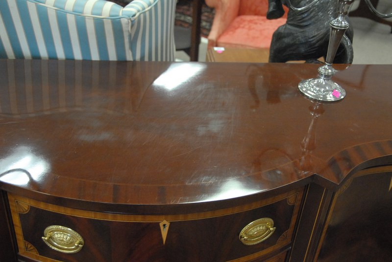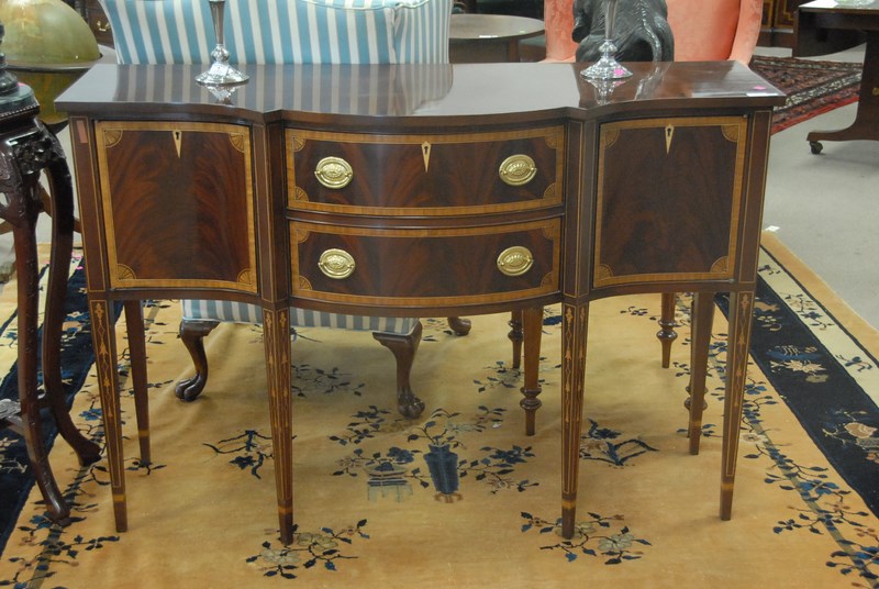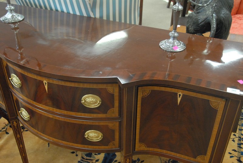 Lot 260: Councill Craftsman Federal style sideboard with banded inlaid drawers and line and bell flower inlays, diminutive in size.