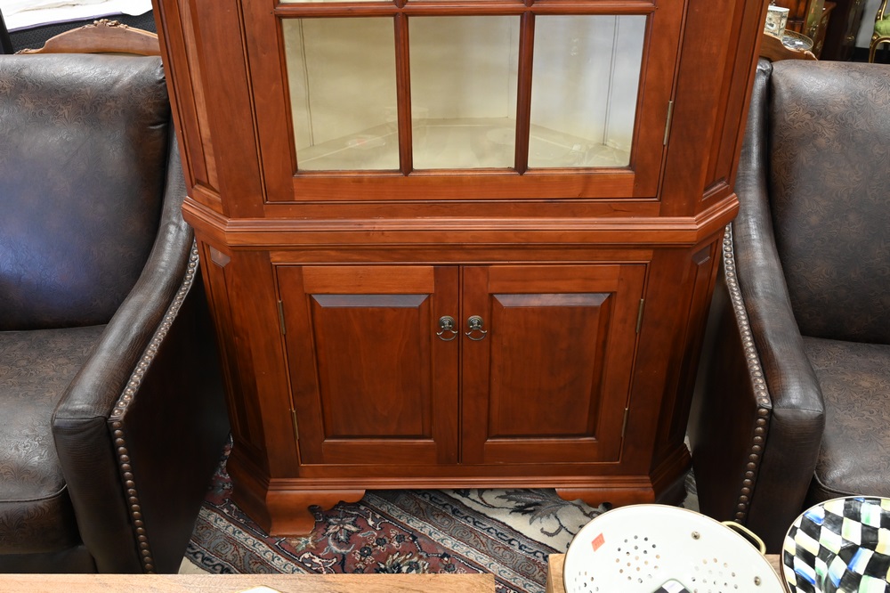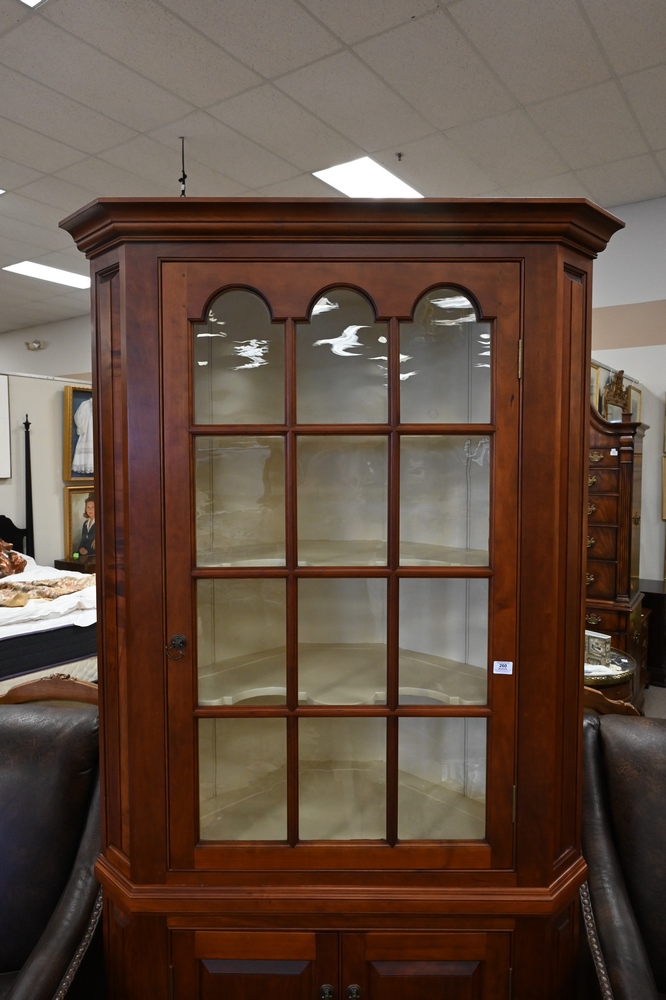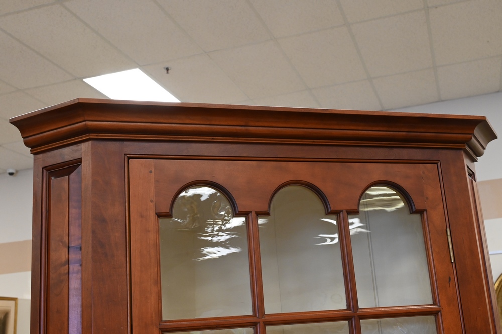 Lot 260: D.R. Dimes Cherry Corner Cabinet, on ogee feet, height 85 1/2 inches, depth on side 24 inches.