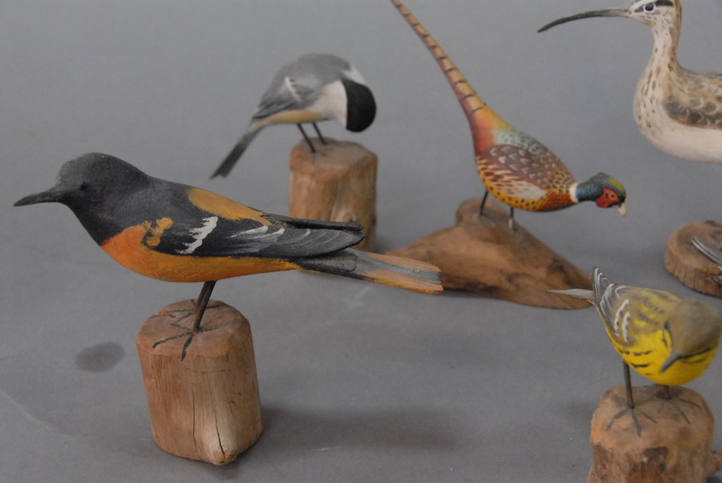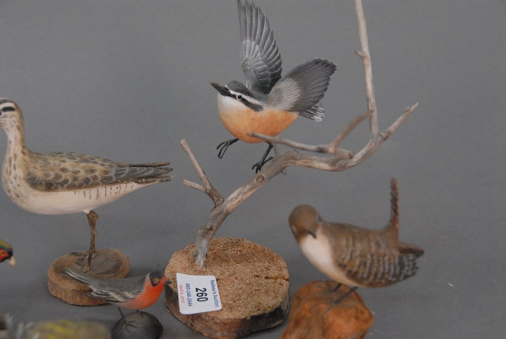 Eight miniature wood birds, various types including Peter Peltz, Stan Sparre and one attributed to A. E. Crowell. ht. 2in. to 8in. Provenance: Estate of Nancy Sachse, Hamden, Connecticut