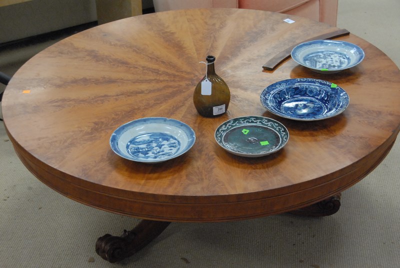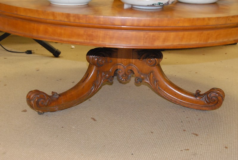 English burlwood breakfast table, cut down to coffee table height. ht. 8 1/2in. dia. 47in.