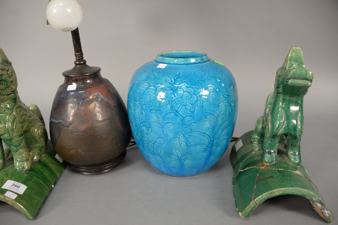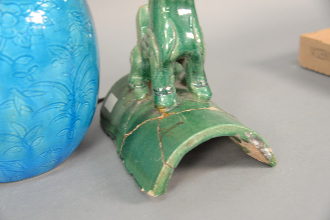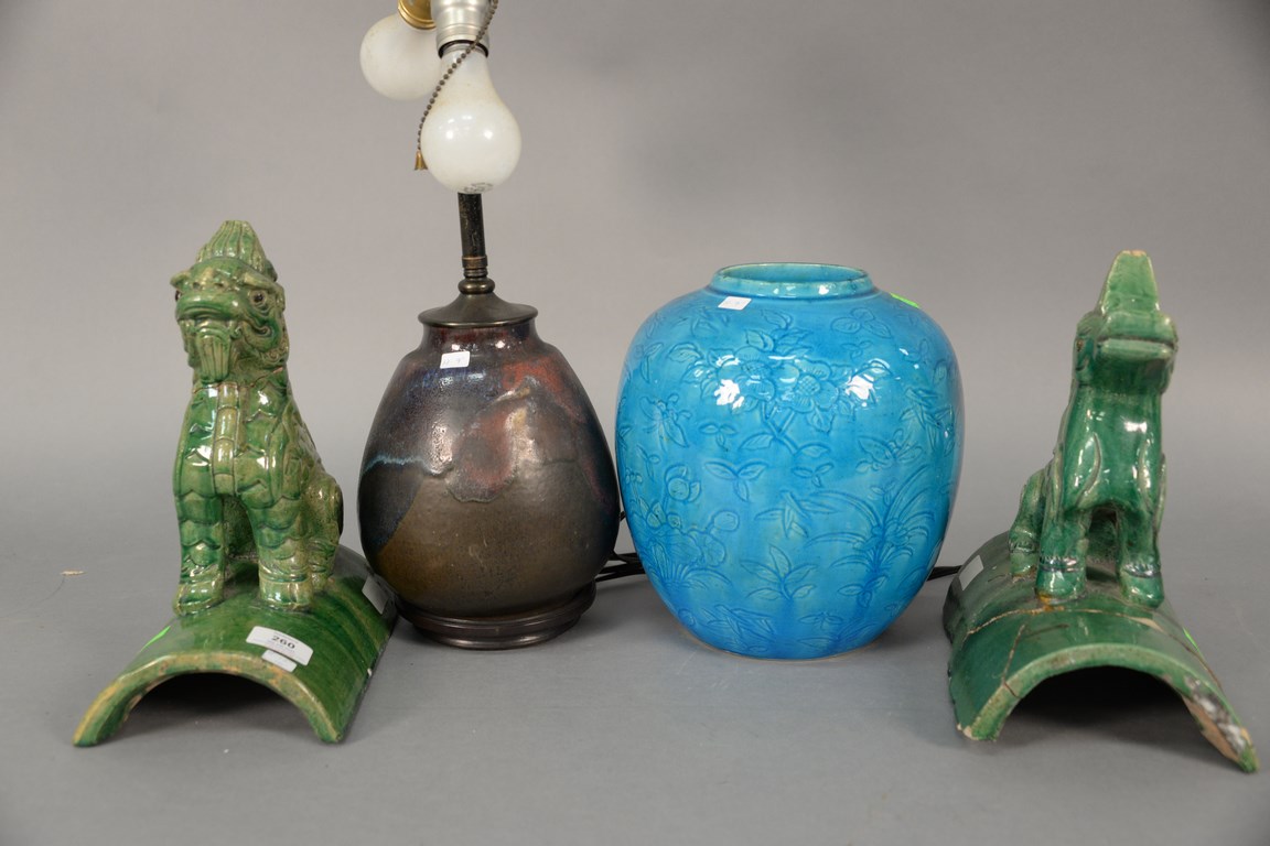 Four Oriental glazed pieces to include a blue glazed vase, two green glazed roof tiles, and flambe glazed vase made into lamp. vases: ht. 9 in. roof tiles: ht. 12 in. lg. 10 in.