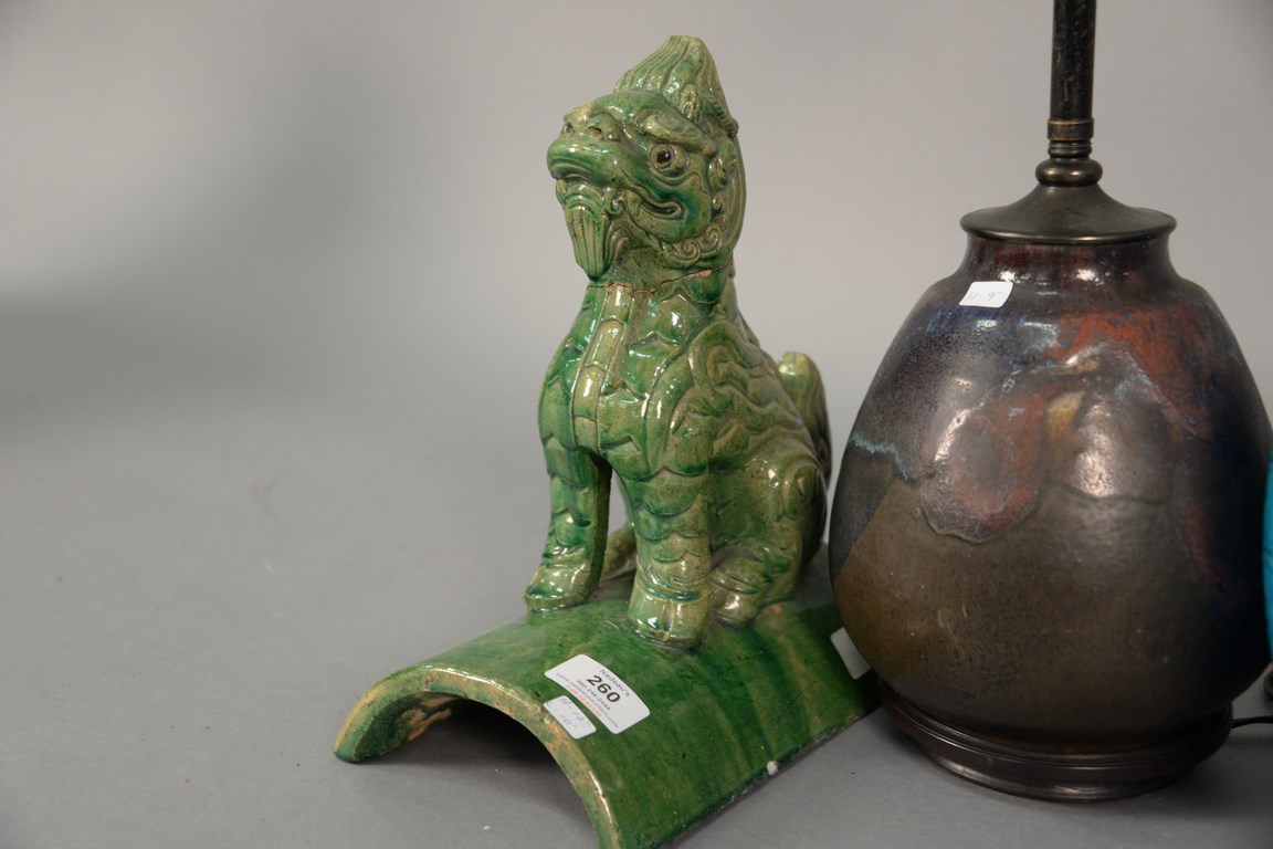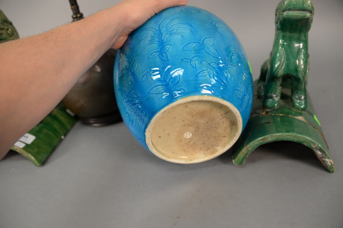Lot 260: Four Oriental glazed pieces to include a blue glazed vase, two green glazed roof tiles, and flambe glazed vase made into lamp. vases…