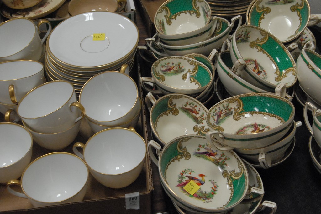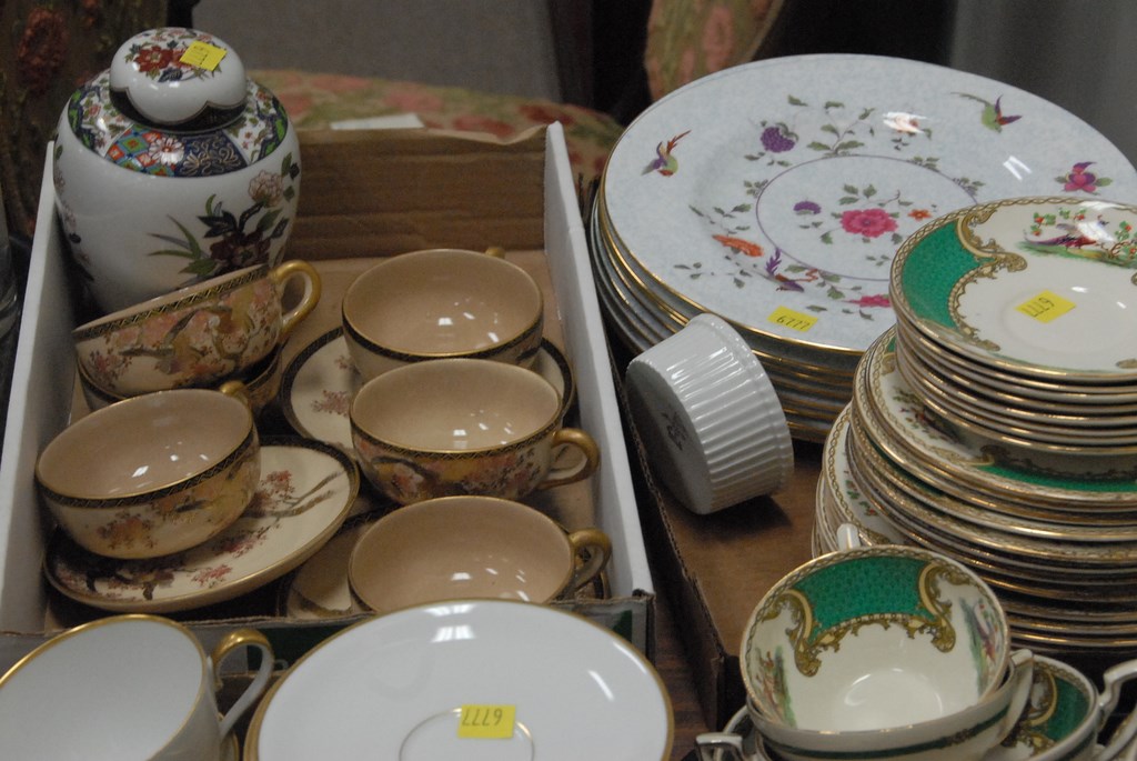 Lot 260: Four tray lots: six Satsuma cups and three saucers, partial set of Myott Staffordshire, Crown Staffordshire bone china dinner plates.