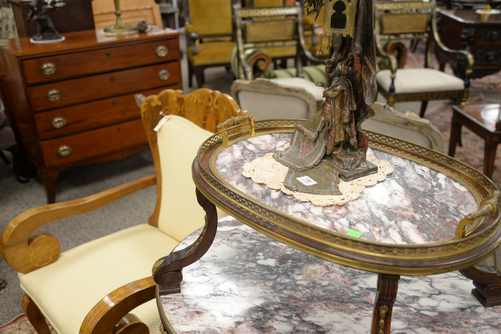 Lot 260: French Style Mahogany Pastry Table having removable top marble tray, with bronze gallery, gilt mounts, and handles, in the manor of Francois Linke, height 47 inches, width 33 inches, top 26 x 33, small crack in large marble.