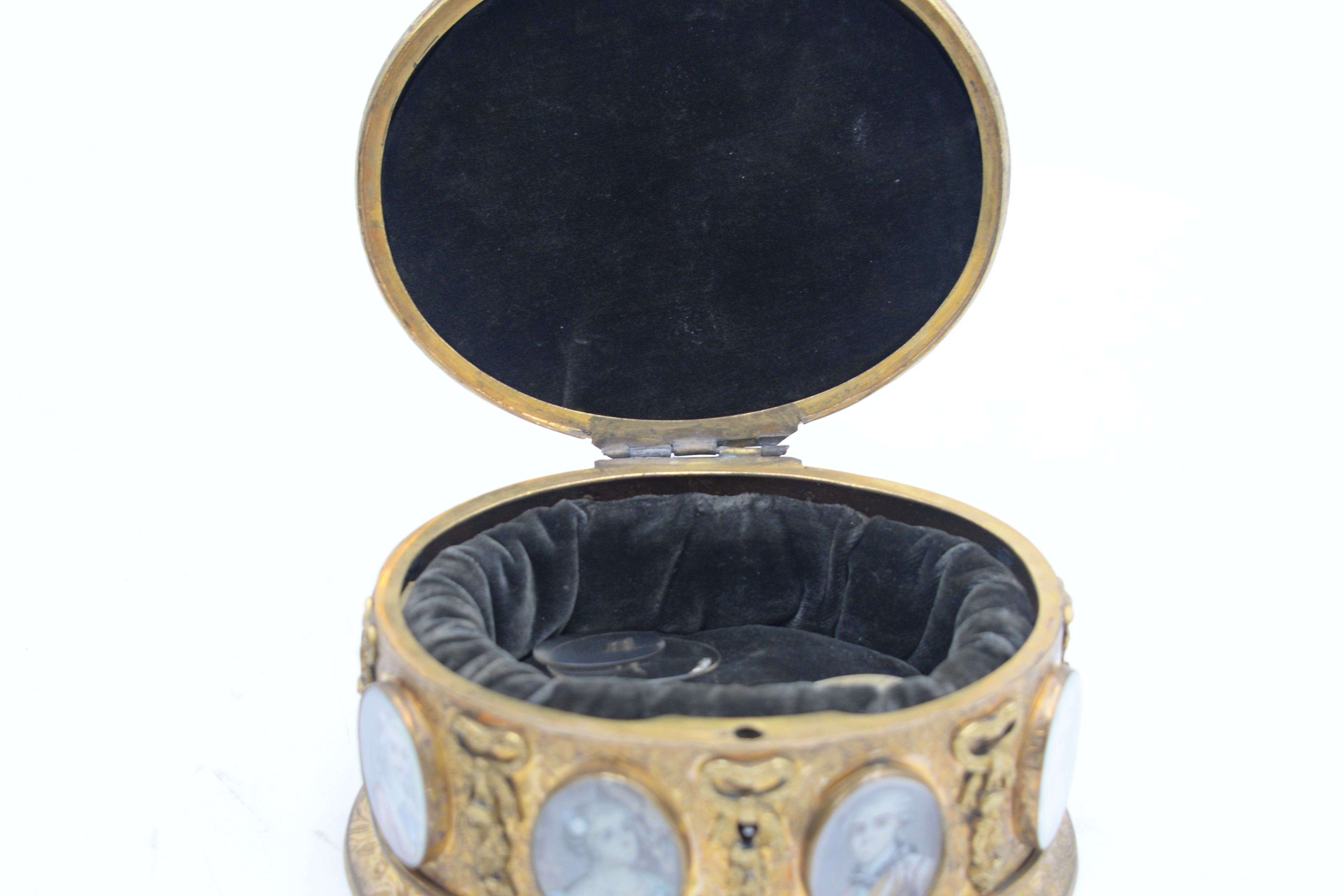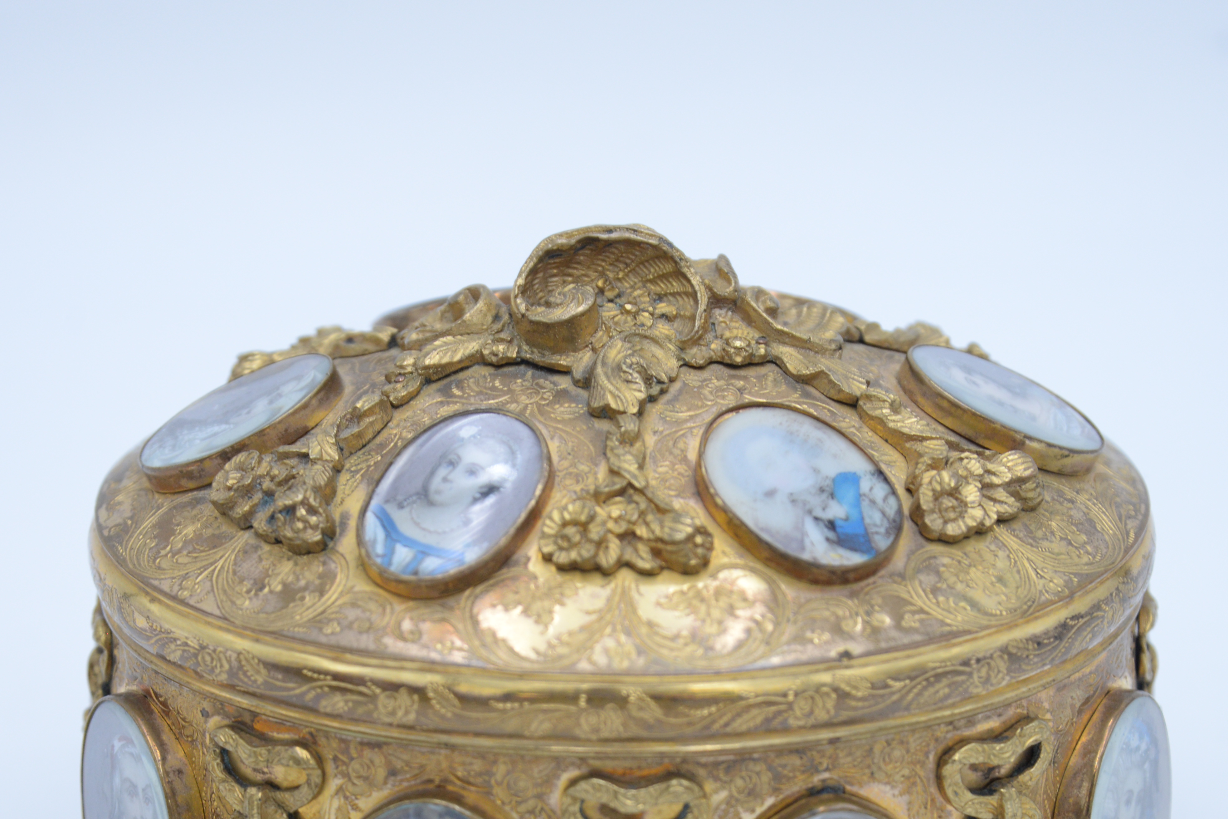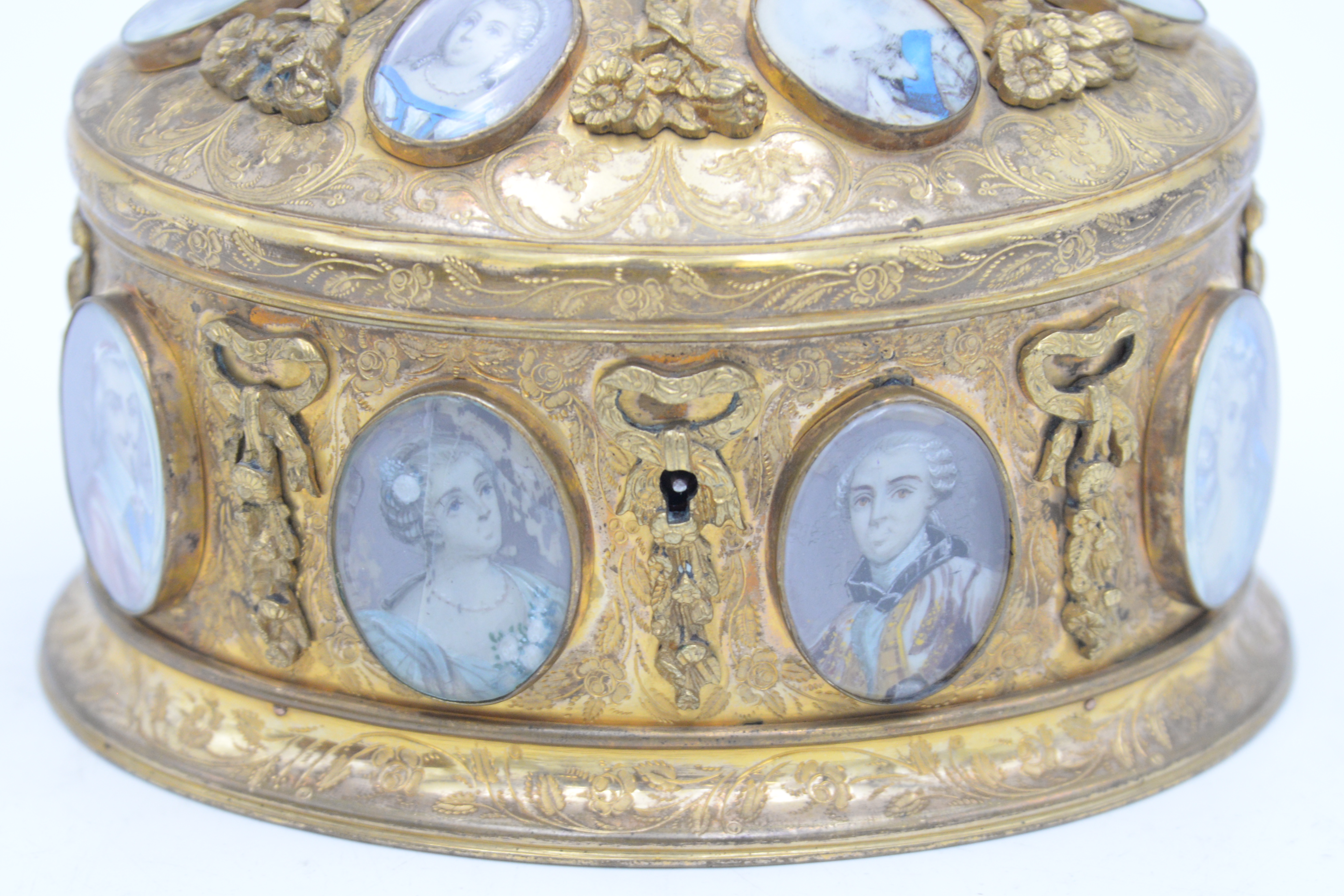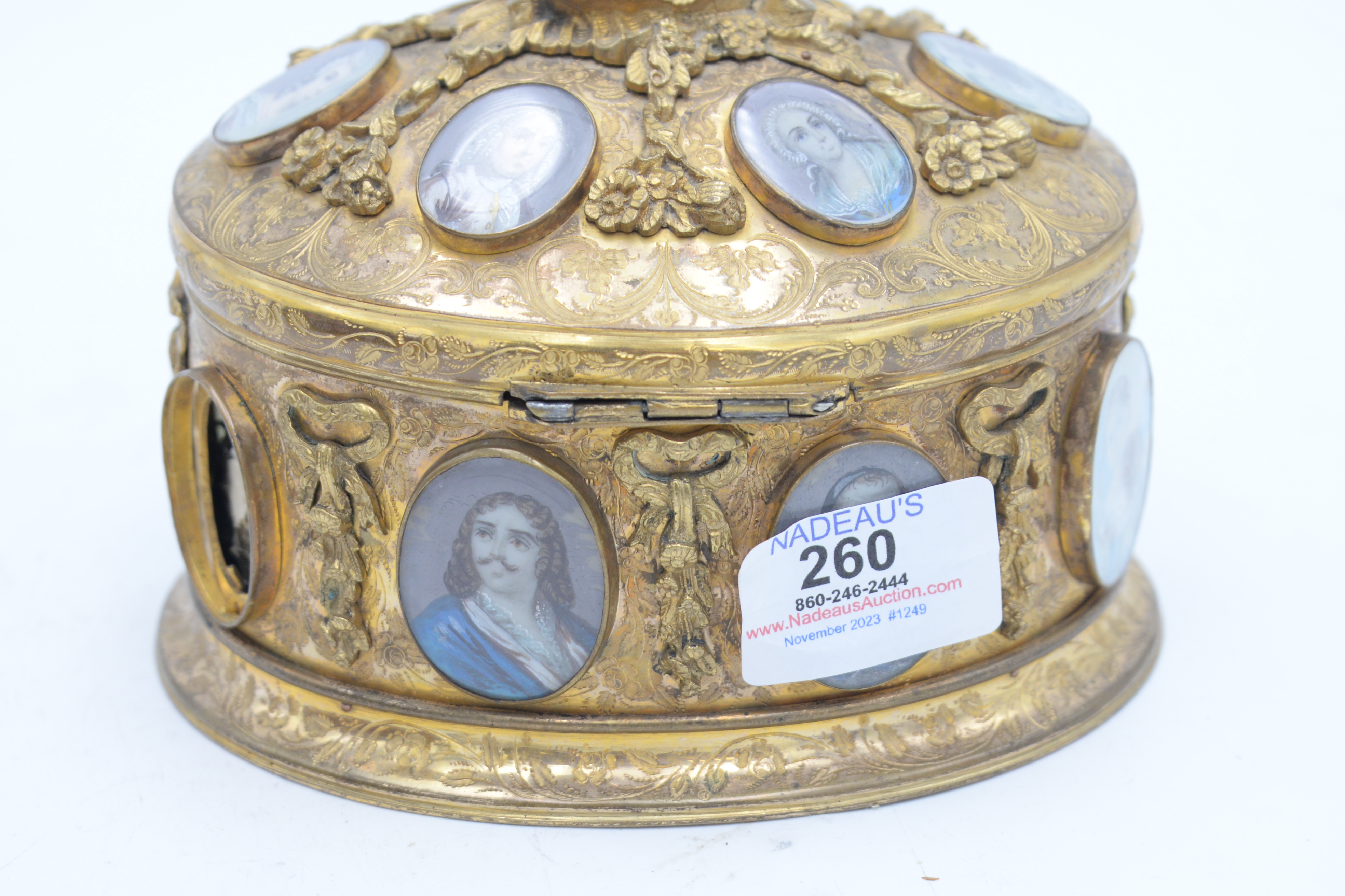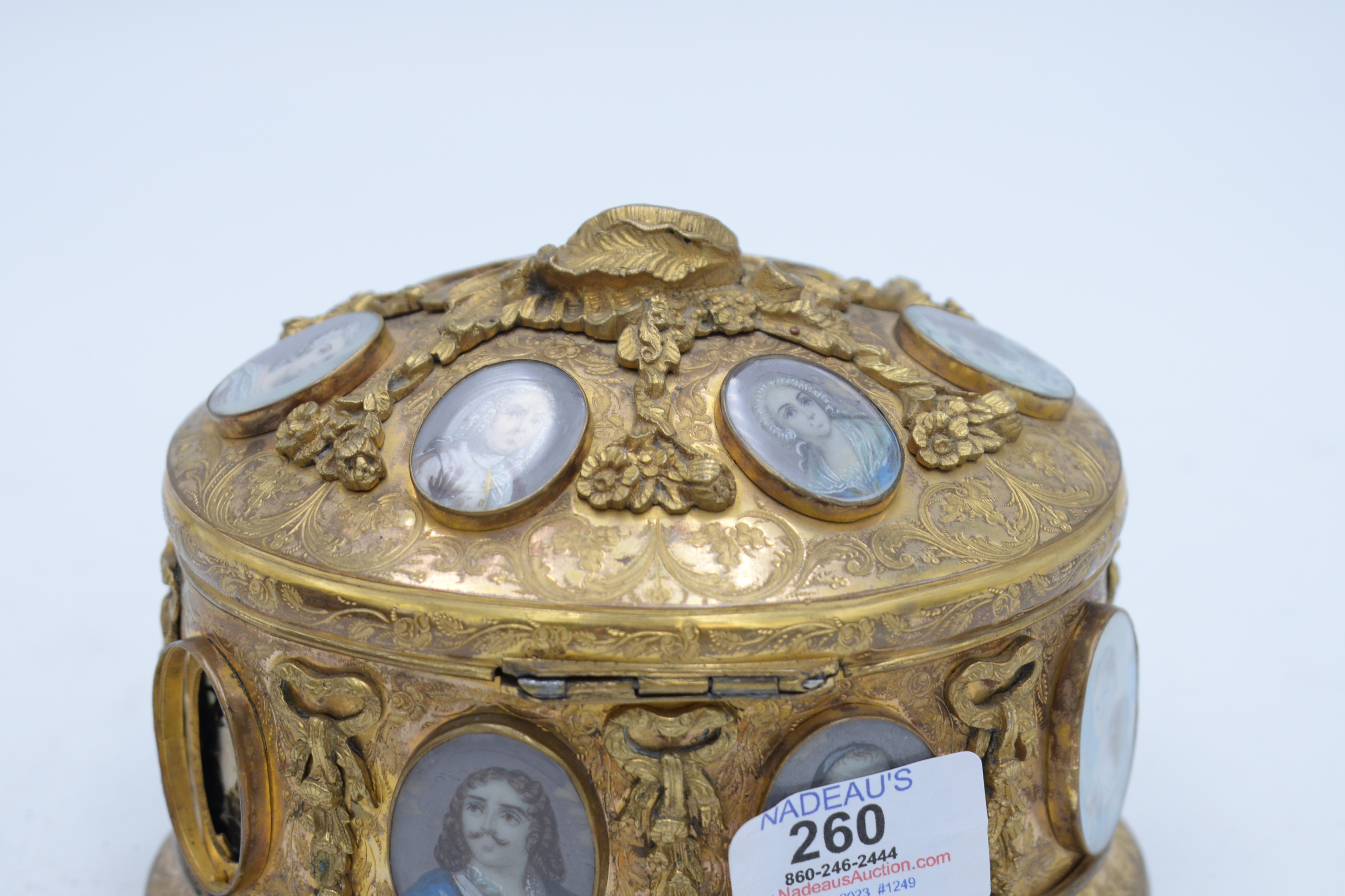 Gilt Bronze Jewelry Box, having 14 miniatures of famous people early, 19th century or later, possibly Alphonse Tahon Paris 1830-1880, height 5 inches, length 6 inches