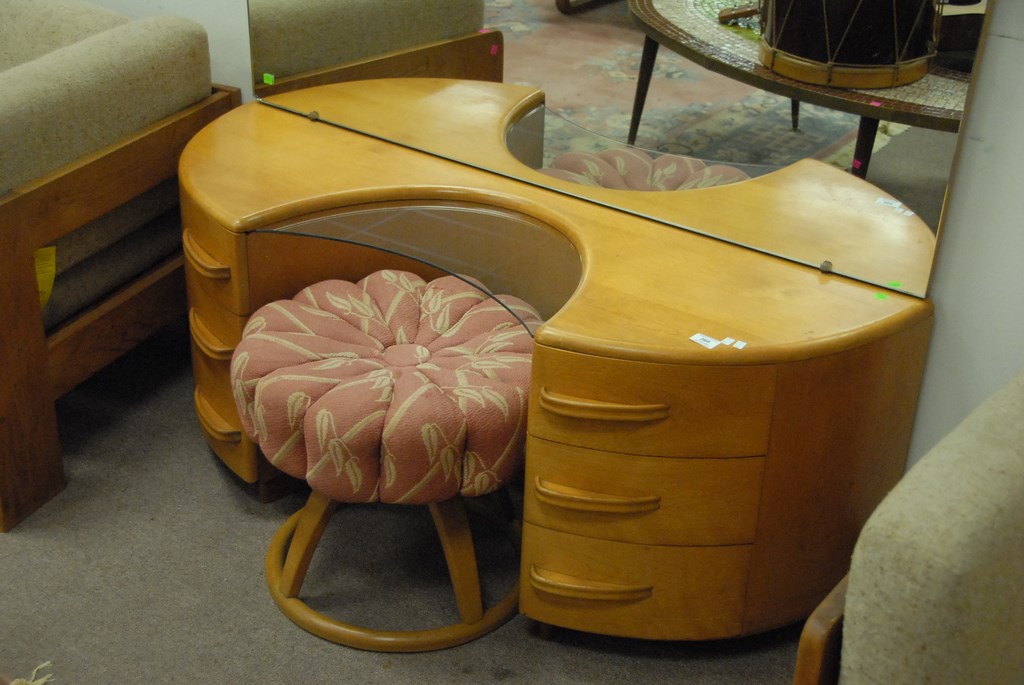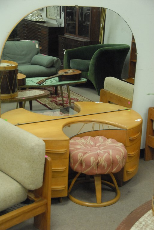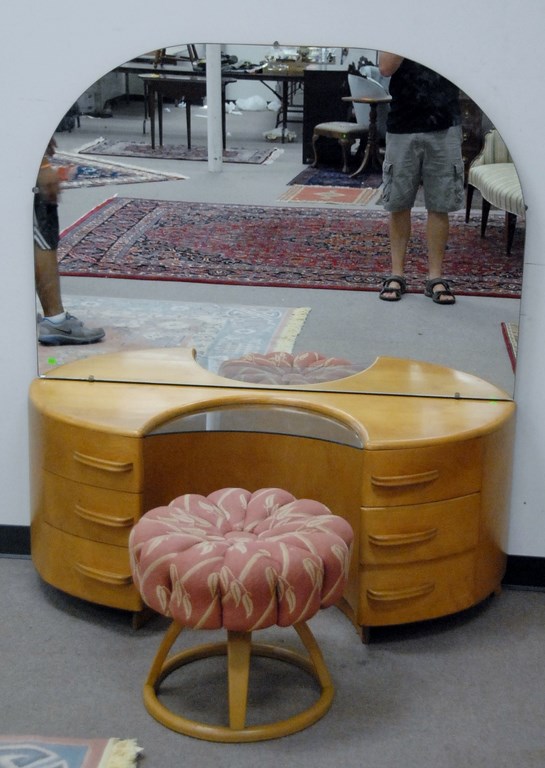 Heywood Wakefield vanity with mirror and Pouffe stool, ht. 58in. wd. 53in.