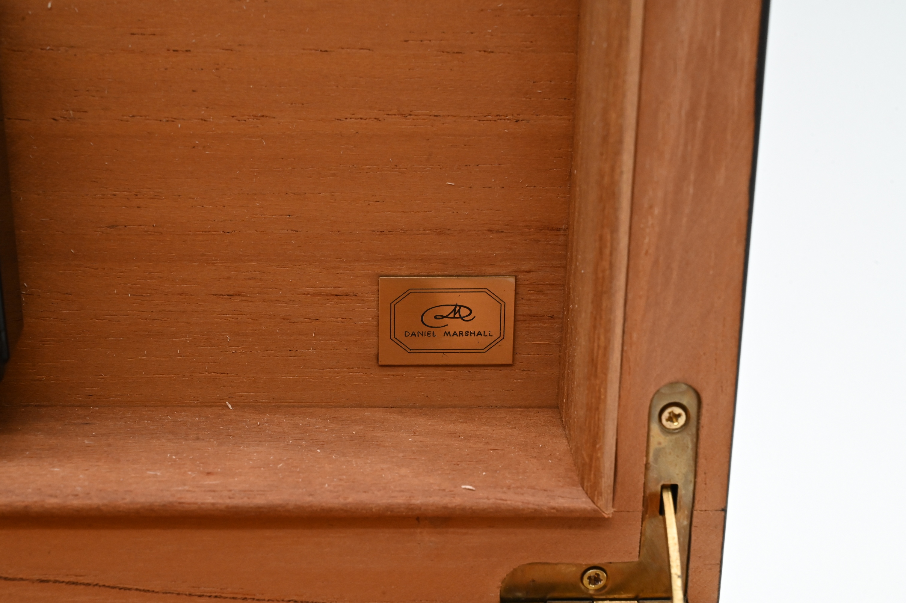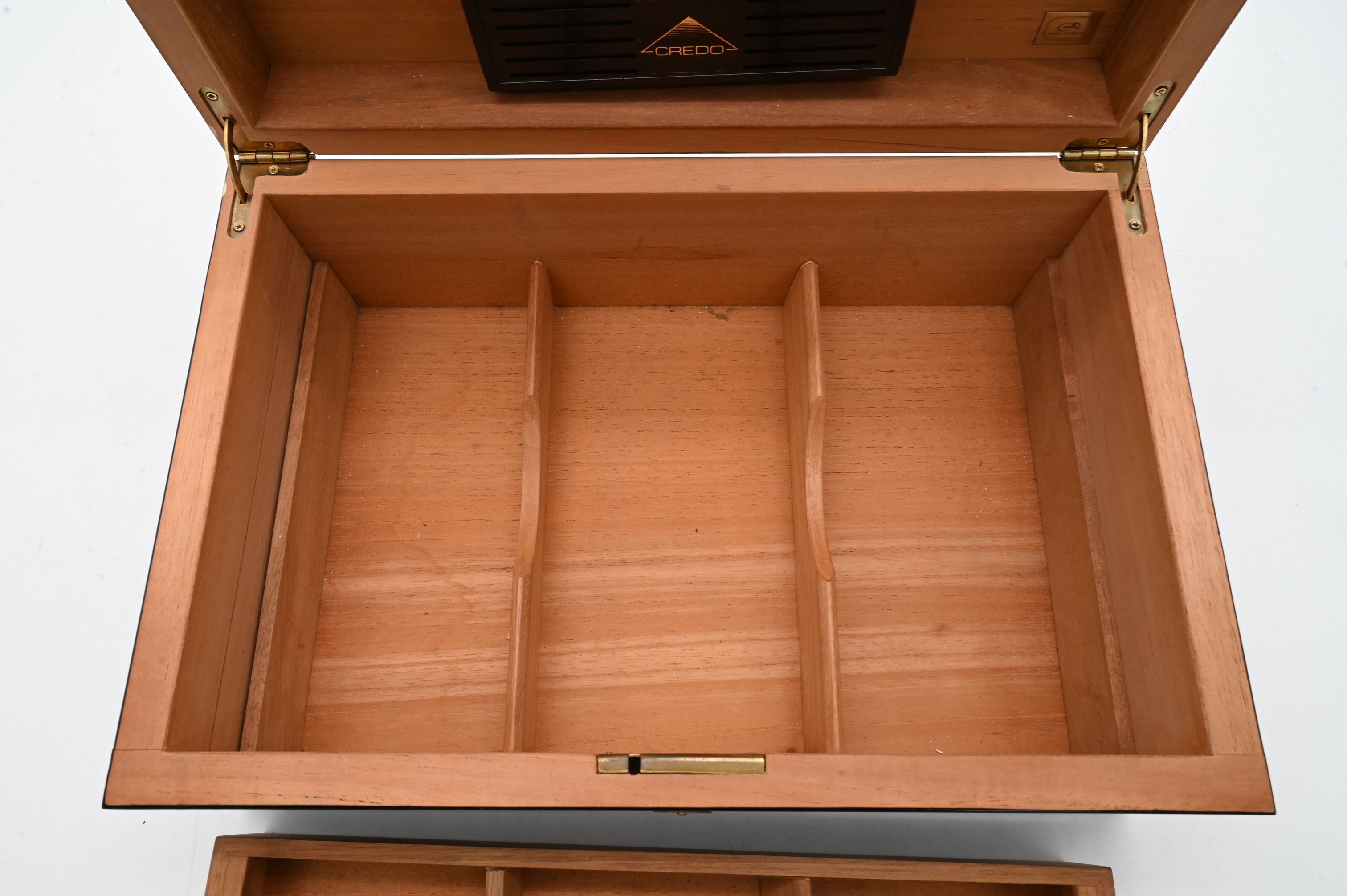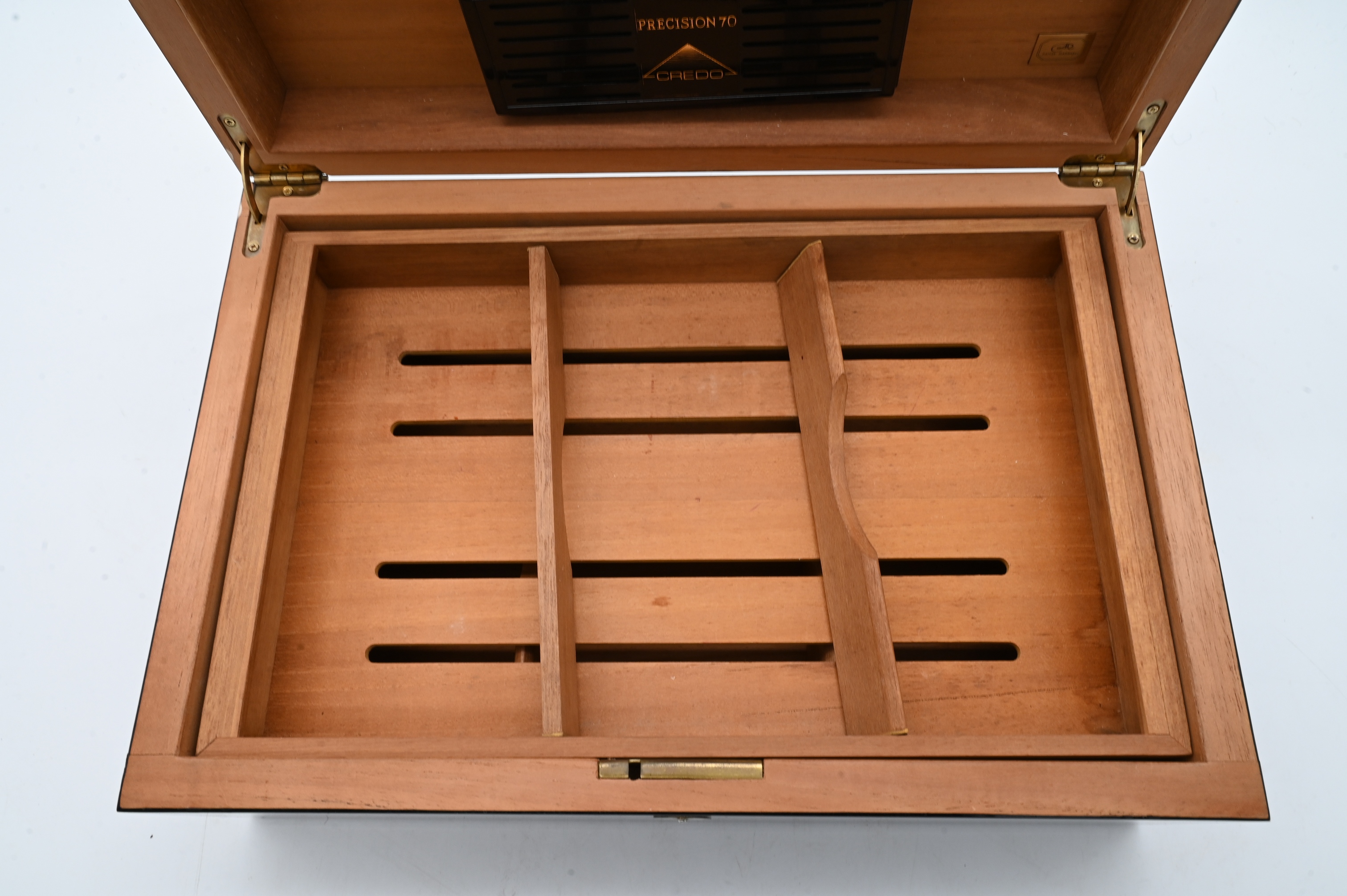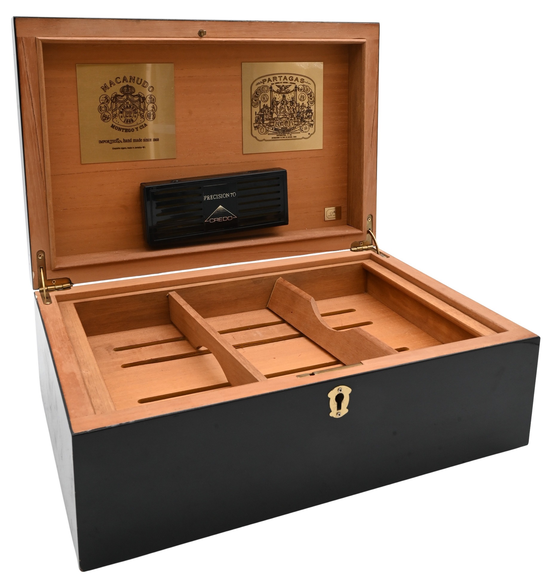 Rectangular black-finished case having brass escutcheon, the interior fitted with slatted tray, adjustable divider, and Credo humidification unit, the lid inset with Macanudo and Partagas plaques