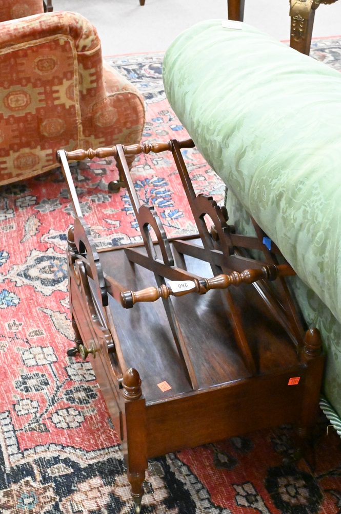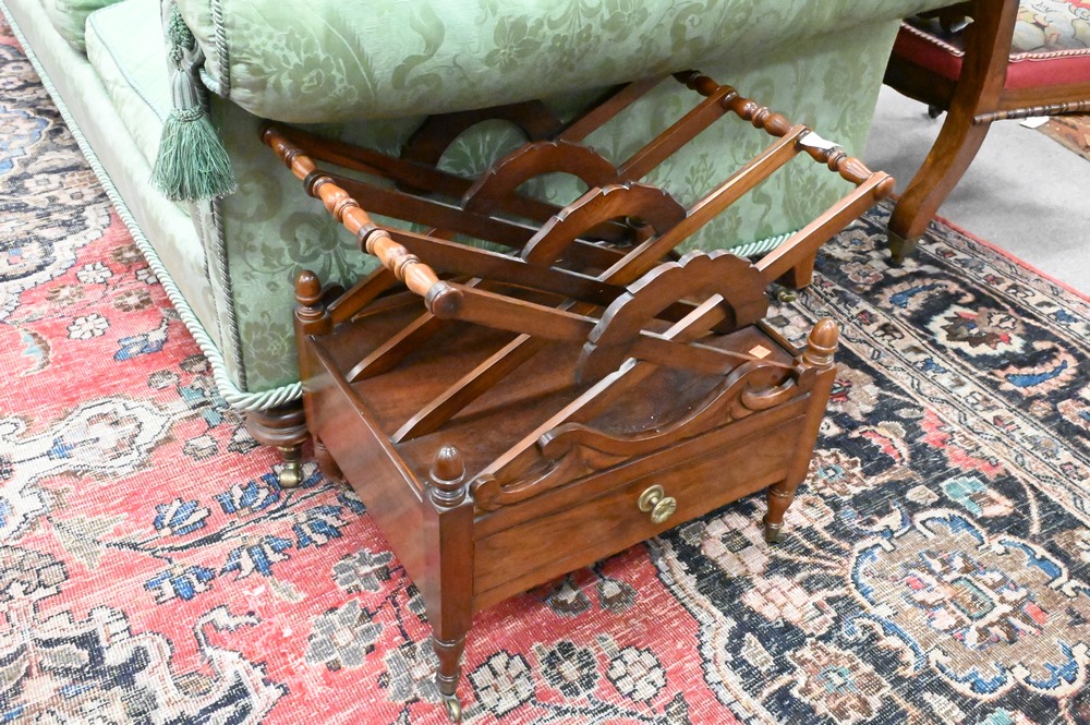 Regency Rosewood Canterbury, having one drawer, 19th century, missing one castor, height 19 inches, width 19 inches.