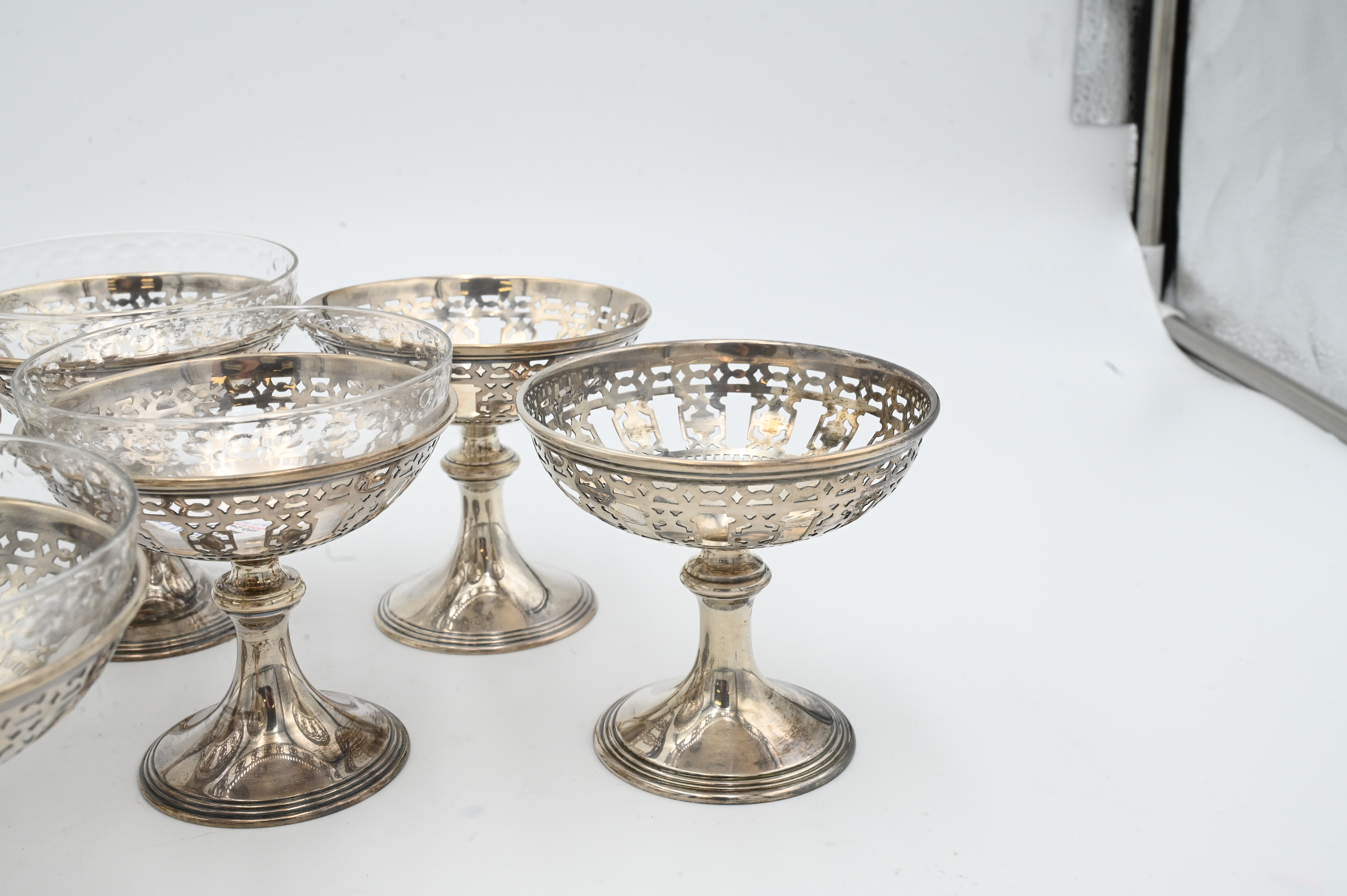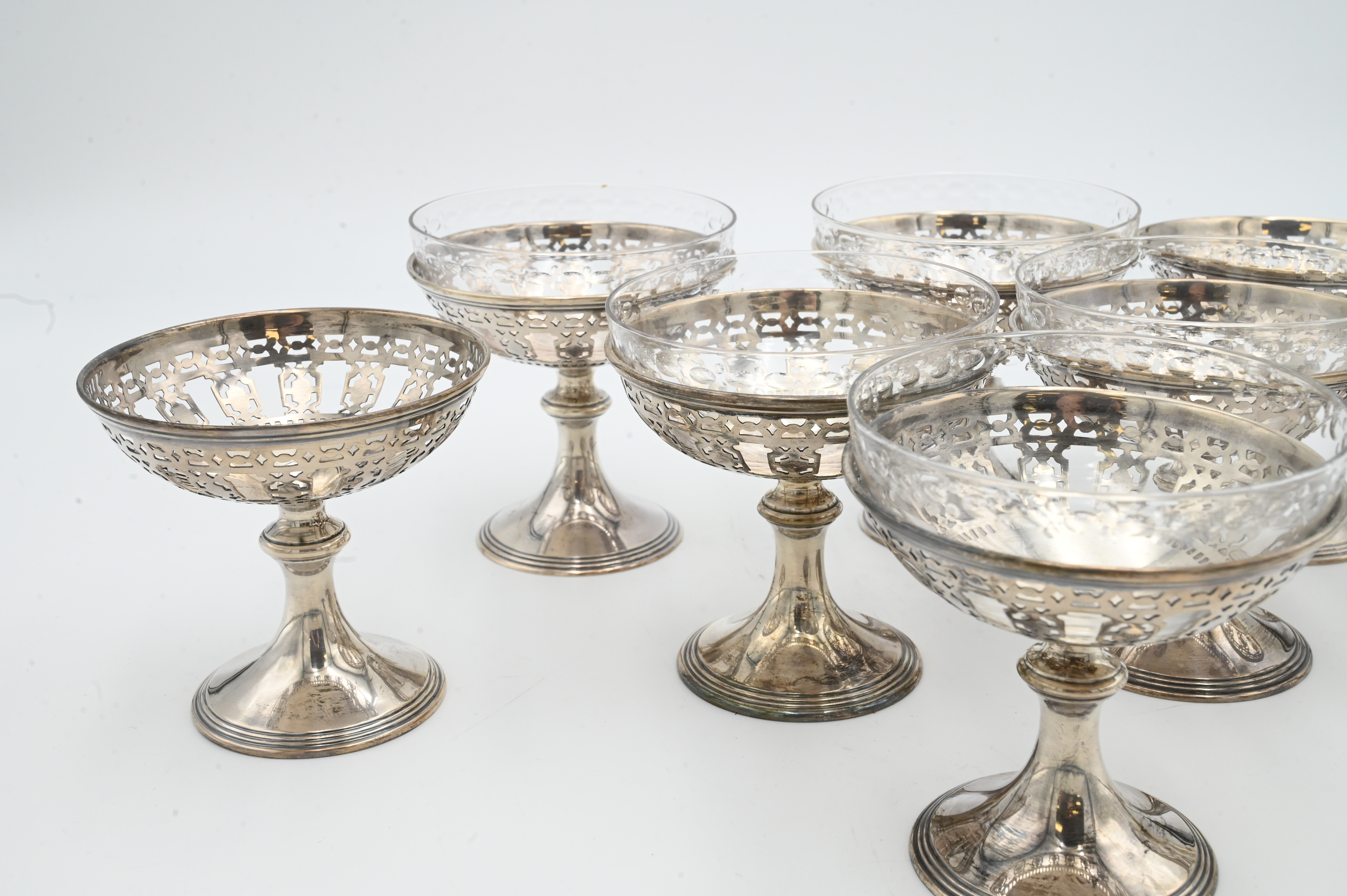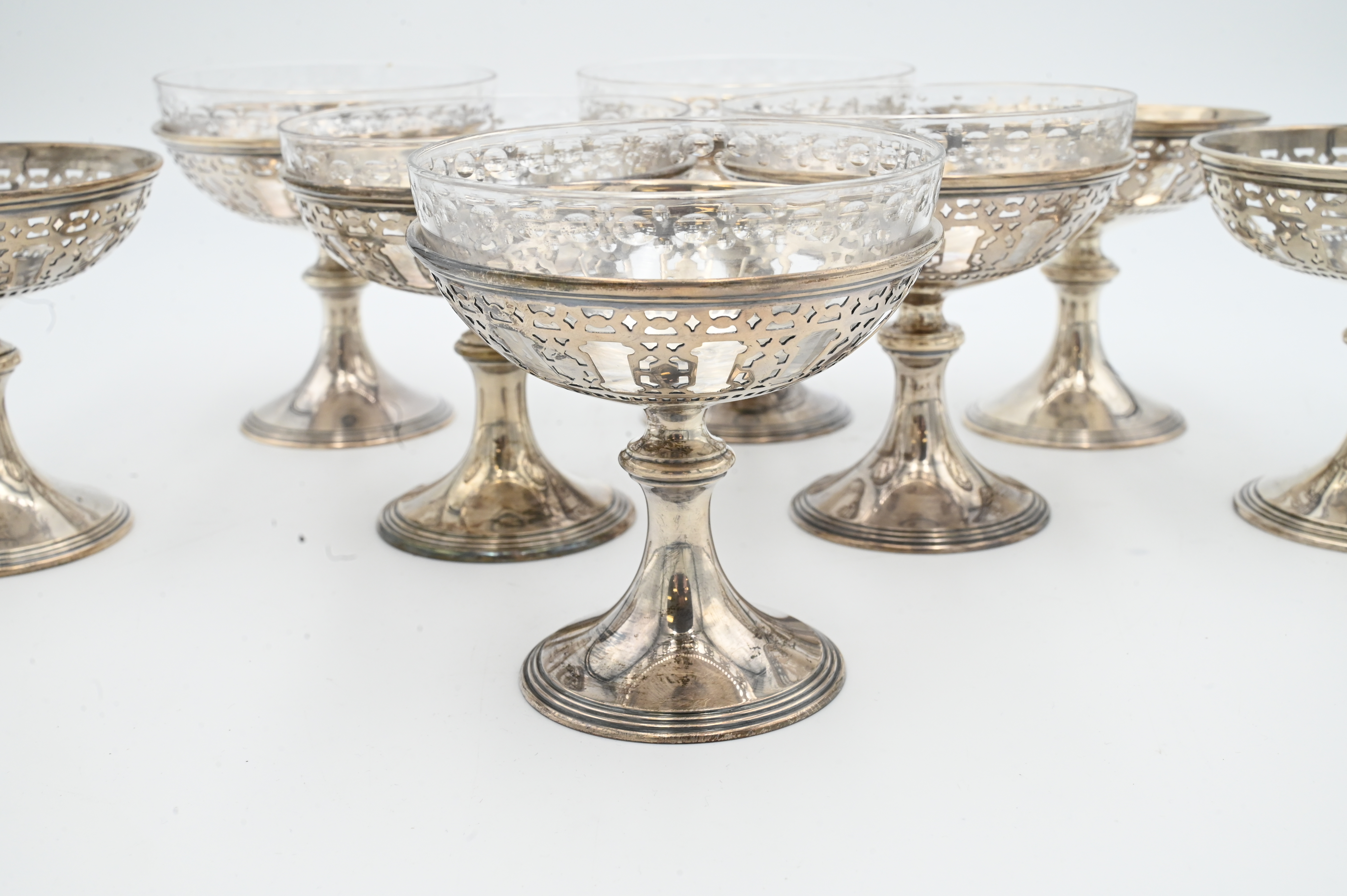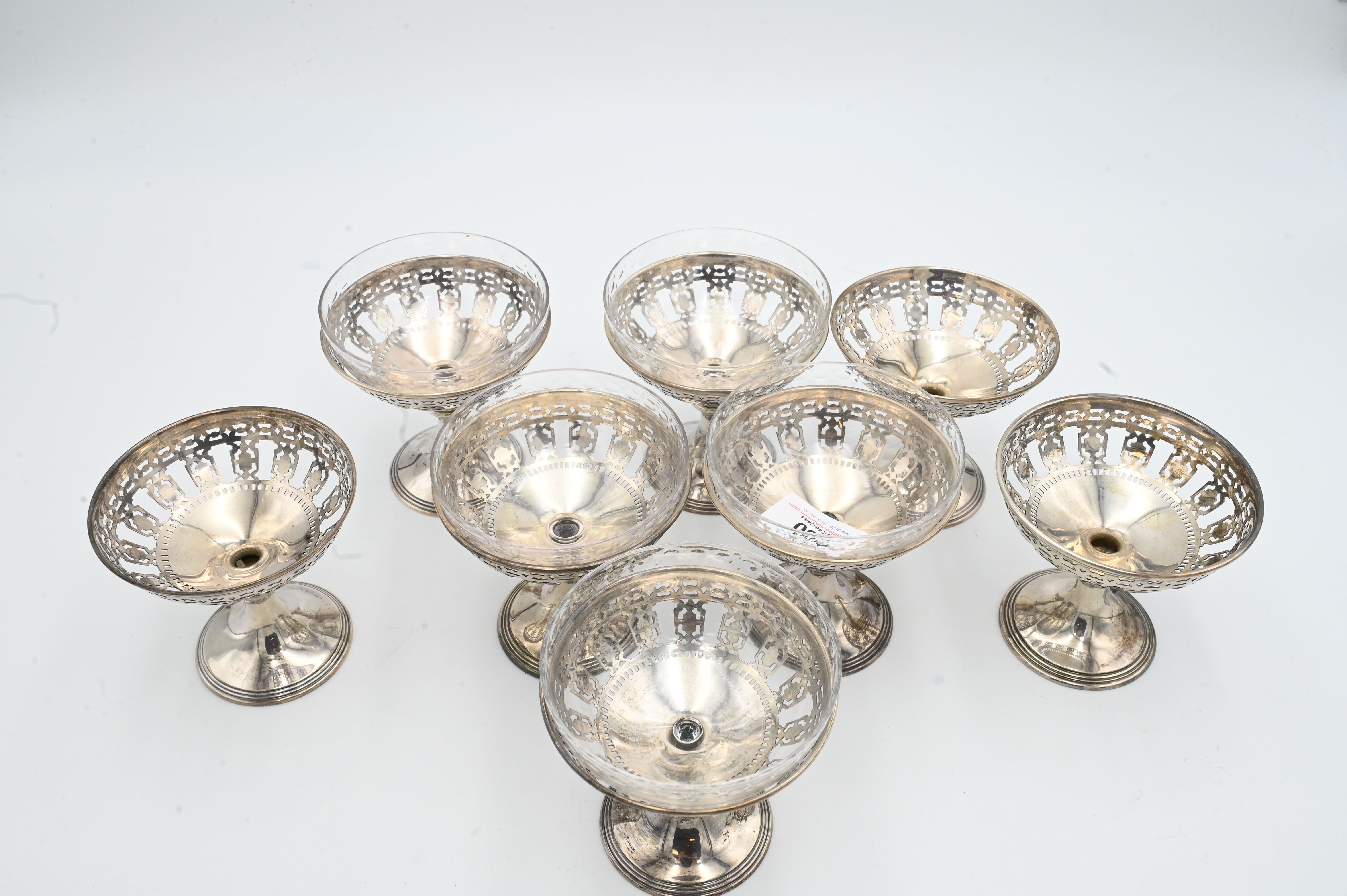 Set of Eight Tiffany and Company Sterling Silver and Glass Champagne Canapes, missing three glass liners, height 3 3/4 inches, 22.8 t.oz.