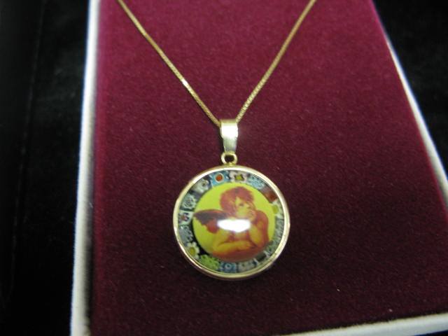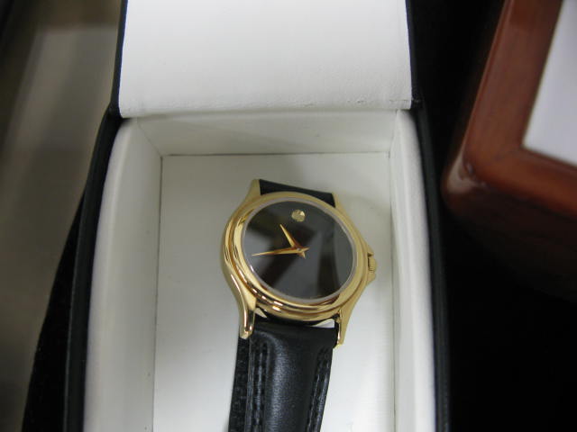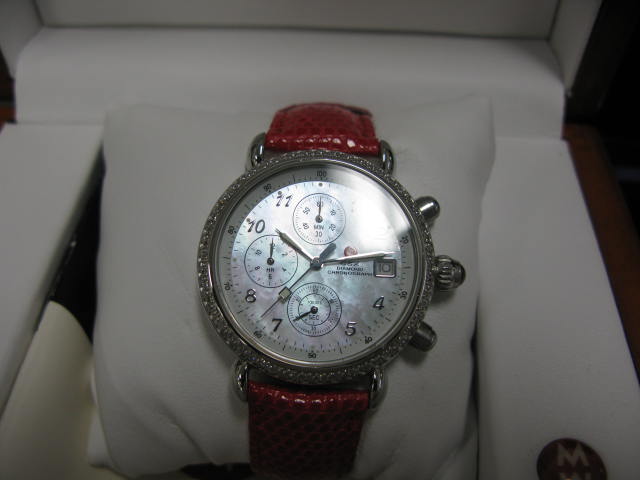Small grouping to include two ladies watches, one Movado, one Michele with 100 small diamonds, two gold chains with putti pendants