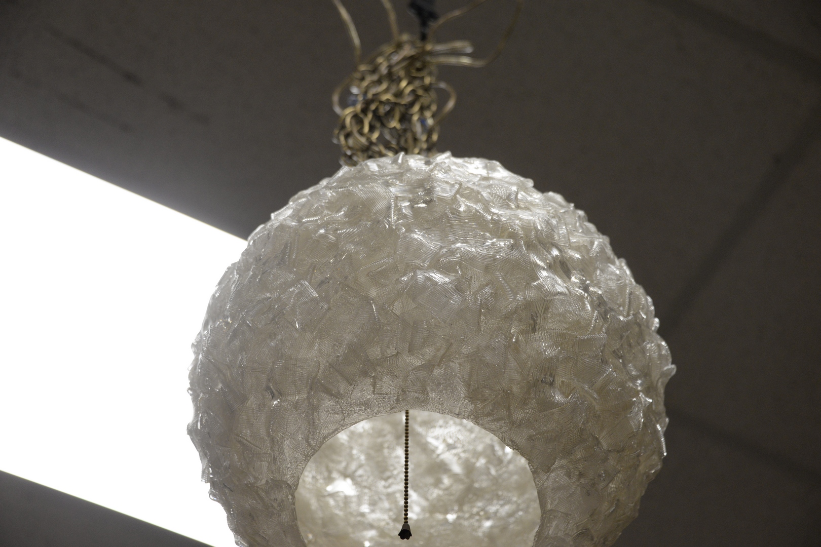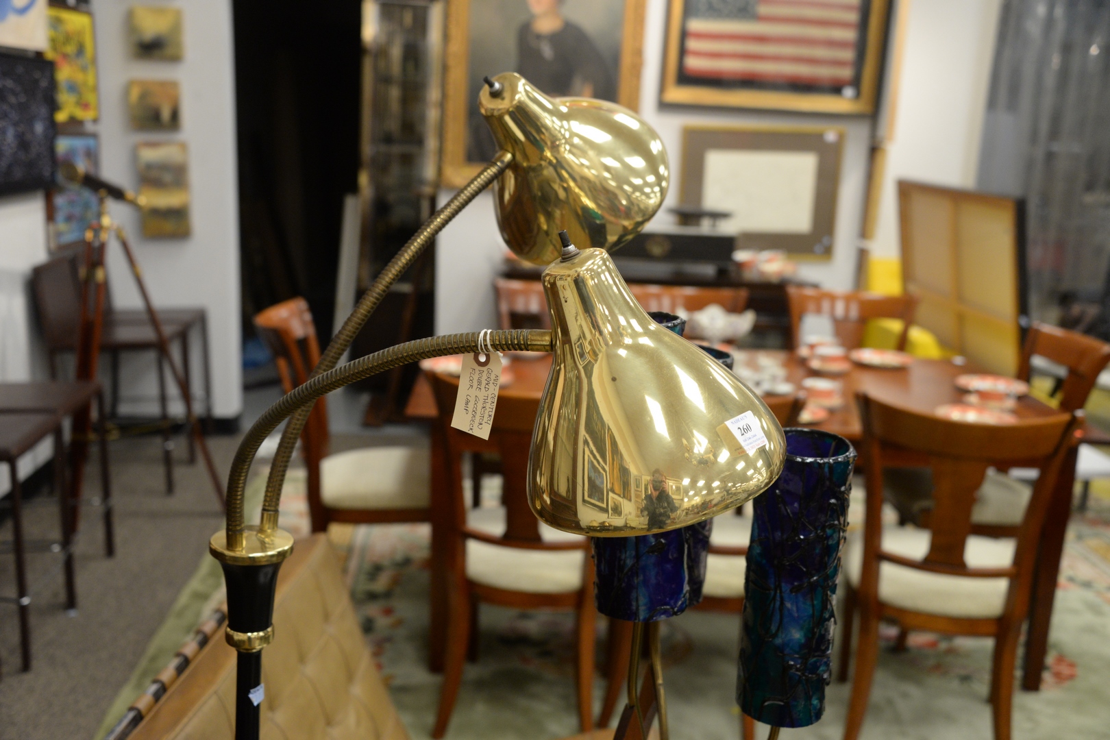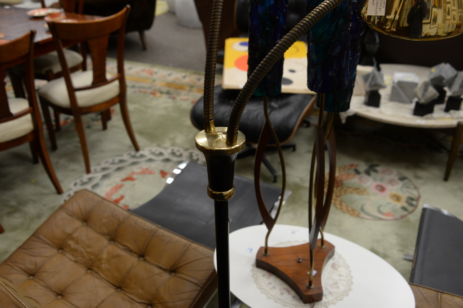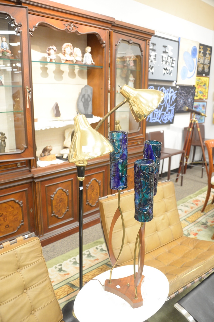 Lot 260: Three Piece Lot to include Gerald Thurston Double Gooseneck Floor Lamp, height 61 inches ; along with a Mid-Century table lamp with three lights, and round acrylic hanging light.