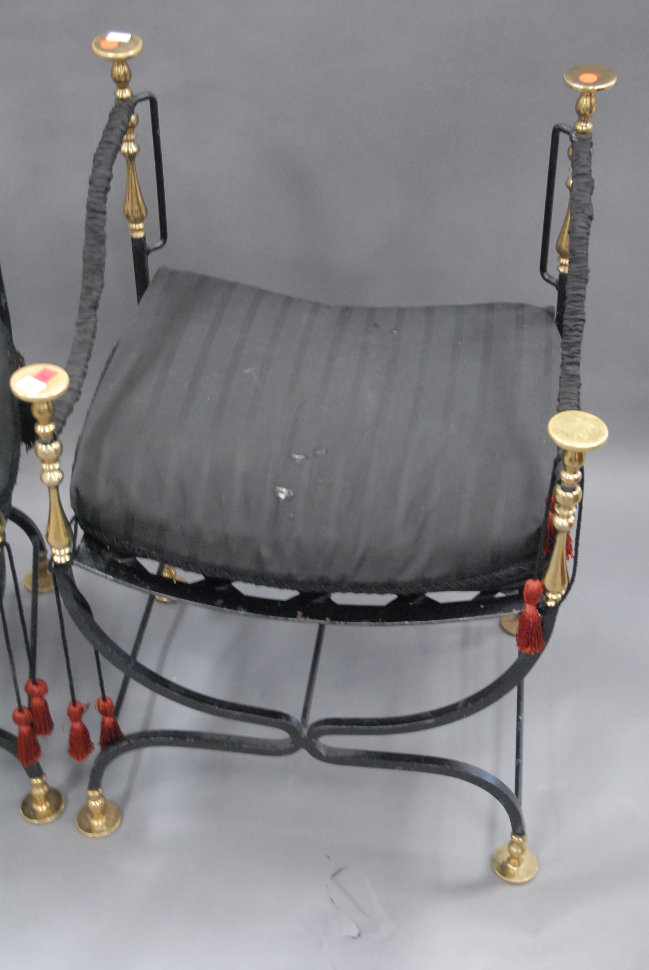 Two iron benches with brass trim