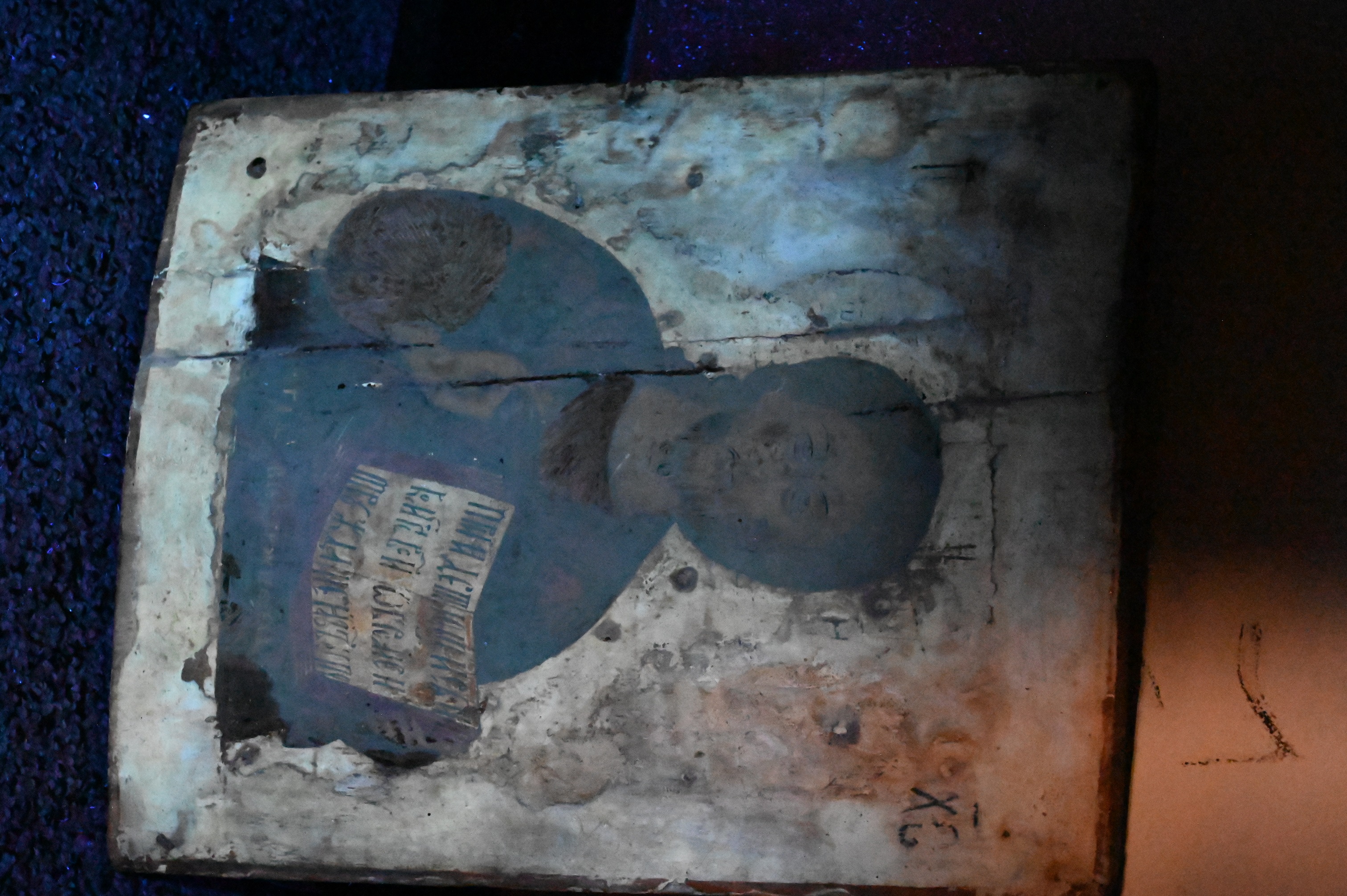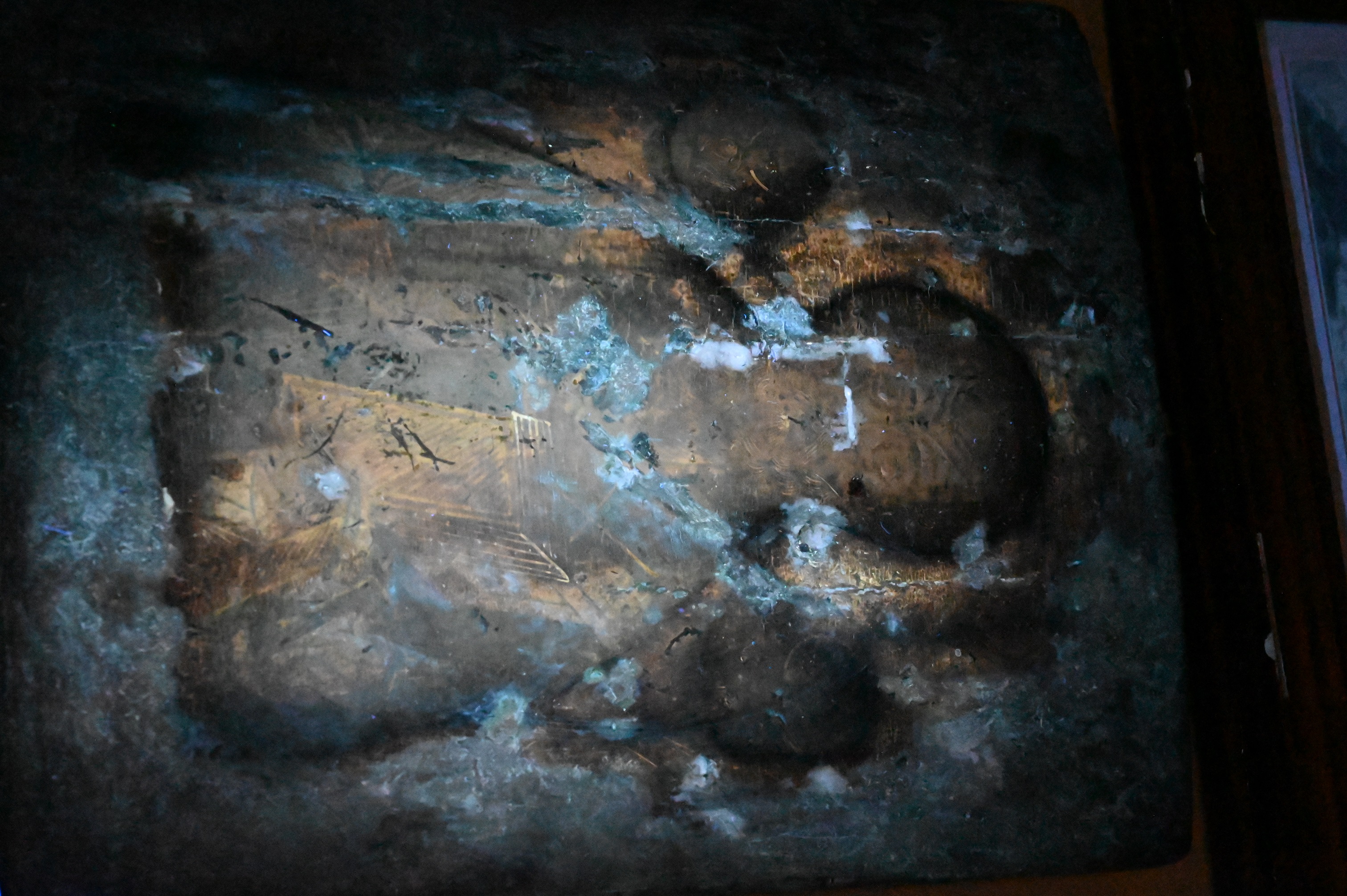 Black light: heavy varnish, heavy inpainting and restoration work throughout, see photos