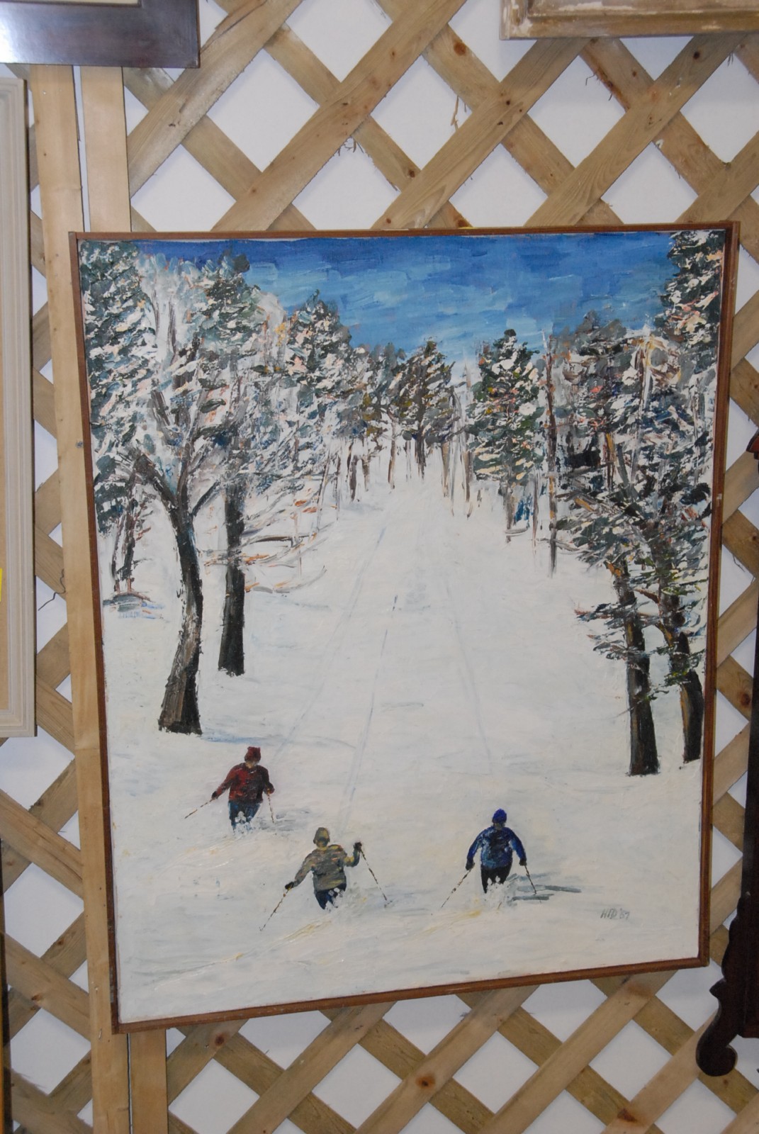 2 oil on canvas winter scenes, one of skiers, one of river and landscape