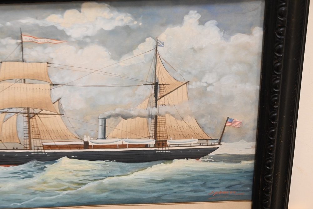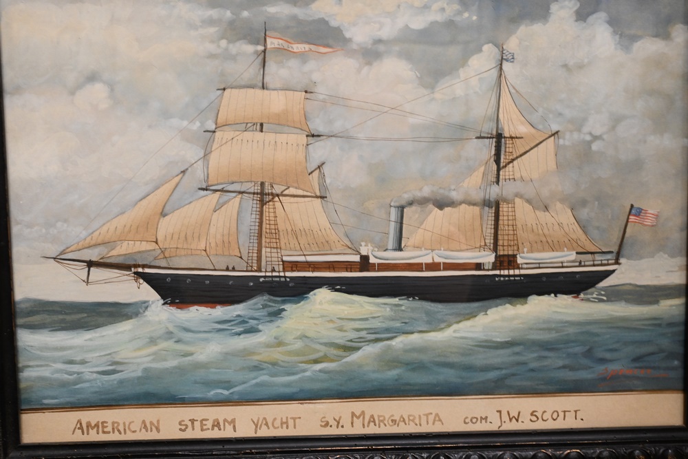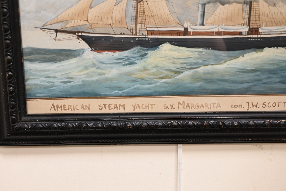 Lot 261: American School 19th century “American Steam Yacht S.Y. Margarita Com. J.W. Scott” watercolor and gouache on paper signed lower right “Spencer” and titled along the lower edge 19th century sight size 12 x 18 inches 2003 Sander American Antiques sales receipt $2,000