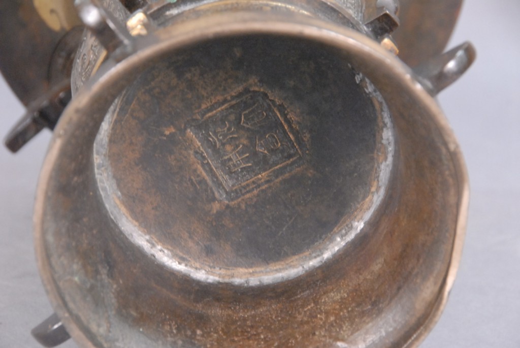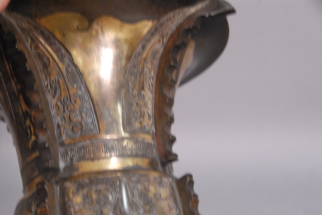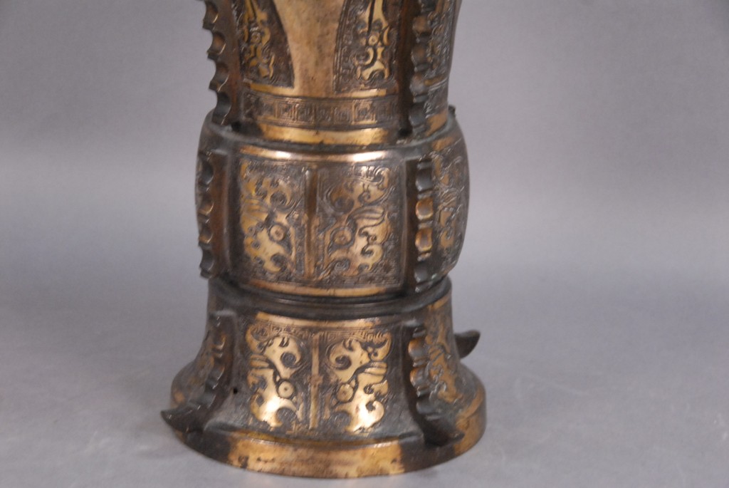Lot 261: Bronze archaic style vase with gold decoration on bronze, signed on bottom, 18th – 19th century, ht 10.