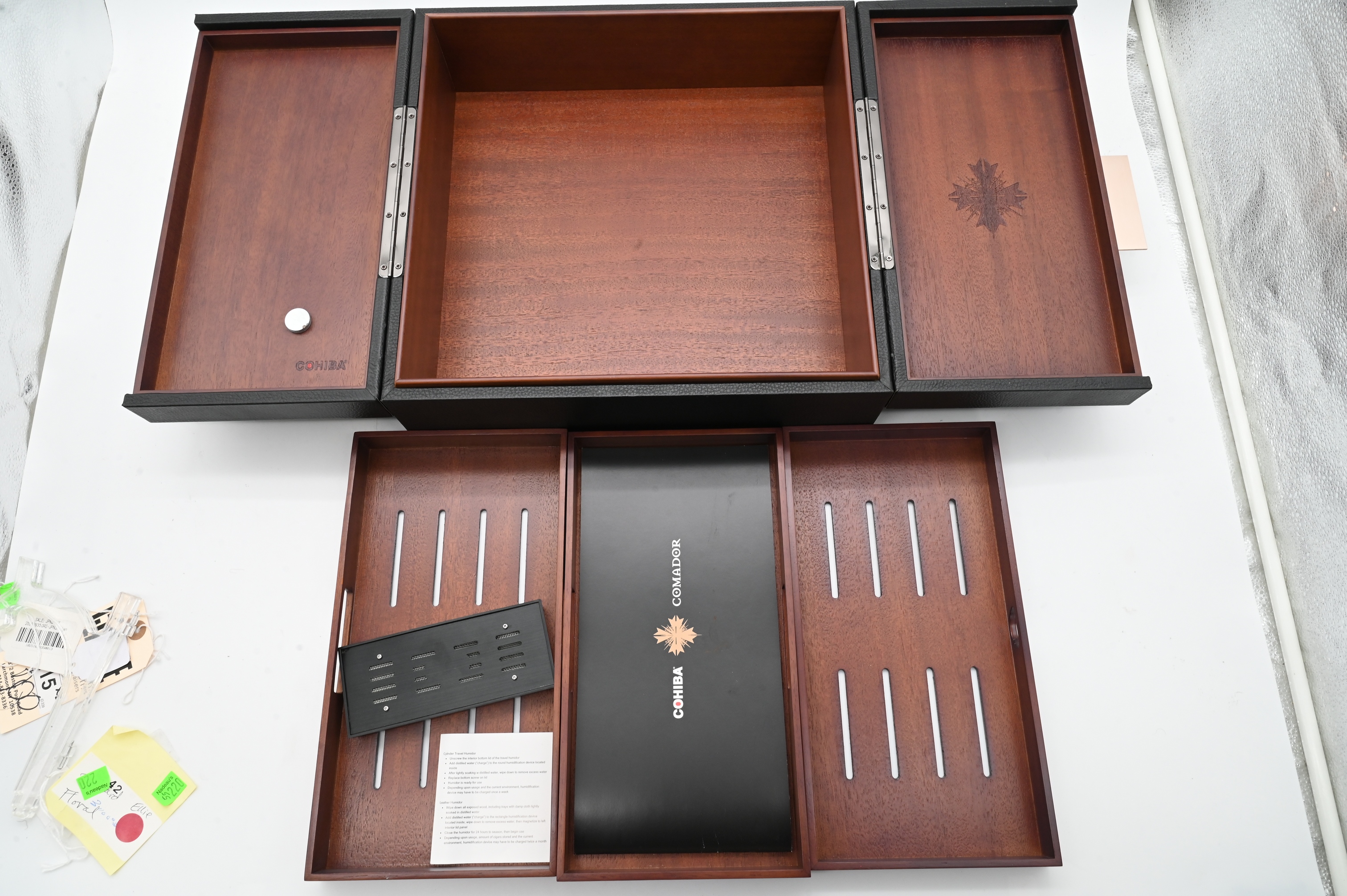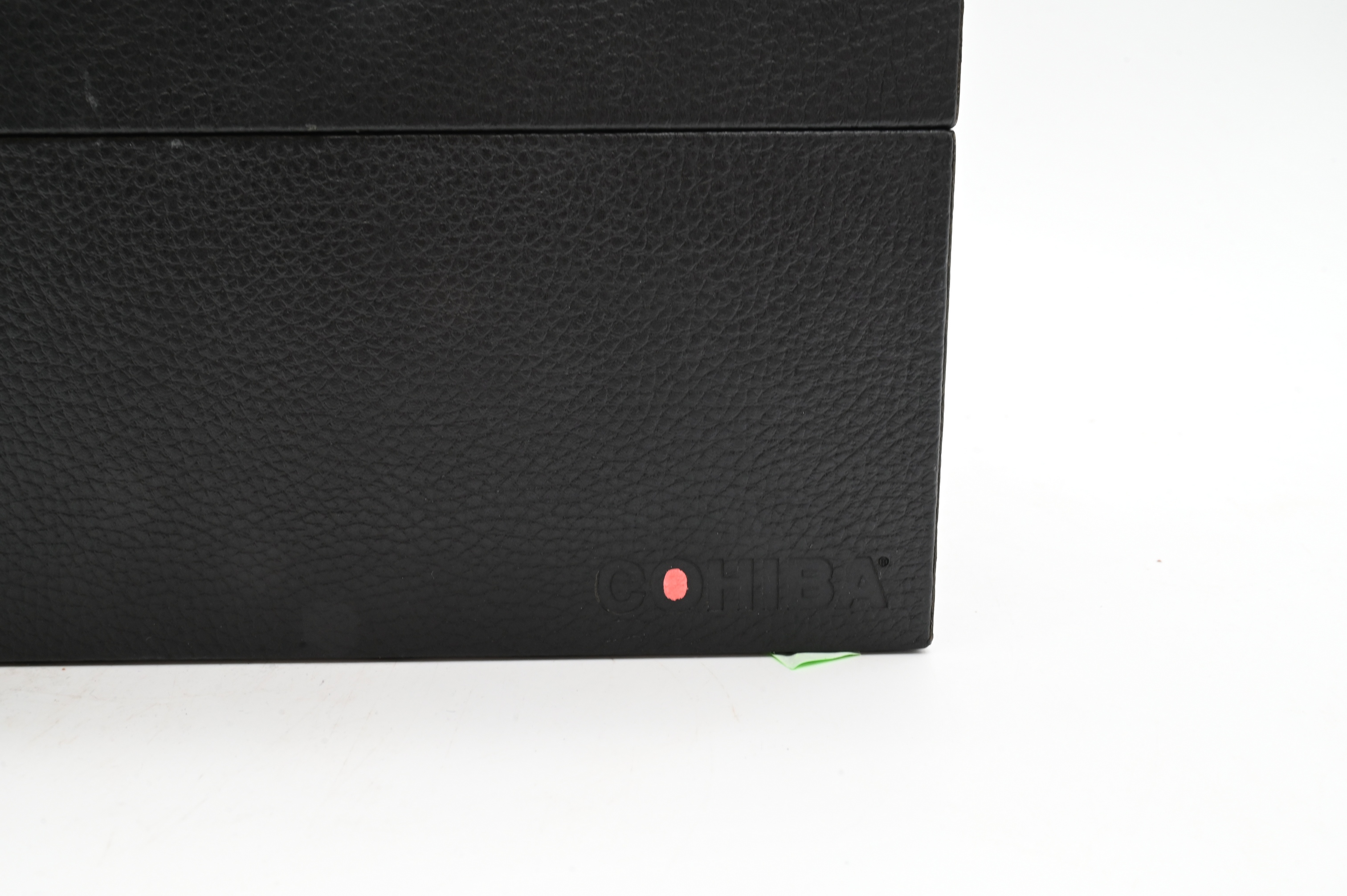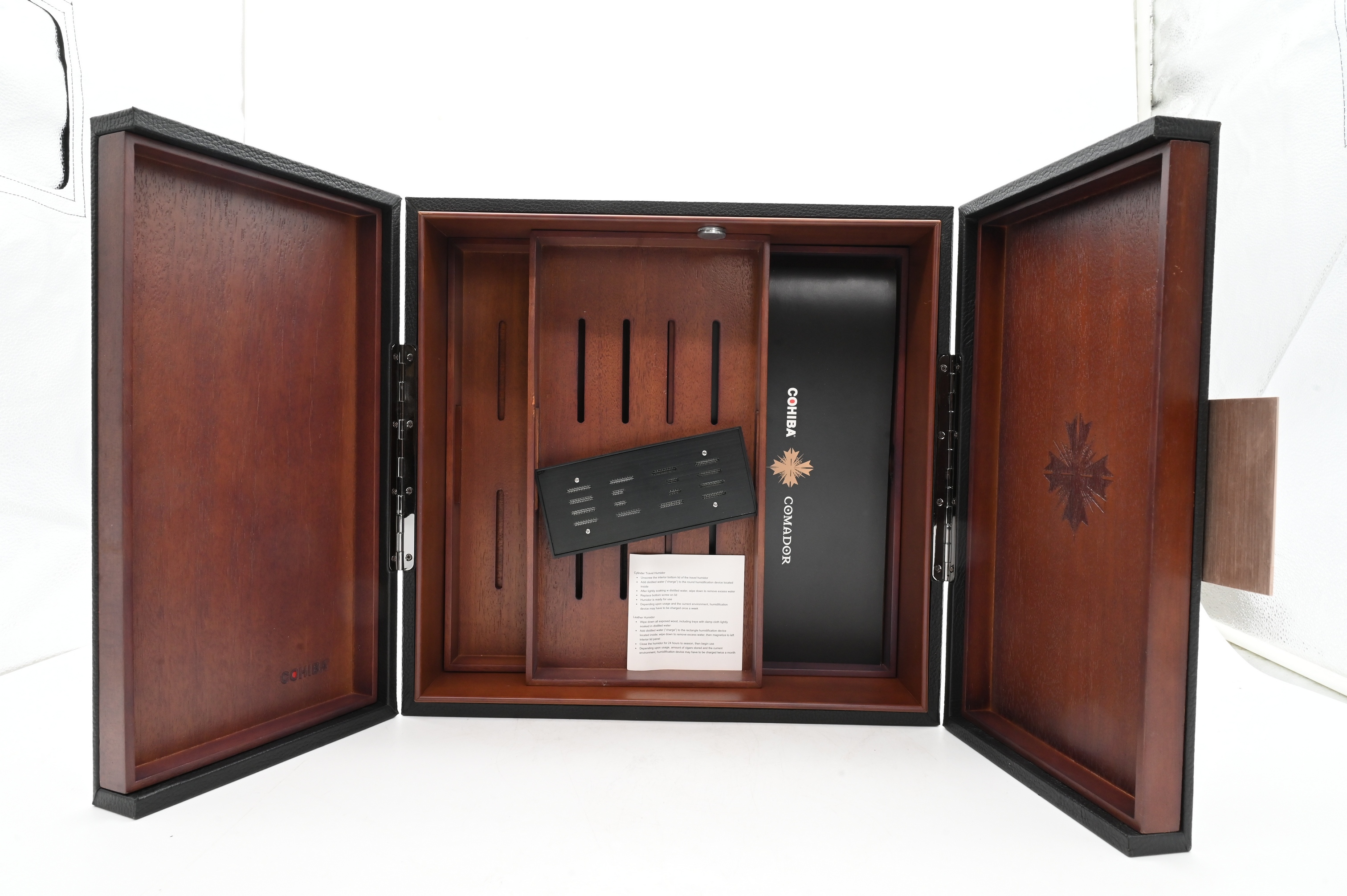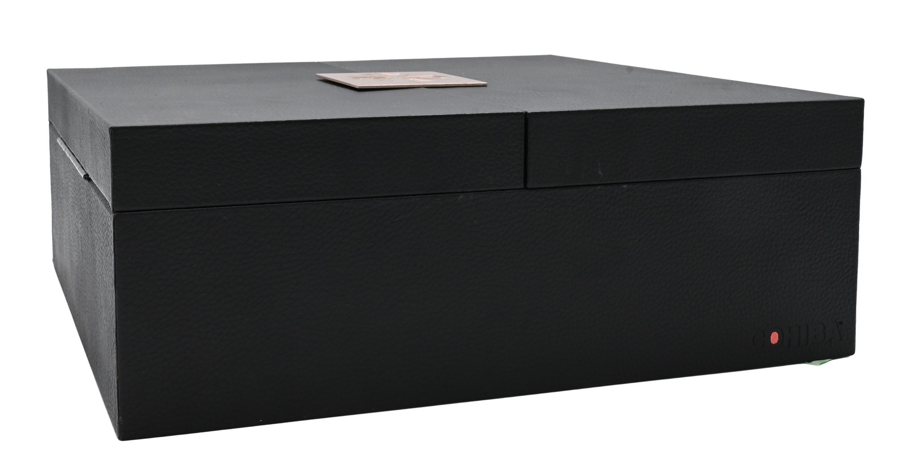 Rectangular case with textured exterior and wood-lined interior, the lid branded “Cohiba,” opening to a fitted interior with removable tray and humidification components.