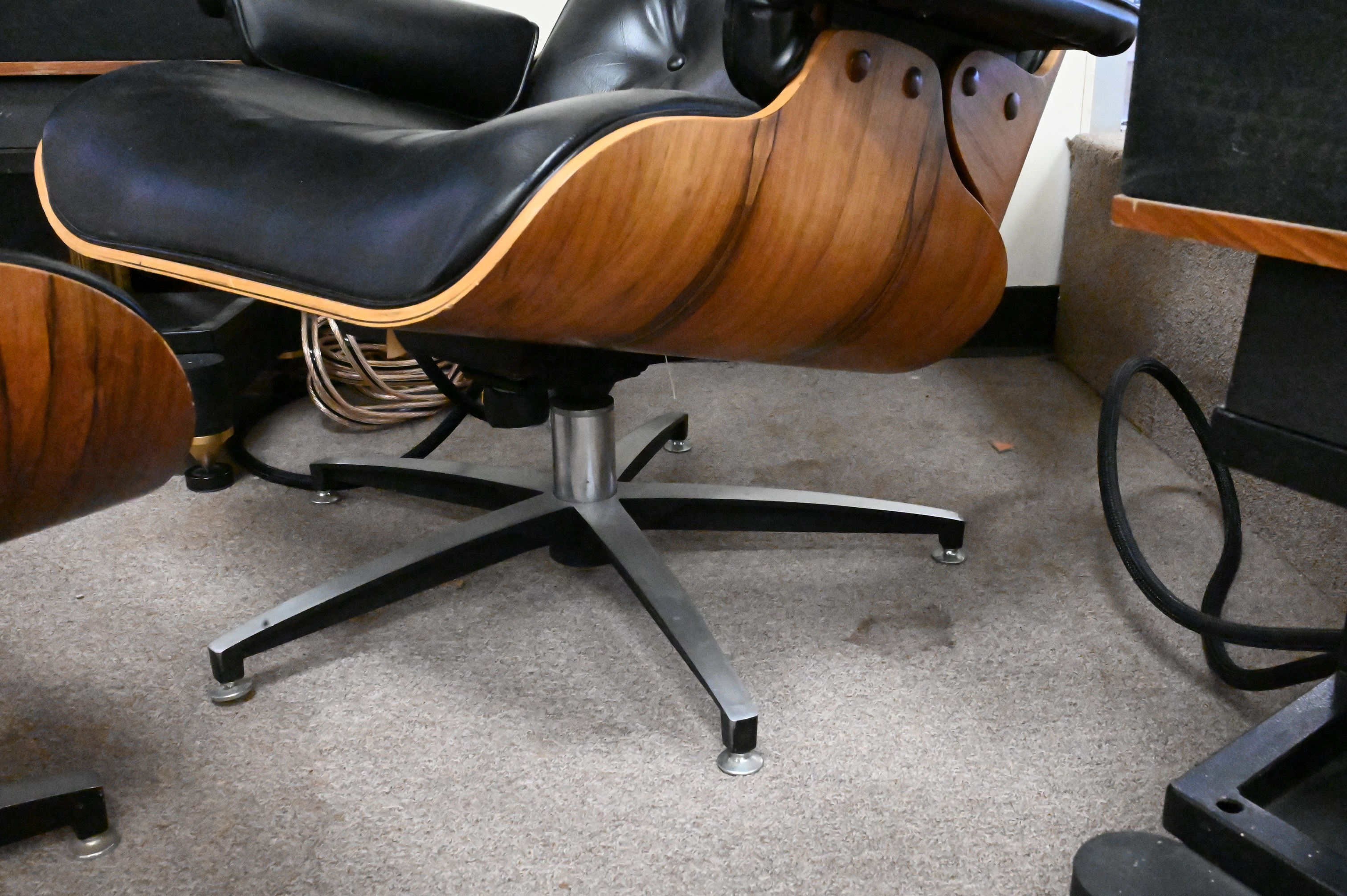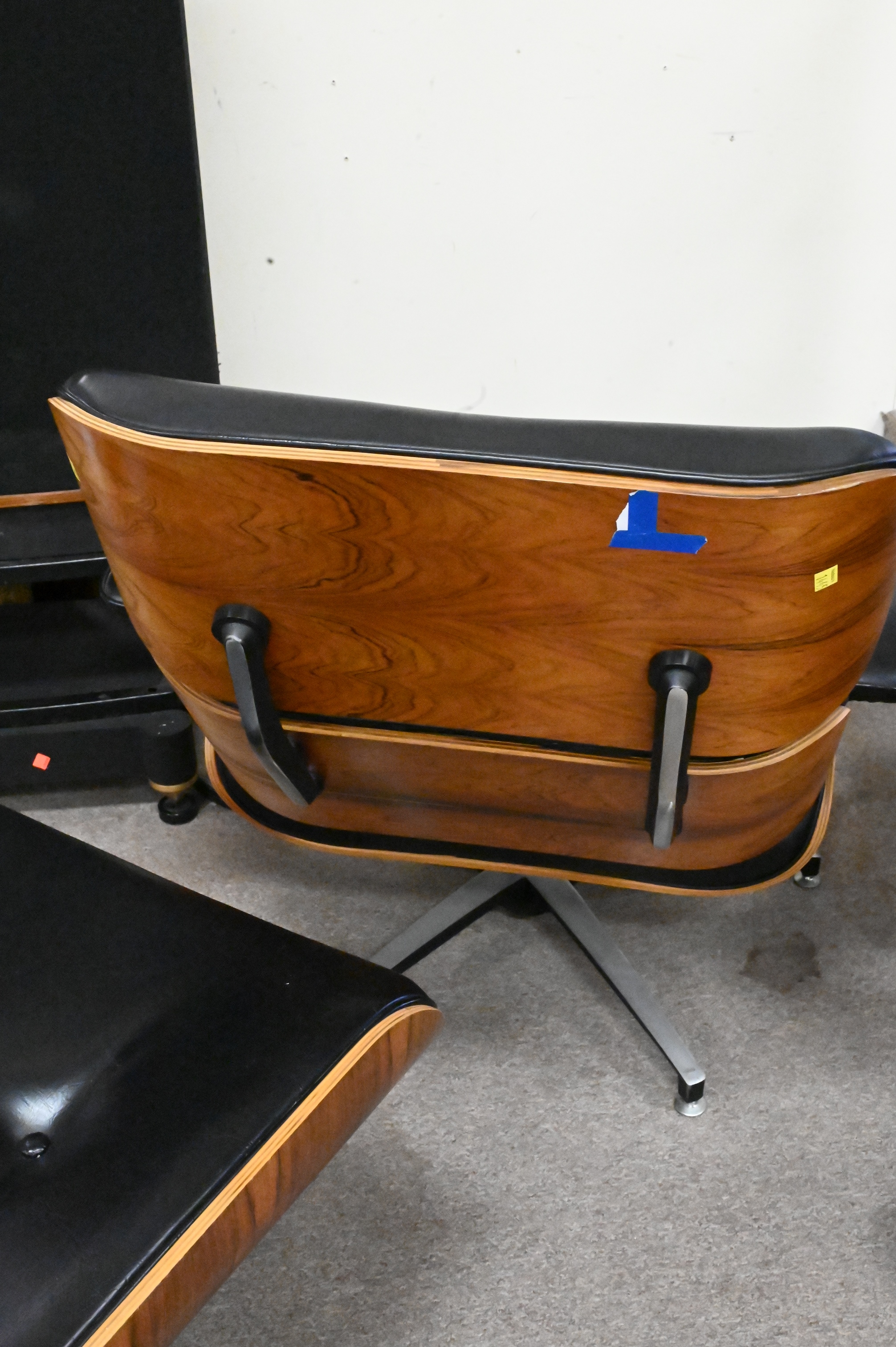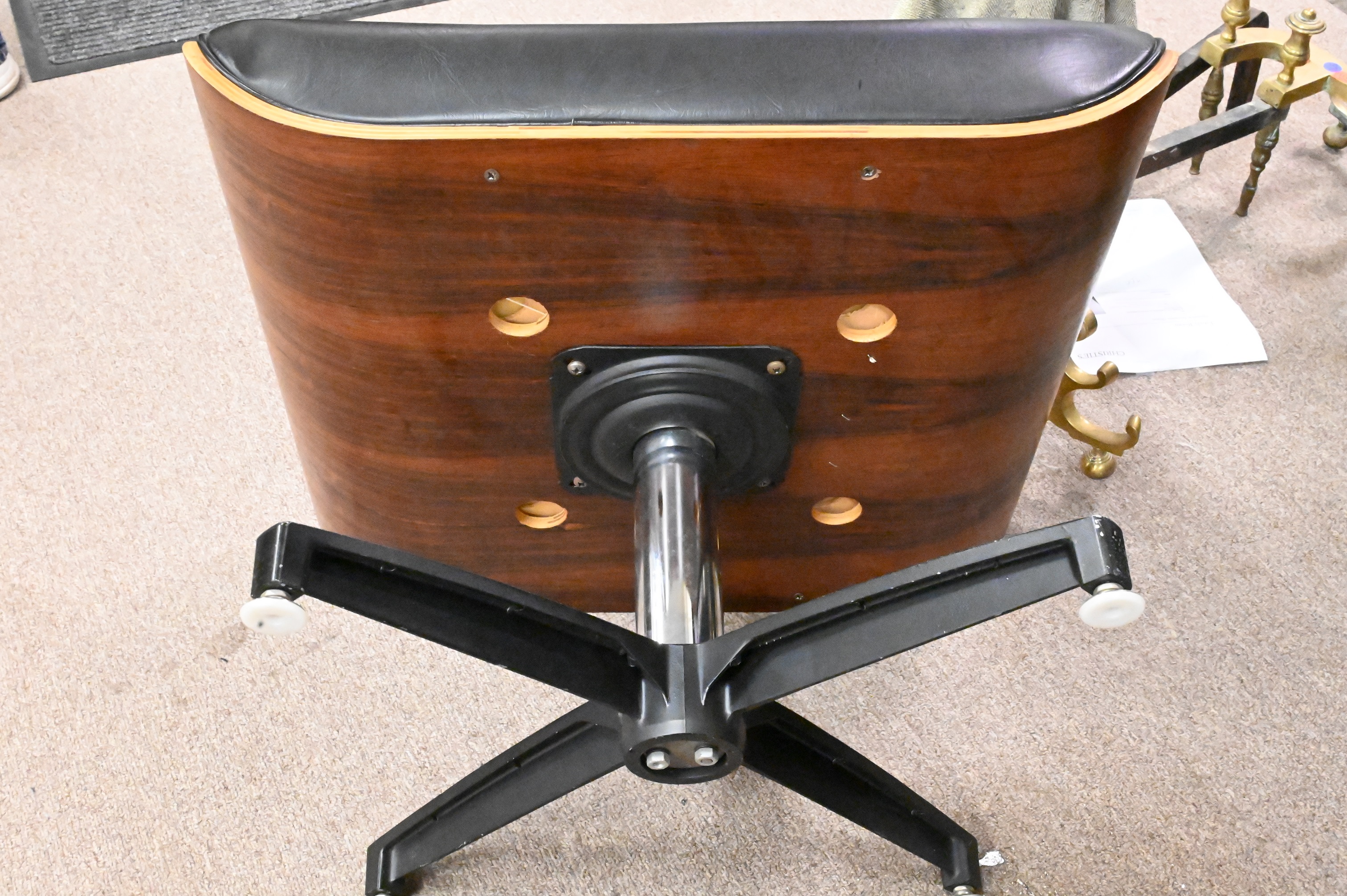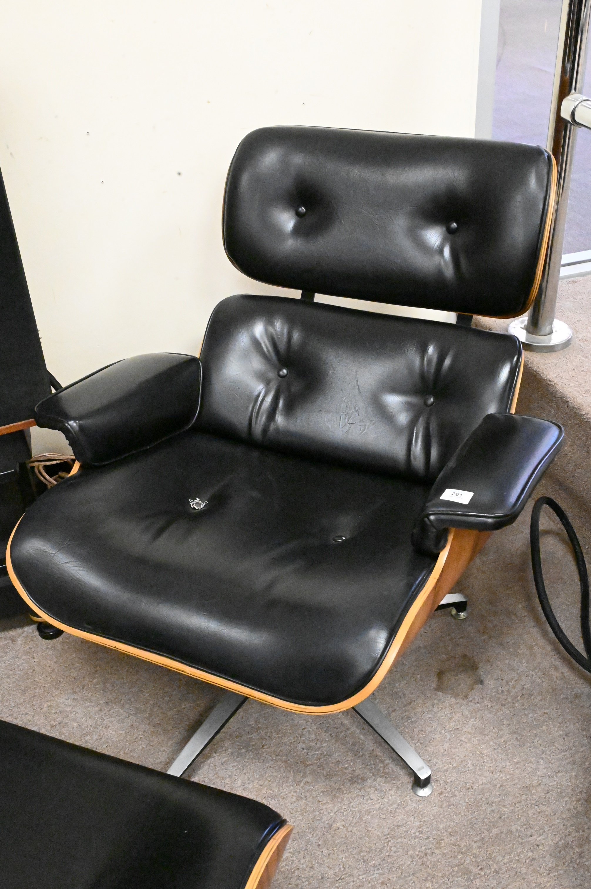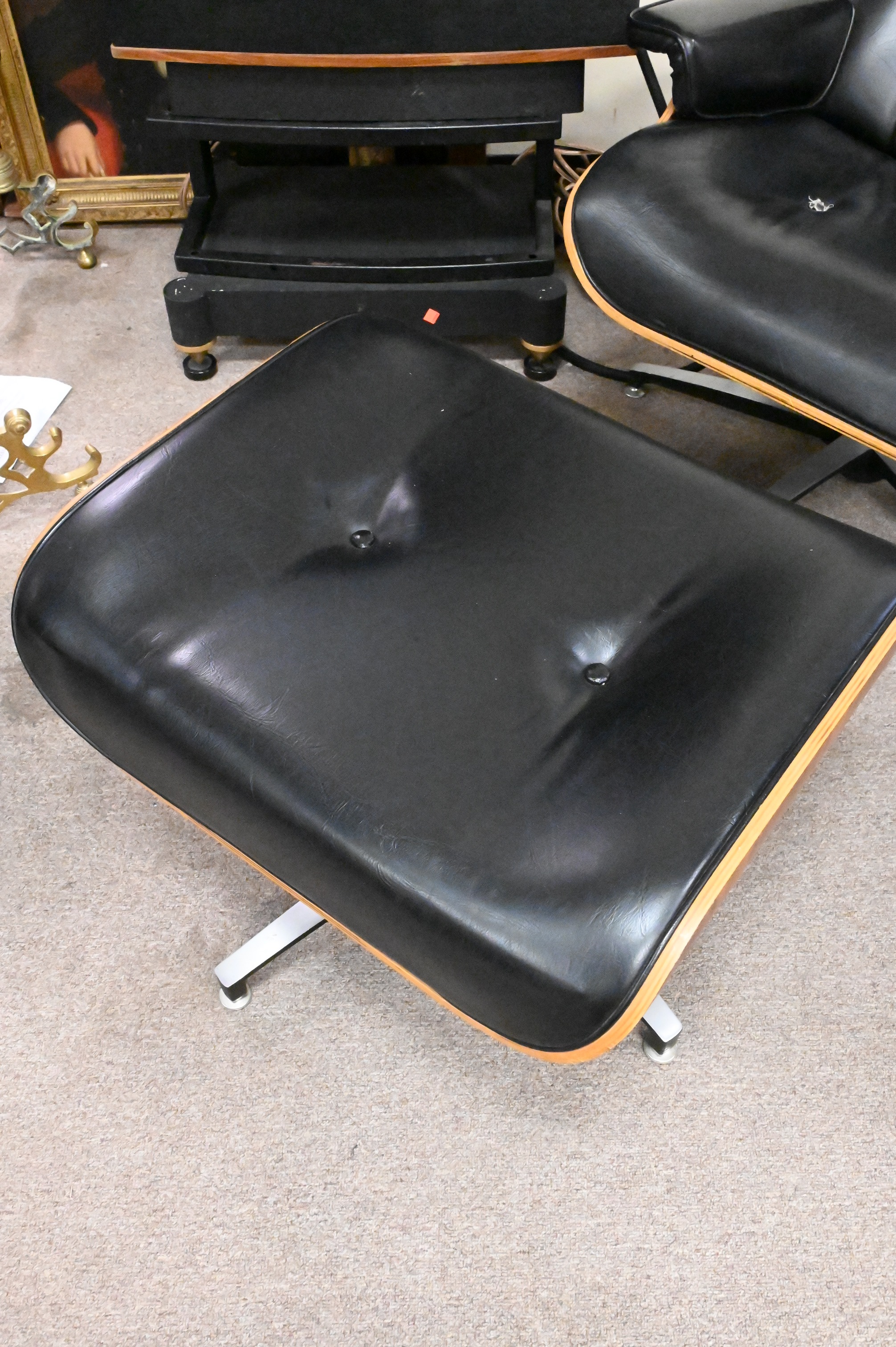 Eames Style Leather Lounge Chair and Ottoman, height 32 1/2 inches, width 32 1/2 inches.